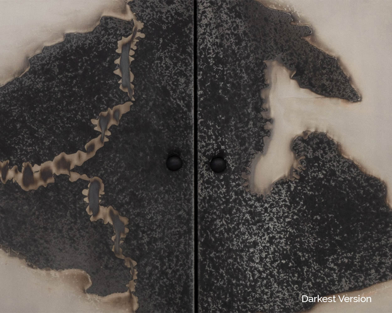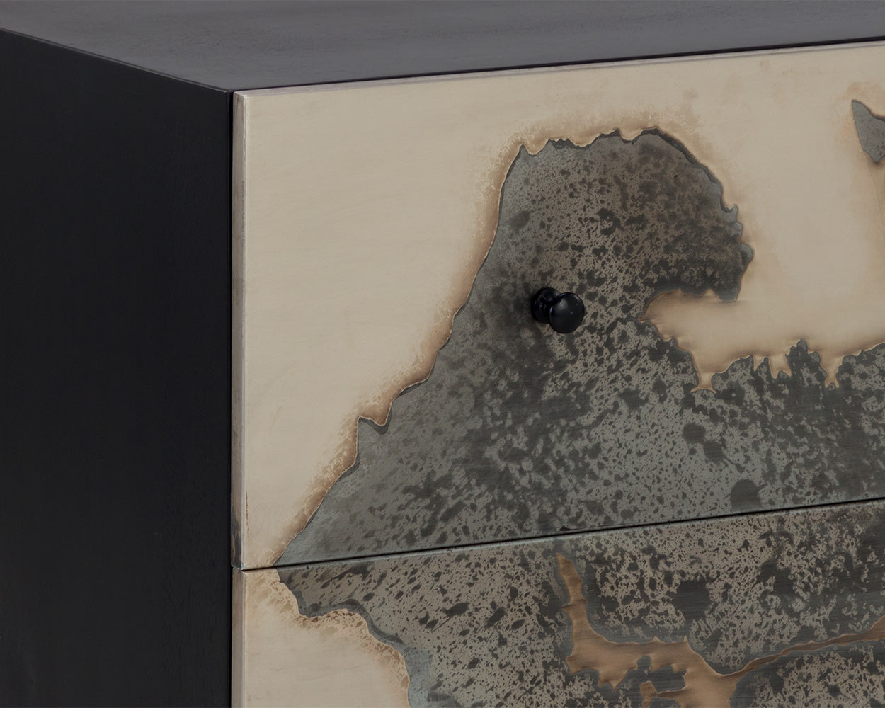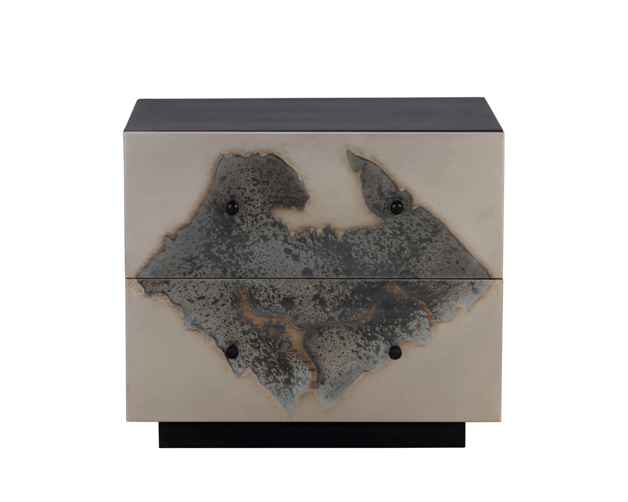 Make a bold statement with this unique nightstand. The drawers feature a one-of-a-kind patina finish, boldly contrasted with a black iron frame. Made in India. With refined craftsmanship, this design was brought to life by skilled local artisans. By nature, these materials develop unique imperfections such as markings and colour variations for a truly one-of-a-kind piece. Pictures shown reflect the lightest and darkest variations of our Arlington patina finish. Actual product may range between these finishes.