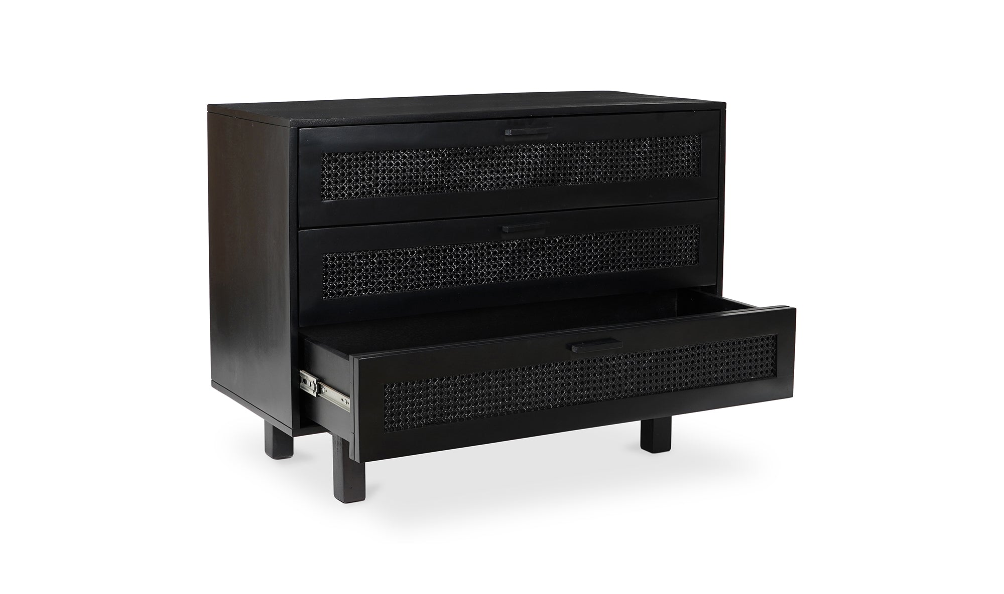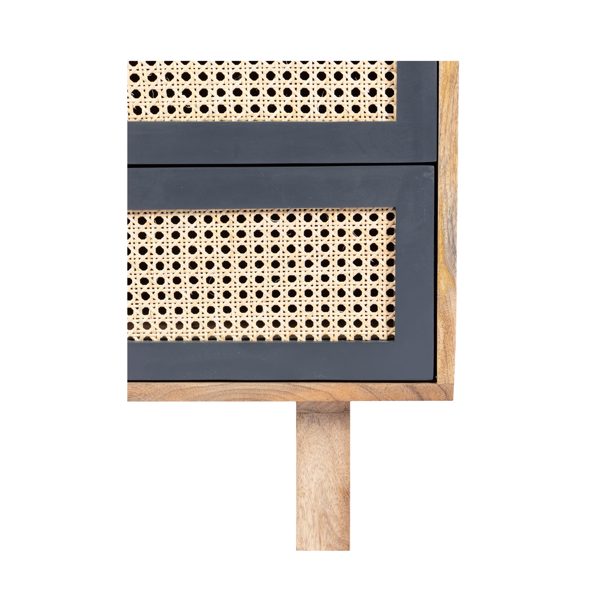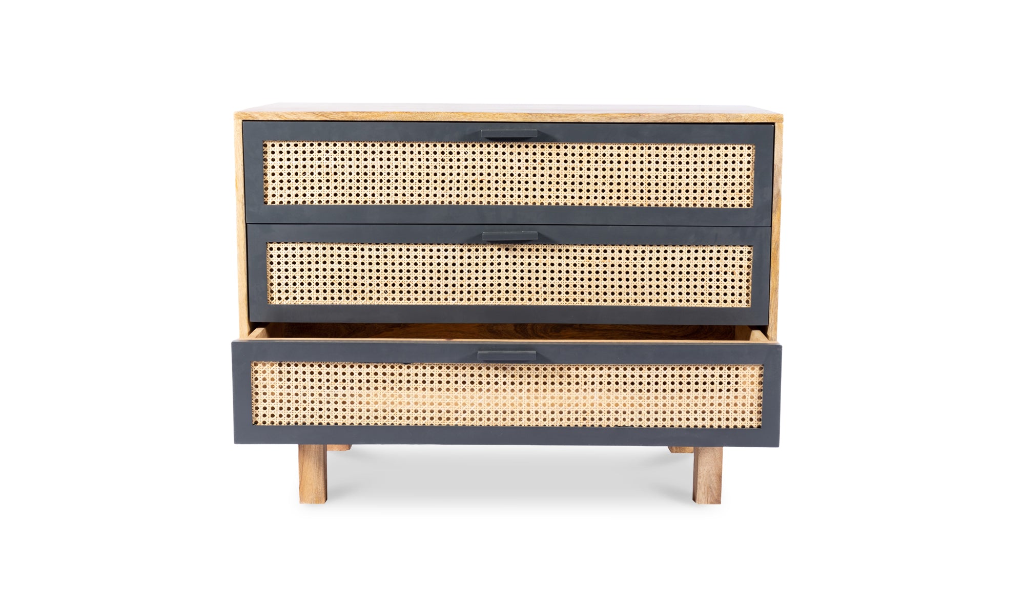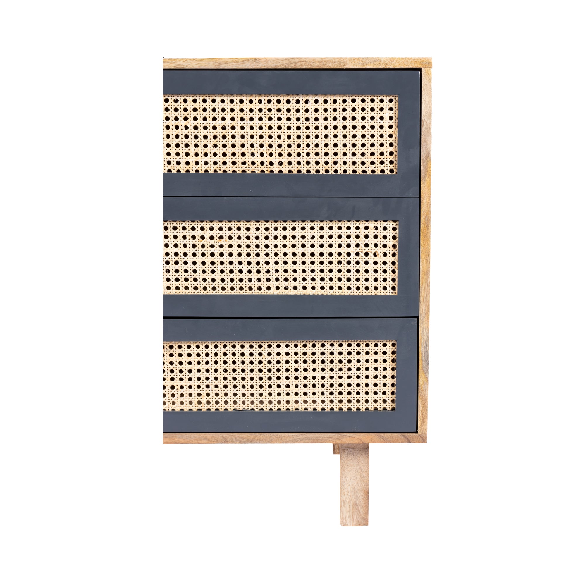 A stylish combination of solid mango wood and an intricately designed cane drawer front gives the Ashton nightstand a fresh contemporary style. Three spacious felt-lined drawers gently slide on ball-bearing glides allowing you to access knickknacks, essentials, and everything in between.