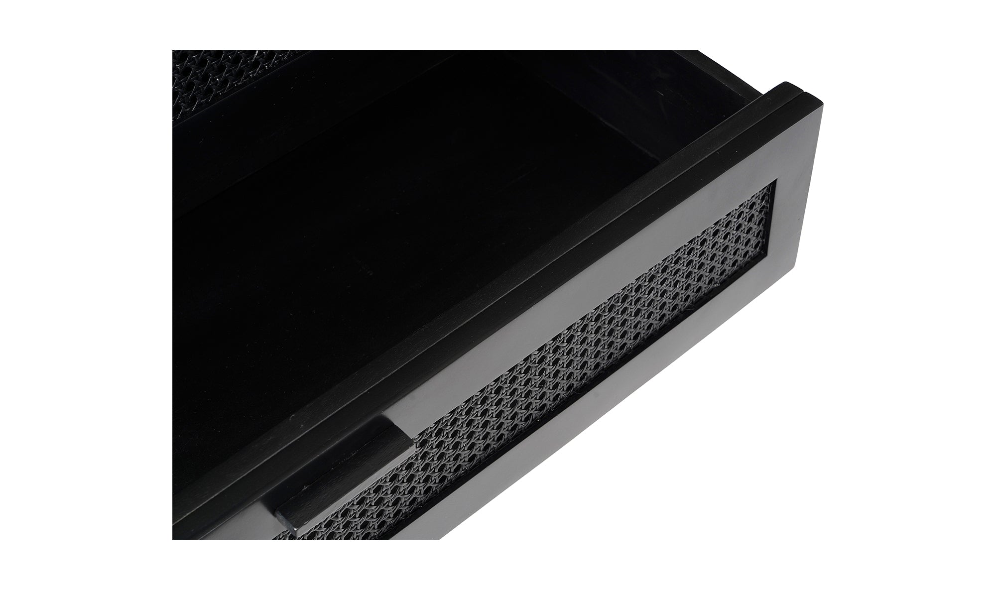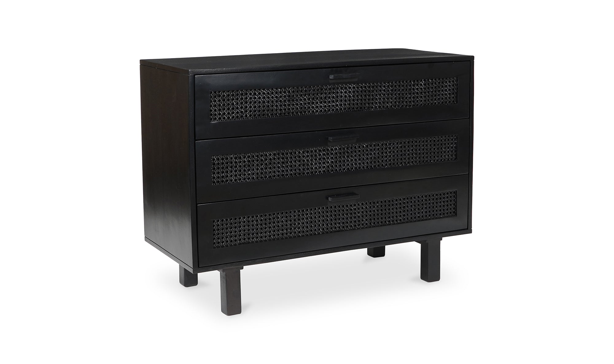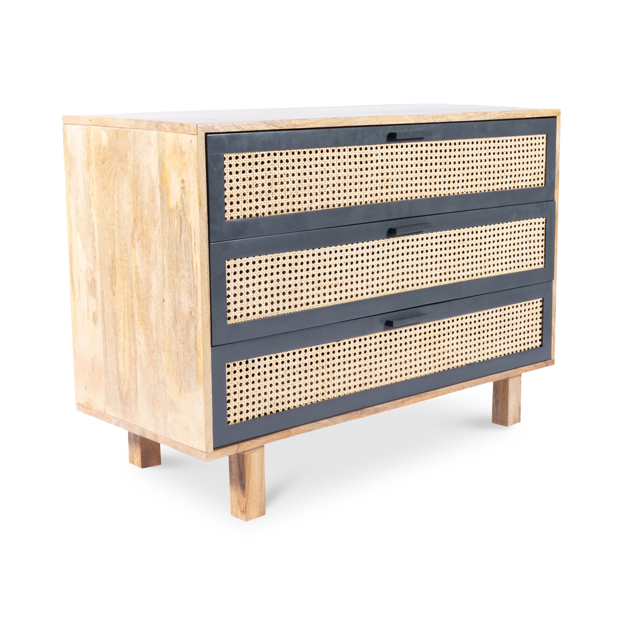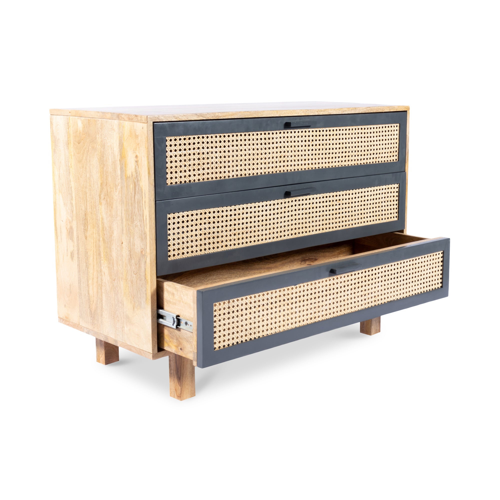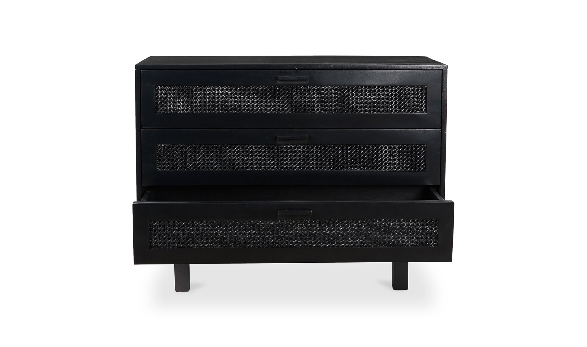 A stylish combination of solid mango wood and an intricately designed cane drawer front gives the Ashton nightstand a fresh contemporary style. Three spacious felt-lined drawers gently slide on ball-bearing glides allowing you to access knickknacks, essentials, and everything in between.