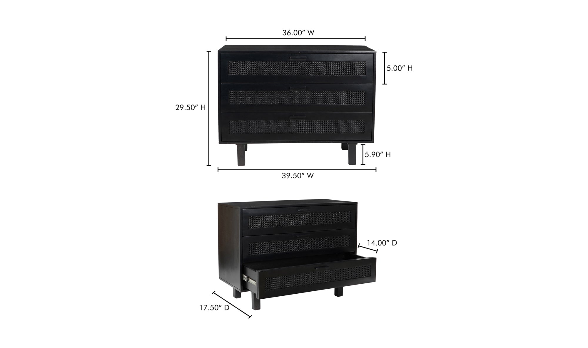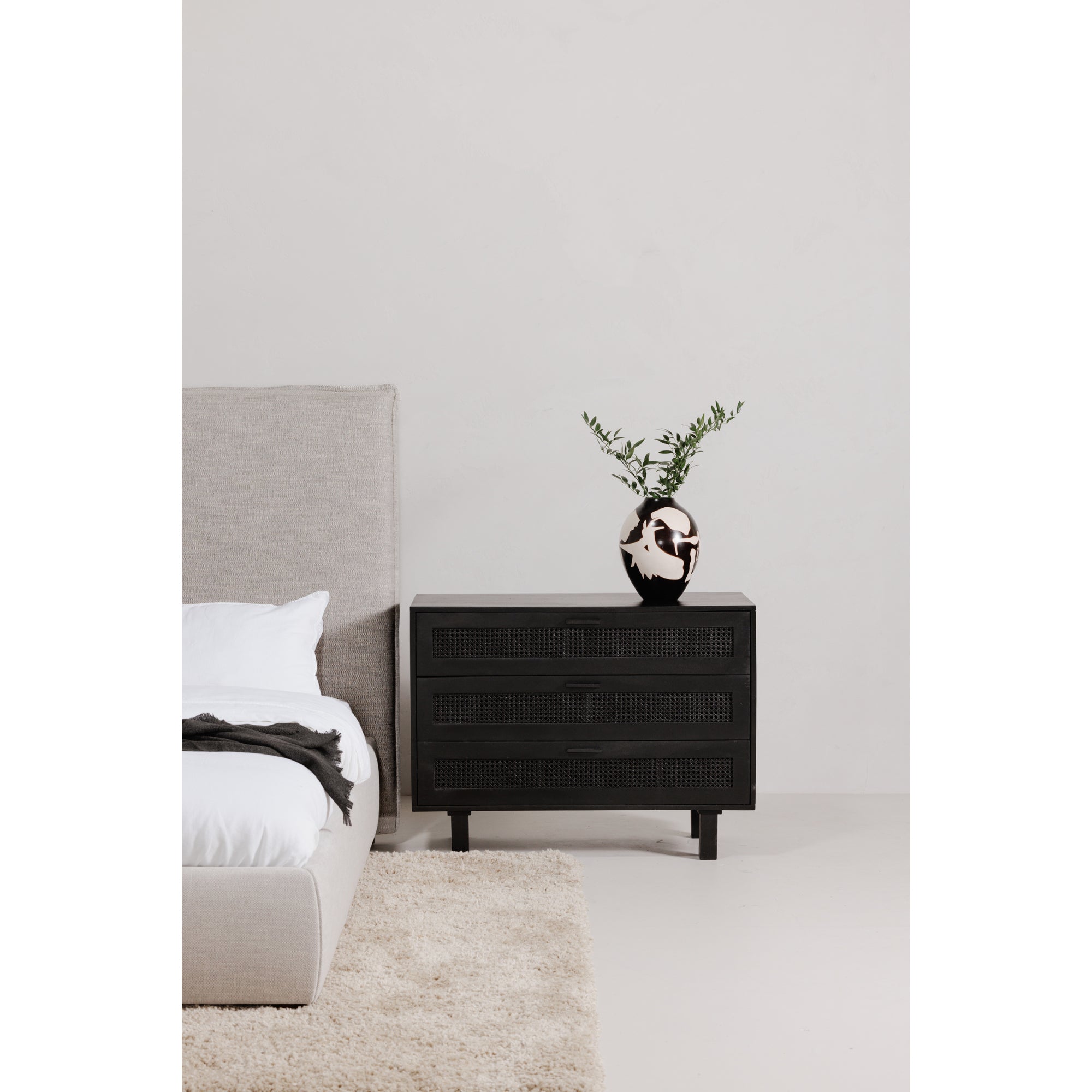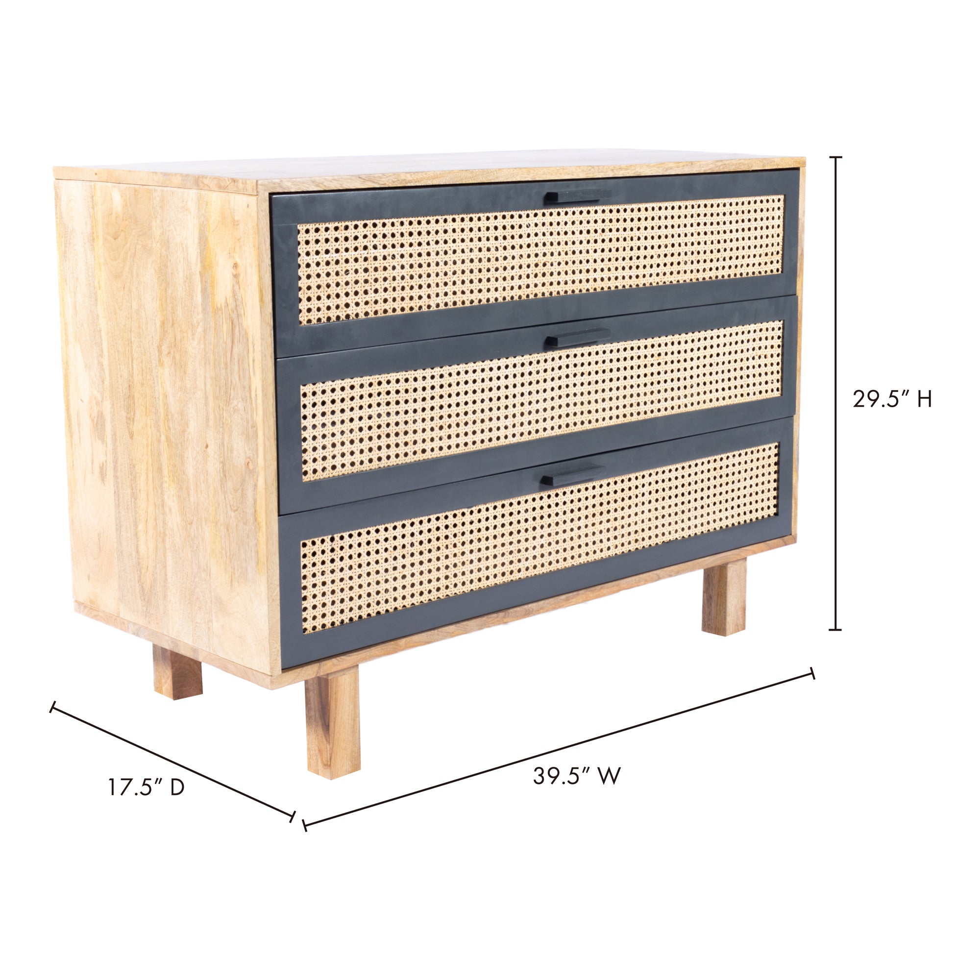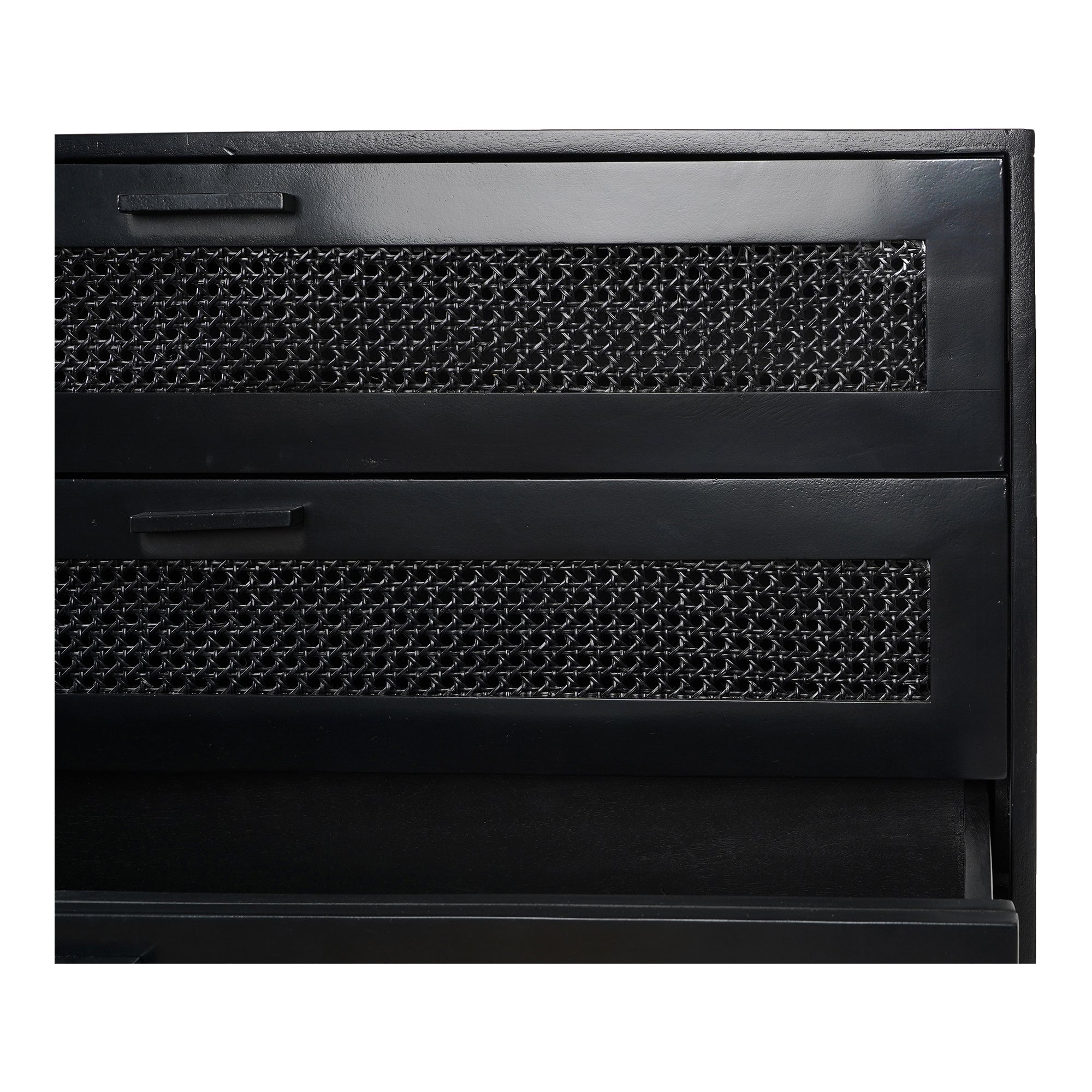 A stylish combination of solid mango wood and an intricately designed cane drawer front gives the Ashton nightstand a fresh contemporary style. Three spacious felt-lined drawers gently slide on ball-bearing glides allowing you to access knickknacks, essentials, and everything in between.