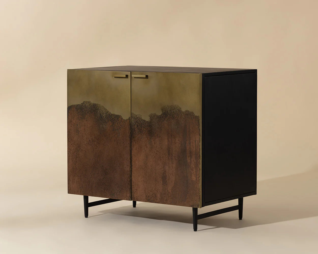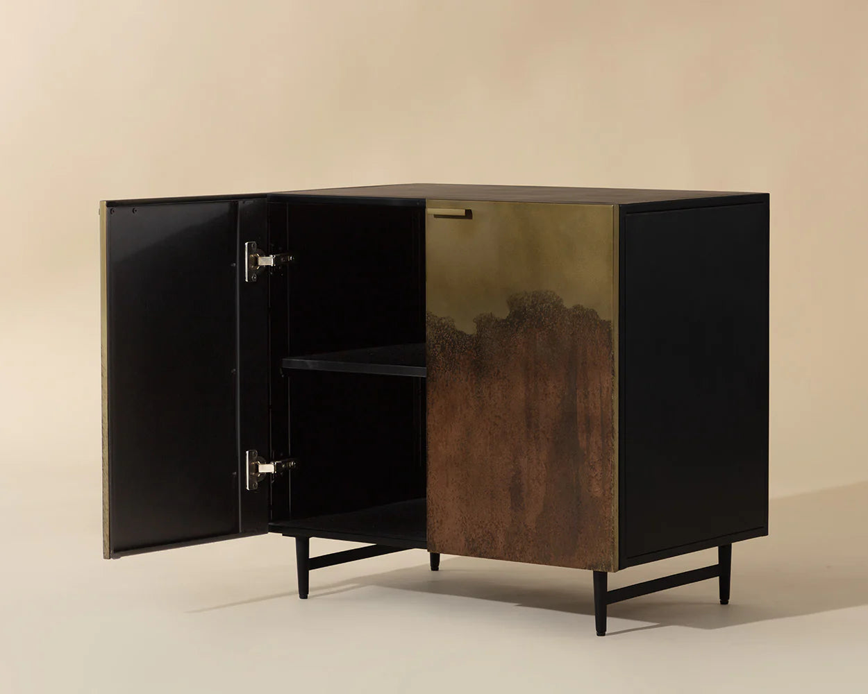 Inspired by global travels, the Auburn Nightstand exudes an exotic vibrance. Characterized by a unique antique brass ombre patina on the front doors. This piece features a cord management opening at the back, allowing it to transform into a small media unit when paired in multiples. Made in India. With refined craftsmanship, this design was brought to life by skilled local artisans. By nature, these materials develop unique imperfections such as markings and colour variations for a truly one-of-a-kind piece.