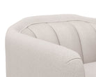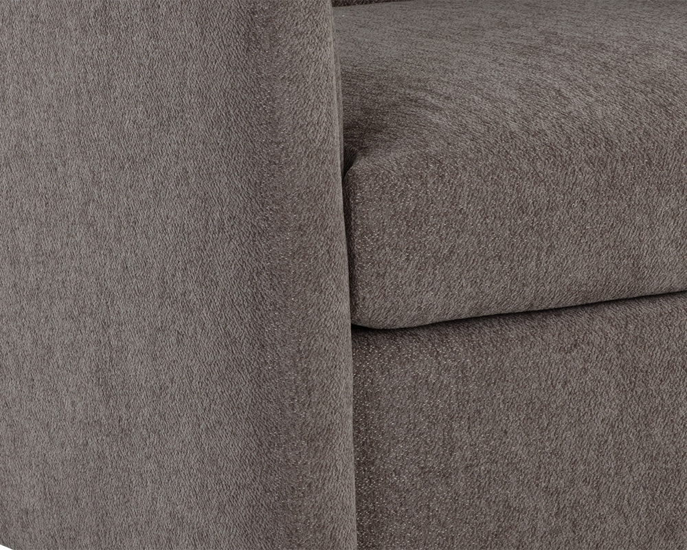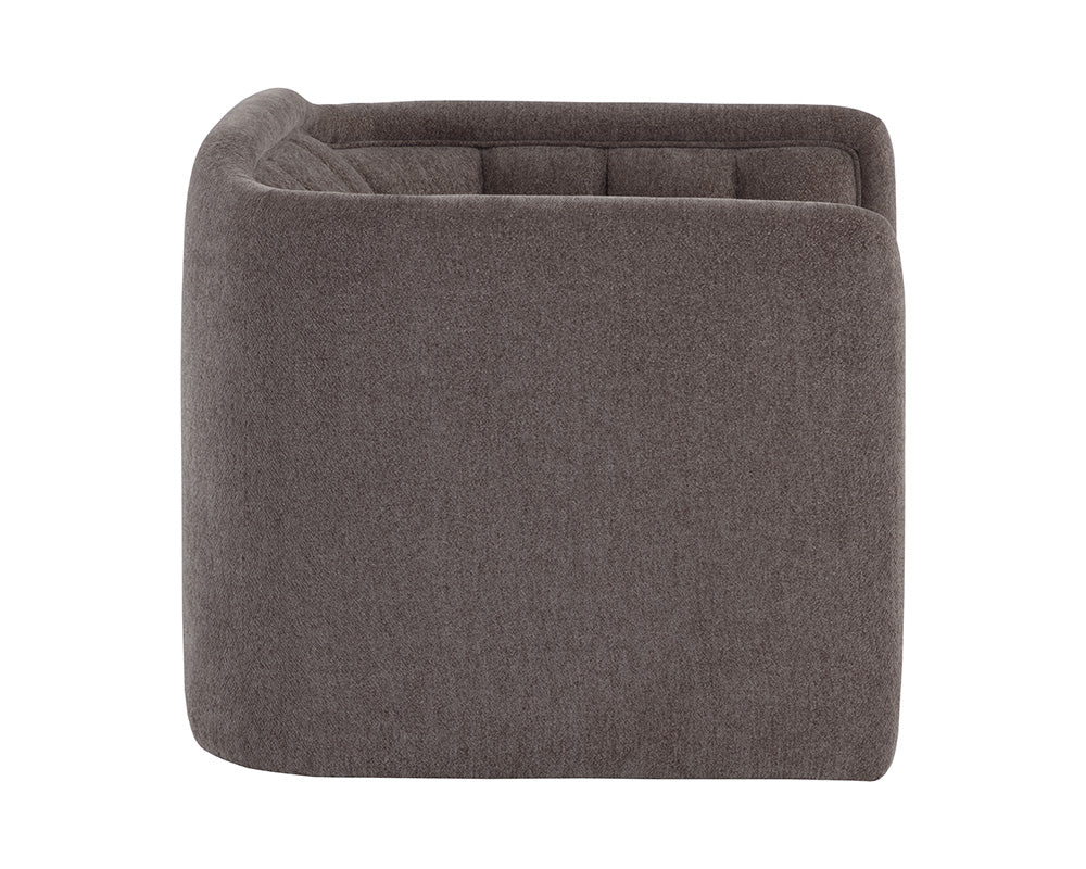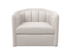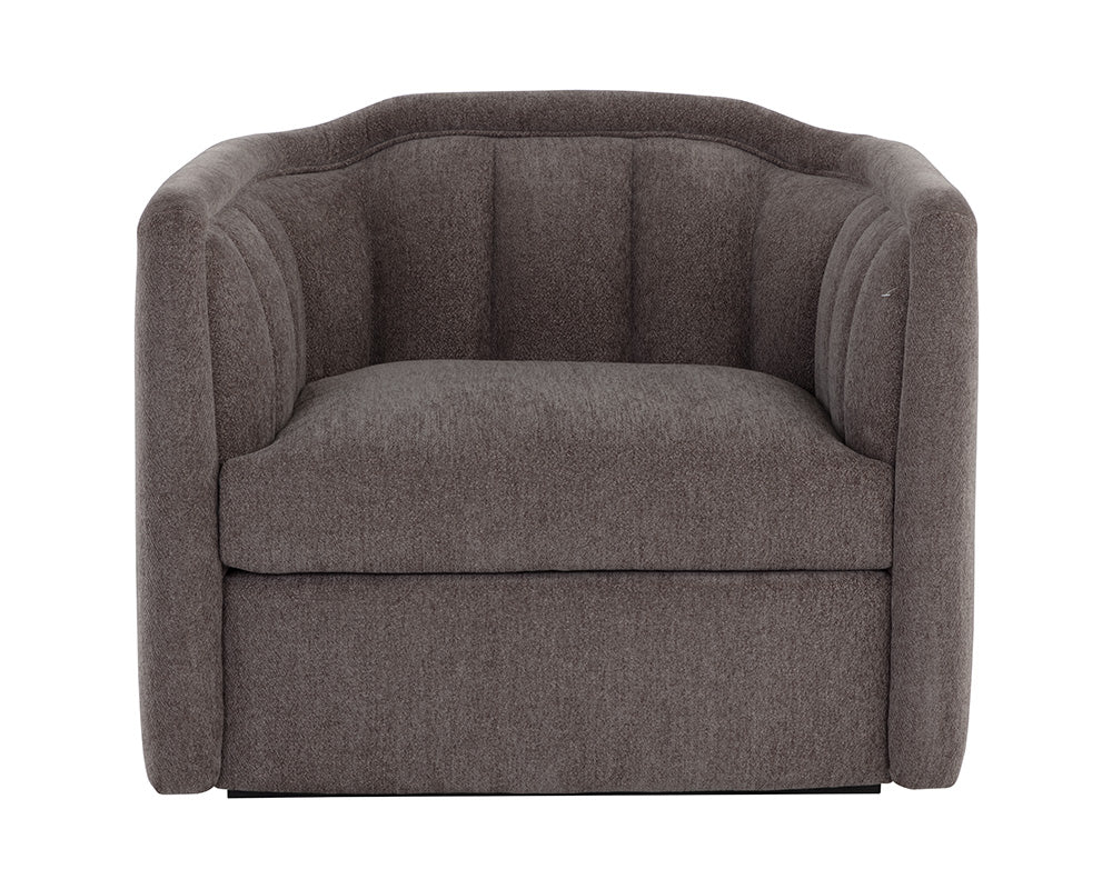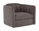 Introduce lavish comfort to any space with this contemporary swivel armchair. Stocked in alaska greige performance fabric and alaska hedgehog brown performance fabric. Features vertical tufting on the interior. Completed with a wooden frame and base. Coordinating sofa also available. Performance fabric is moisture repellent, durable and easy to clean.