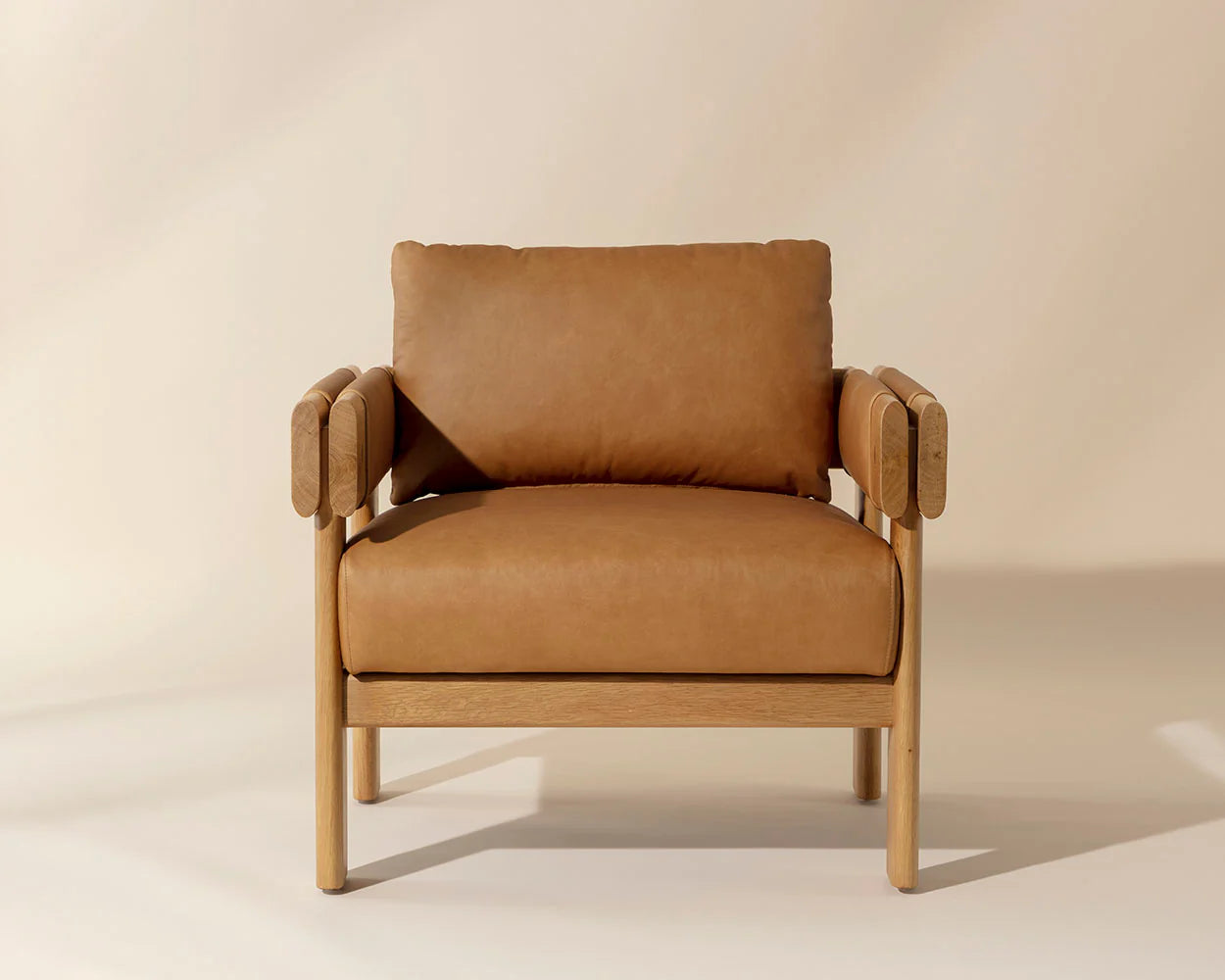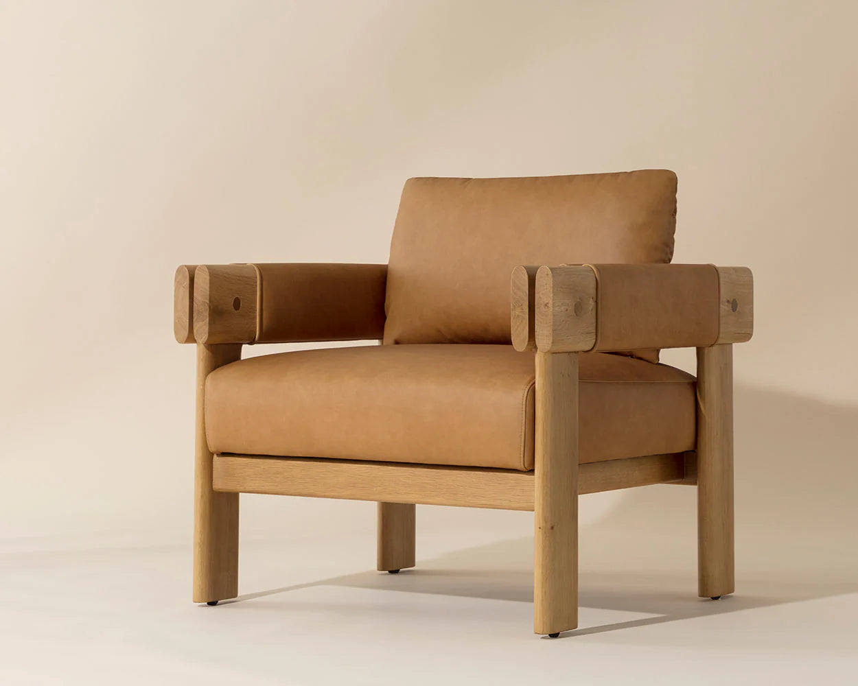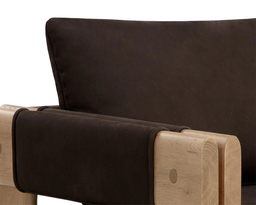 Crafted from natural materials, the Carmichael Lounge Chair adds an inviting atmosphere to any room. The beautiful characteristics of rustic oak wood and ludlow sesame leather are emphasized through the chair's double armrest design. As wood is an organic, porous material, these pieces will contain natural variation of texture and may also exhibit fine indentations and cracks. Wood pieces will also display a disparity of colour and grain, and visible knots and burls that add to the character of each piece. Handle with Care: This design has been crafted with 100% leather. Leather is a natural material; as such, colour variations, markings, wrinkles, grooves and light scratches are acceptable and appreciated characteristics. No two pieces are alike. Visit our Product Care page for more information on how to ensure the lasting beauty of this piece.