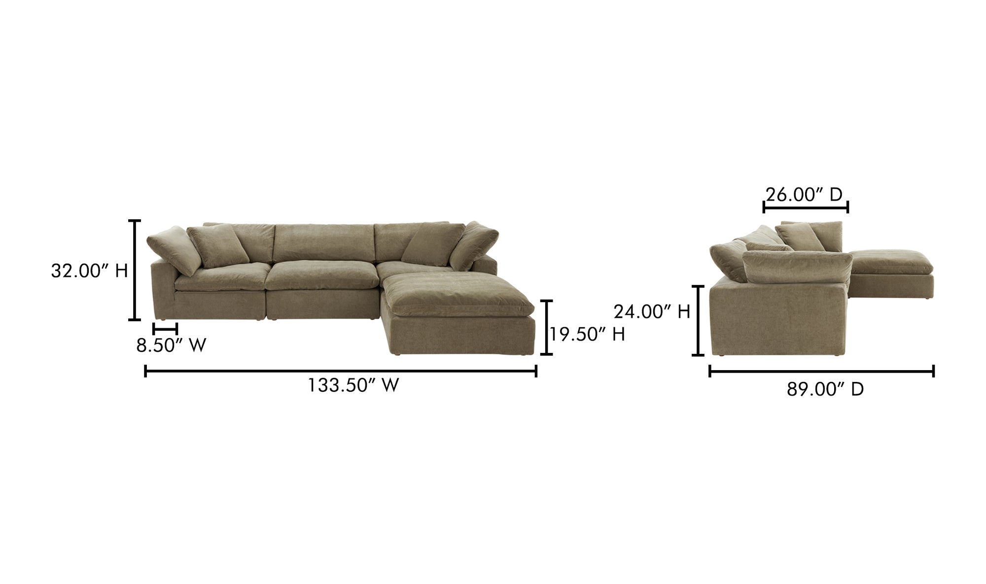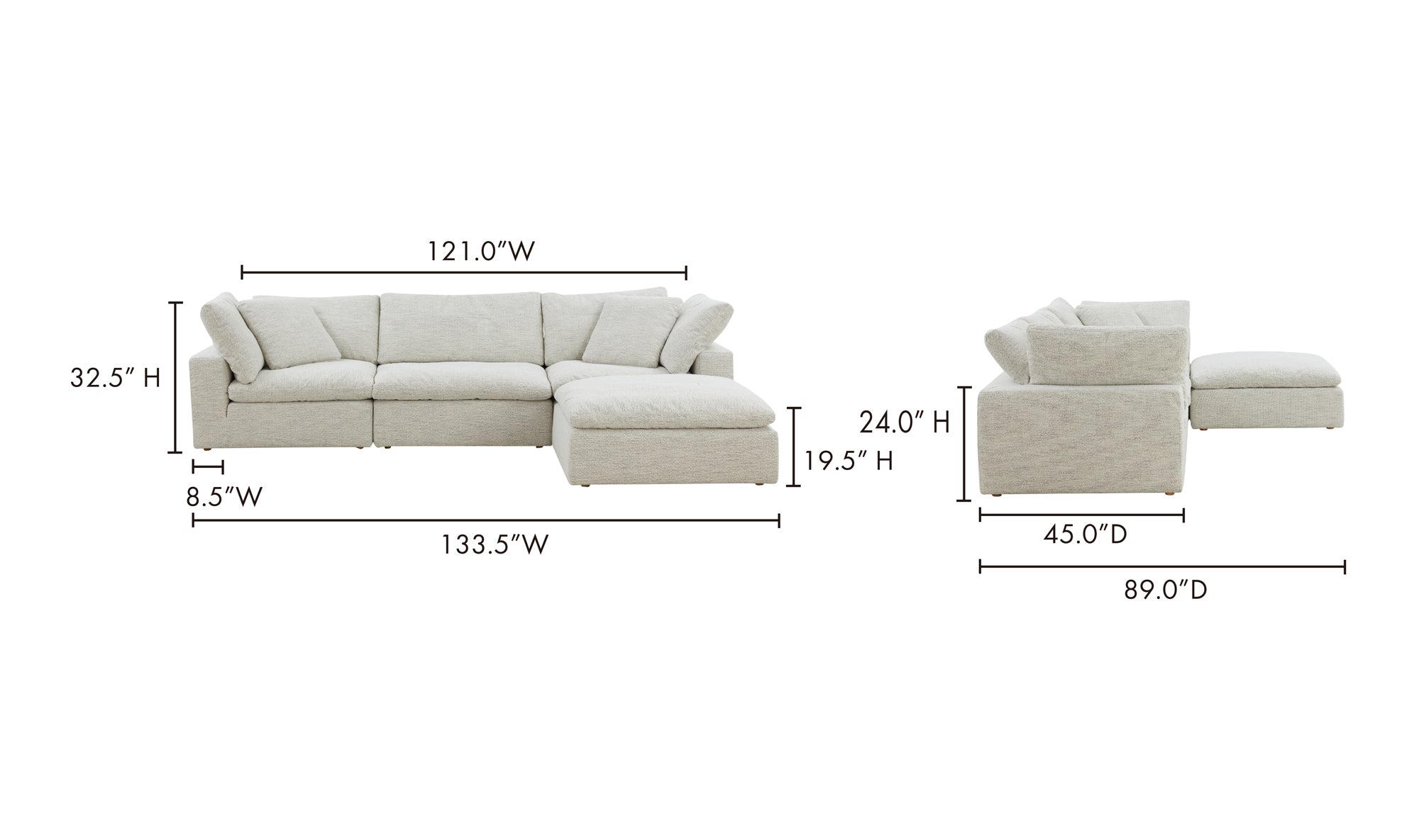 Consists of 4 modular parts: 2 corner, 1 slipper & an ottoman for easy switch around
