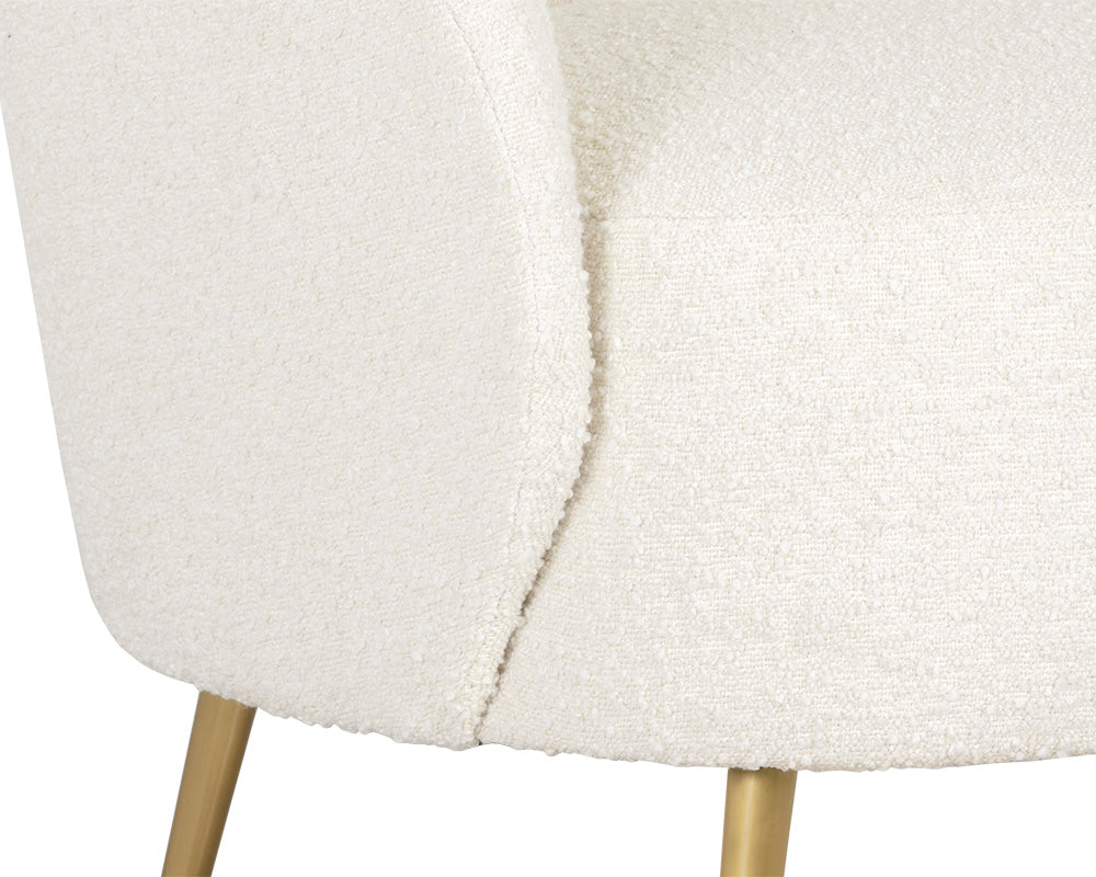 A stunning lounge chair designed with a bold, sculpted frame. Upholstered in altro white boucle fabric. Tapered stainless steel legs in a gold finish complete the look. Perfect for contemporary and modern environments.