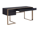 A distinctly modern desk crafted from German oak wood veneer featuring a black finish and unique wood grain. A stunning brushed antique brass steel frame completes the look. Three drawers provide additional storage. Suitable for both contract and residential environments.