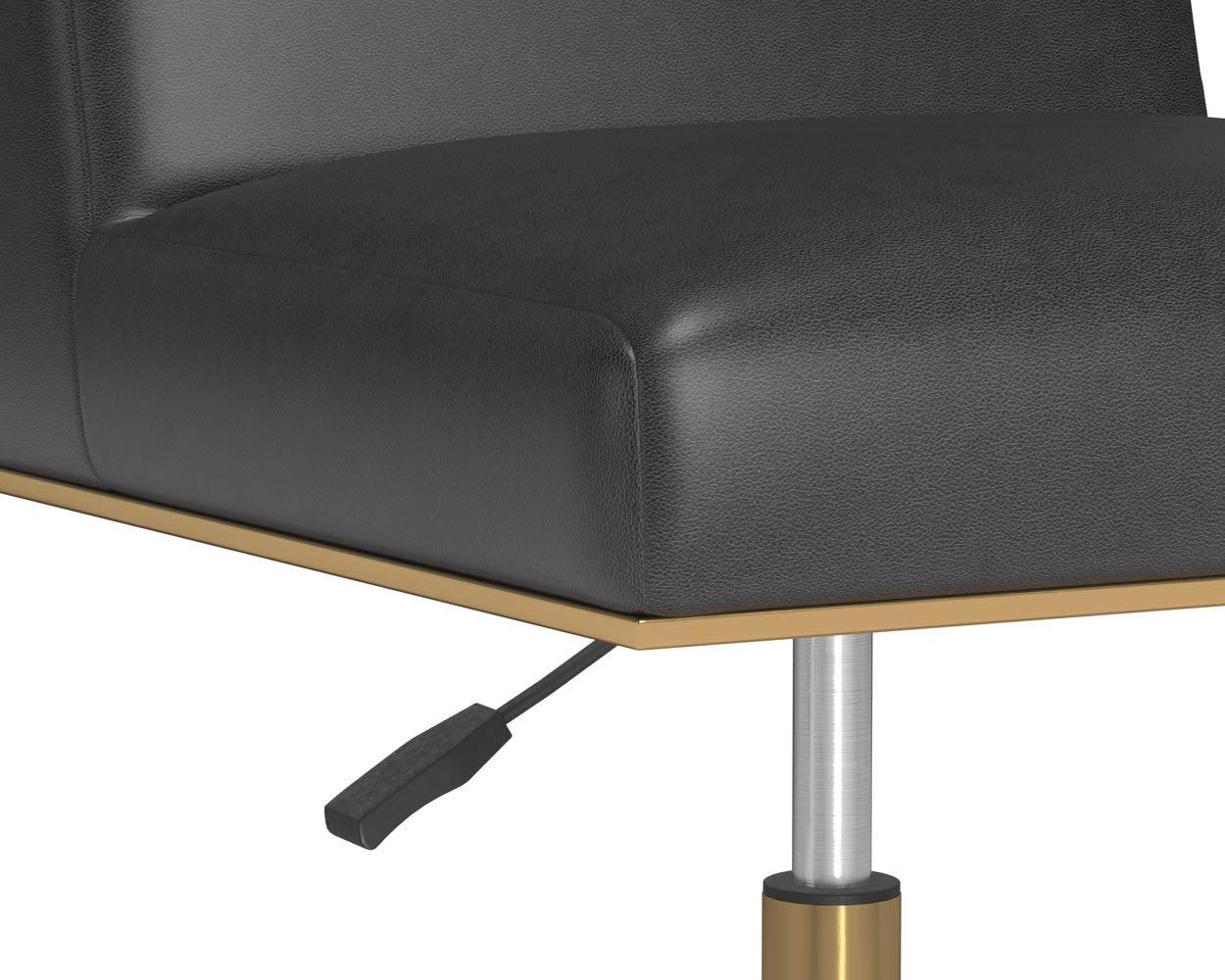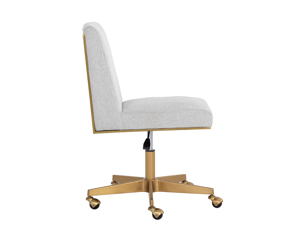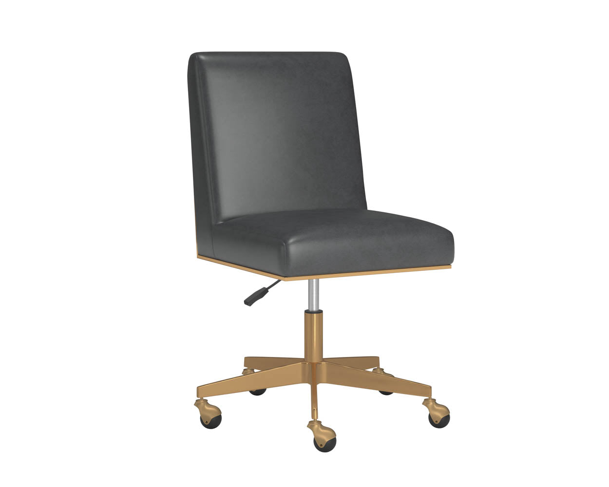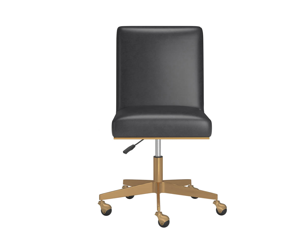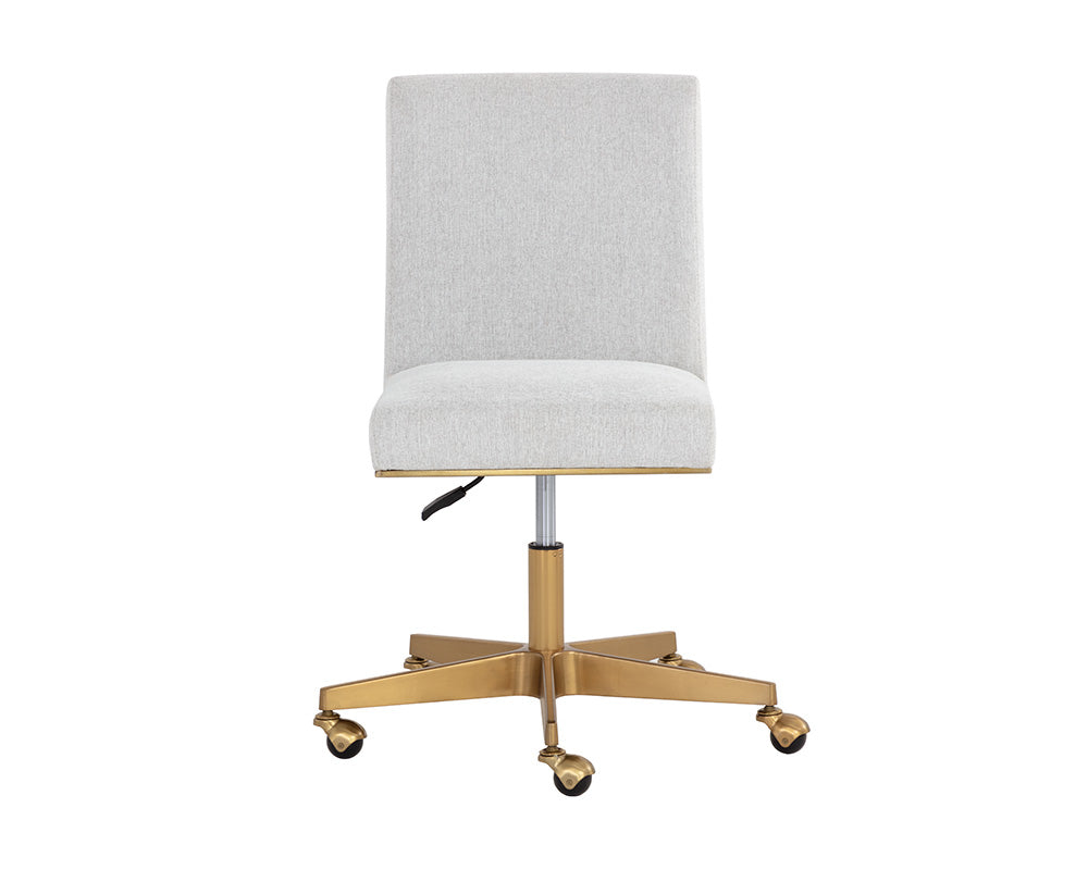 Stunning from all angles, this office chair features a streamlined silhouette for an effortlessly modern design. Stocked in bravo portabella faux leather, ernst silverstone fabric and meg ivory fabric. Completed with a brushed brass powder coated stainless steel base with added castors for mobility. Also available in ernst silverstone and meg ivory fabrics. Handle With Care: This design has been crafted with faux leather. Faux leather is manufactured to reflect the natural characteristics of leather; as such, colour variations, markings, wrinkles, grooves, and light scratches are appreciated characteristics. No two pieces will be alike. Visit our Product Care page for more information on how to ensure the lasting beauty of this piece.