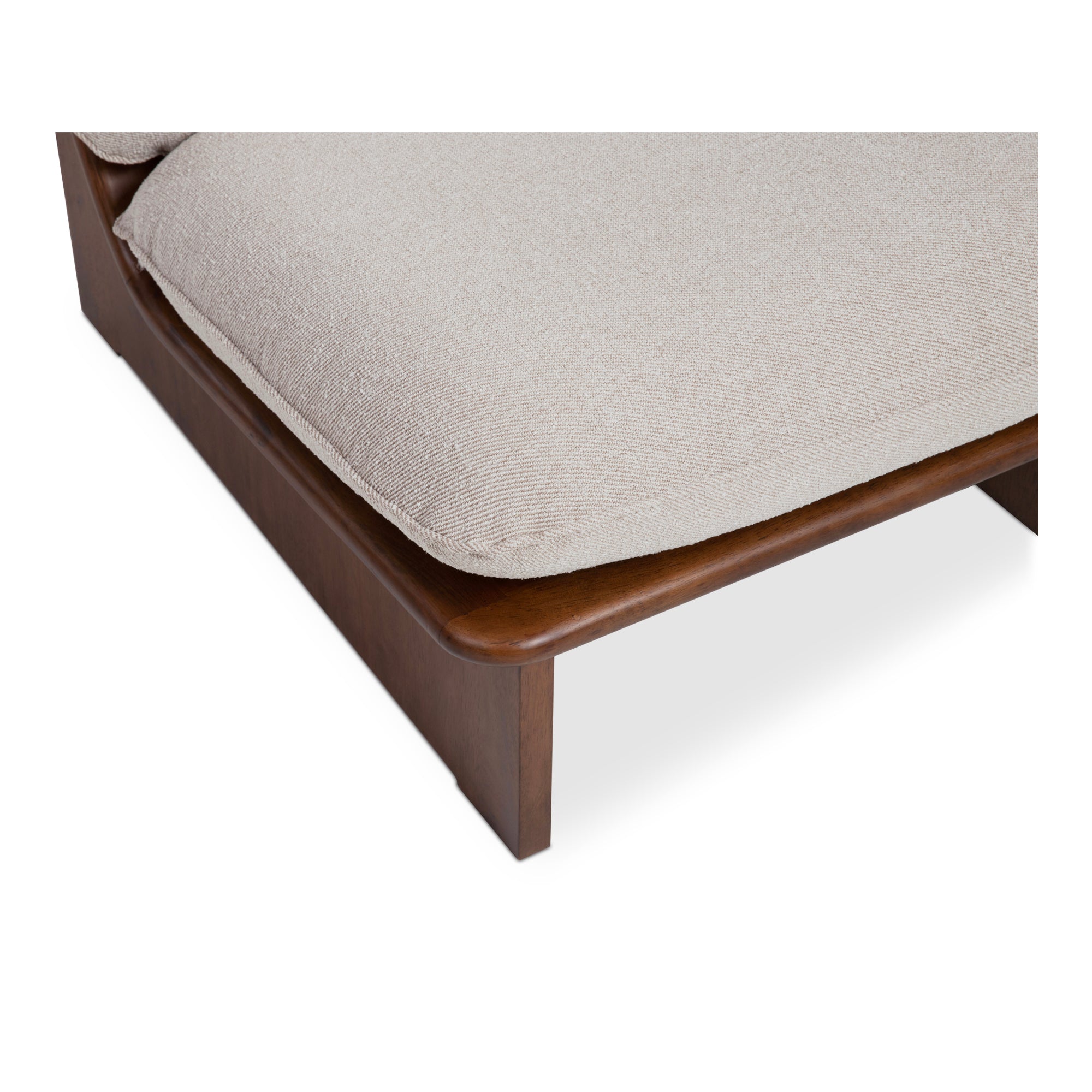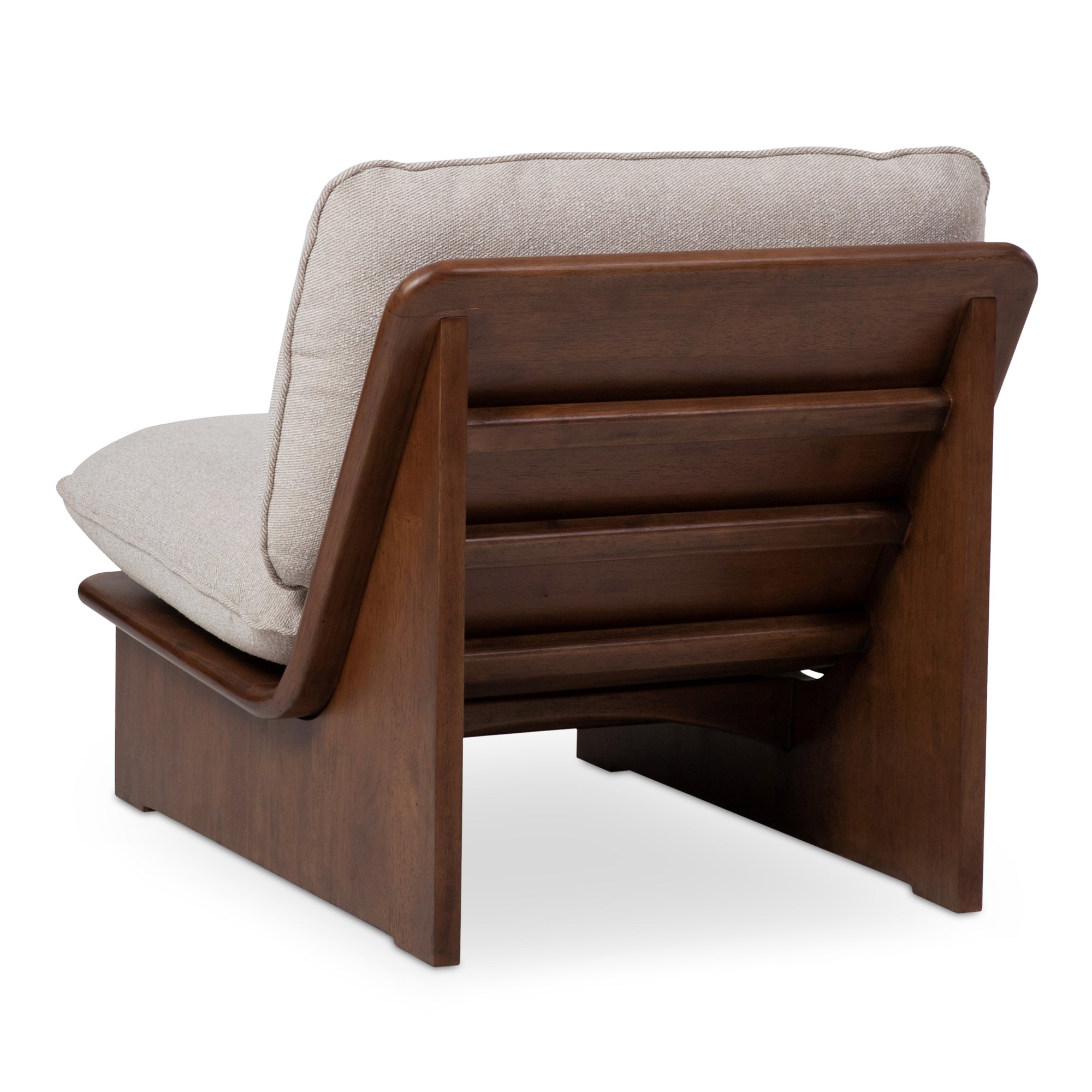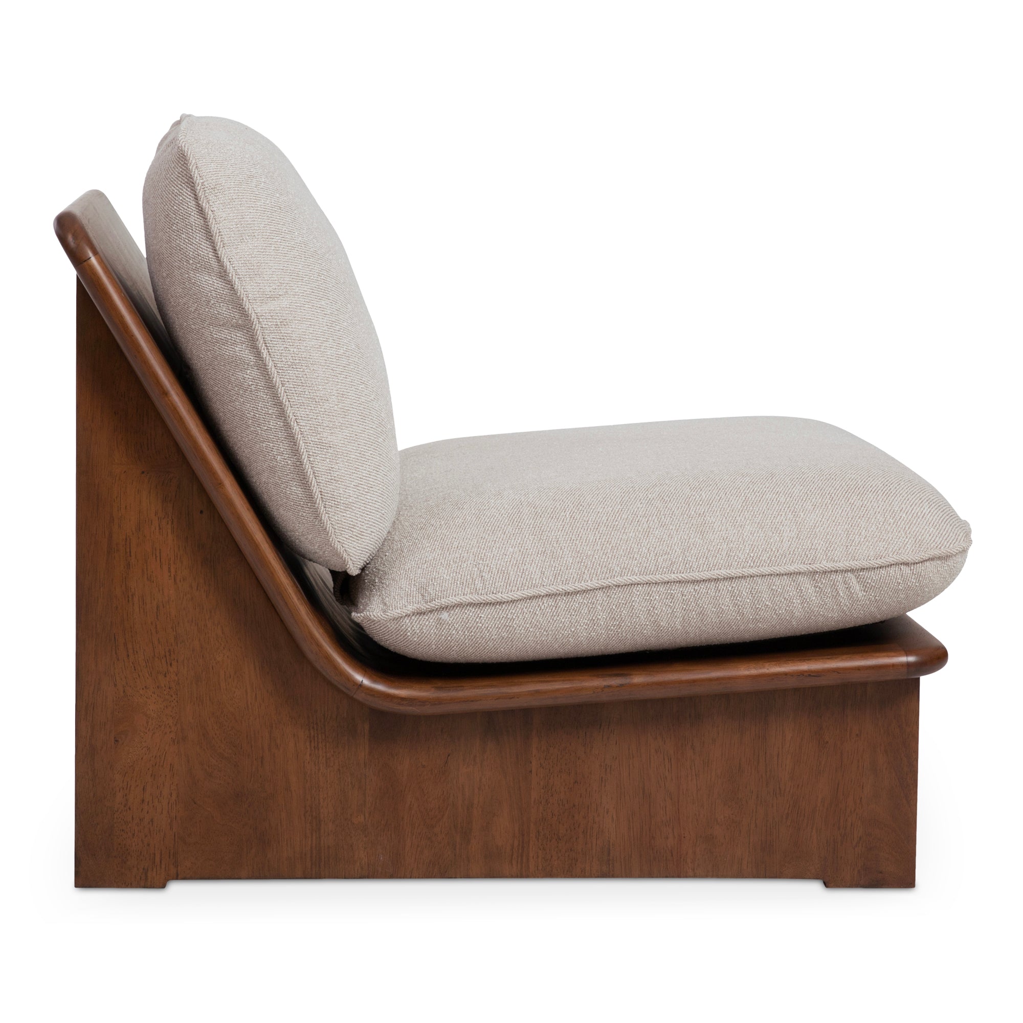 The Edwin accent chair is rich with 70s influence with its armless and low-slung profile. A harmonious blend of warm, textured neutrals and organic materials, the seat is upholstered in sumptuous fabrics over a wood frame, adding an element of natural sophistication, perfectly complementing its understated elegance.