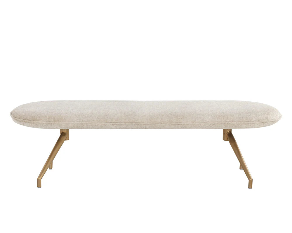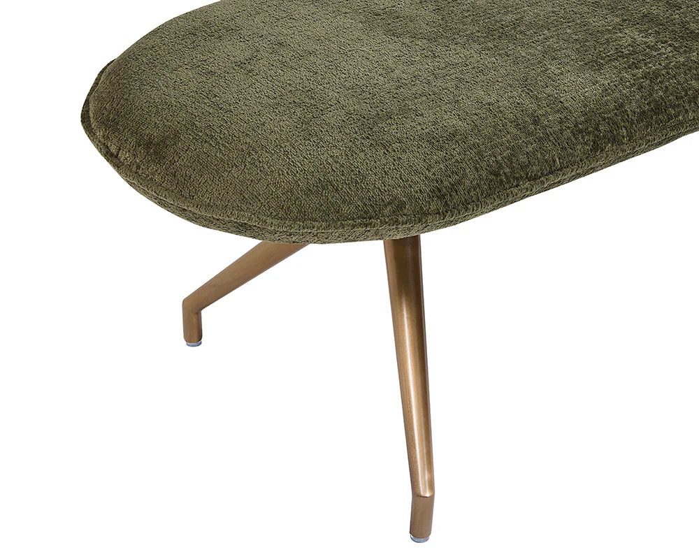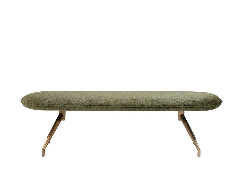 With a stunning oval design, this modern bench will add style and function to any space. Stocked in bergen olive fabric and completed with an antique brass powder coated stainless steel base. Also available in bergen taupe fabric.