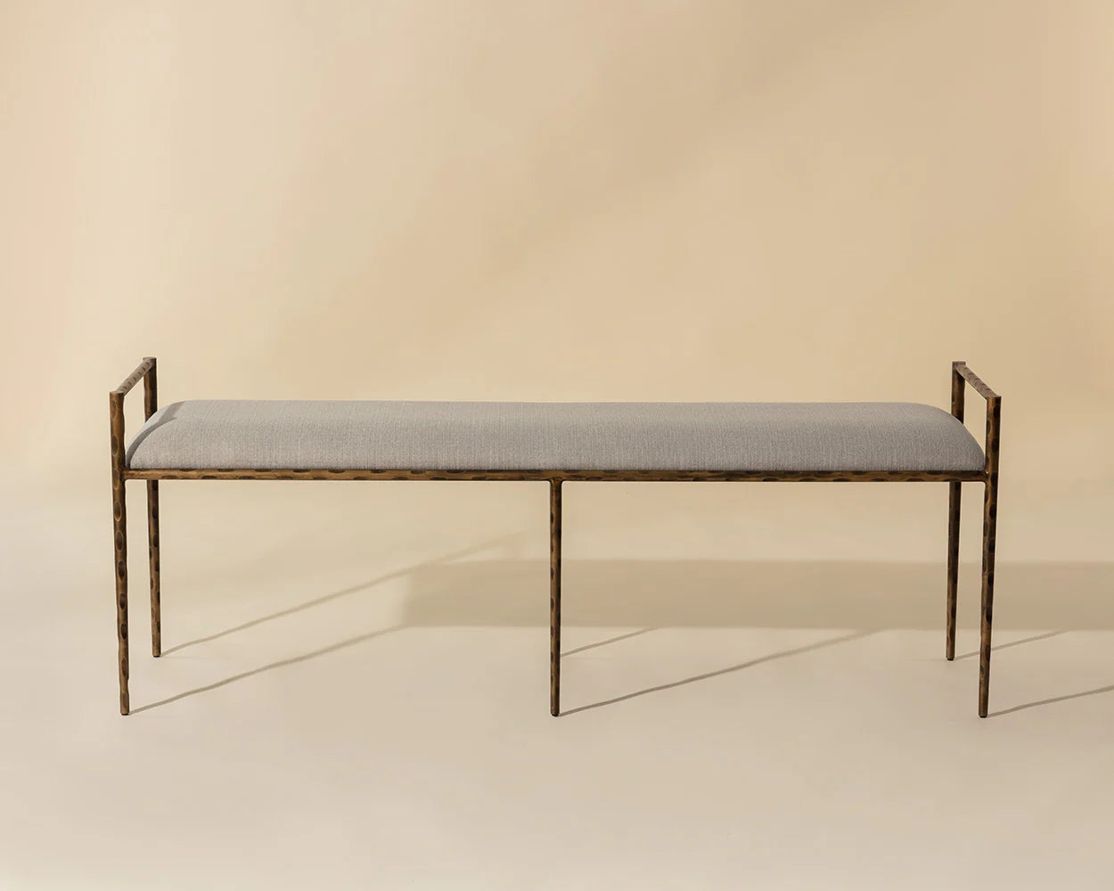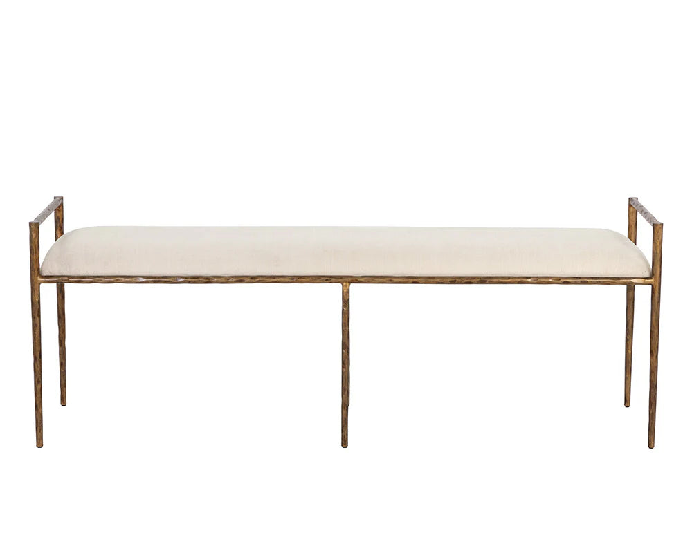 Rich with texture, this impressive bench is infused with an exotic touch. Stocked in zenith alabaster performance fabric, and completed with a hammered antique brass steel frame. Performance fabric is moisture repellent, durable and easy to clean. Made in India. With refined craftsmanship, this design was brought to life by skilled local artisans. By nature, these materials develop unique imperfections such as fissures, markings and colour variations for a truly one-of-a-kind piece. Also available in zenith taupe grey performance fabric.