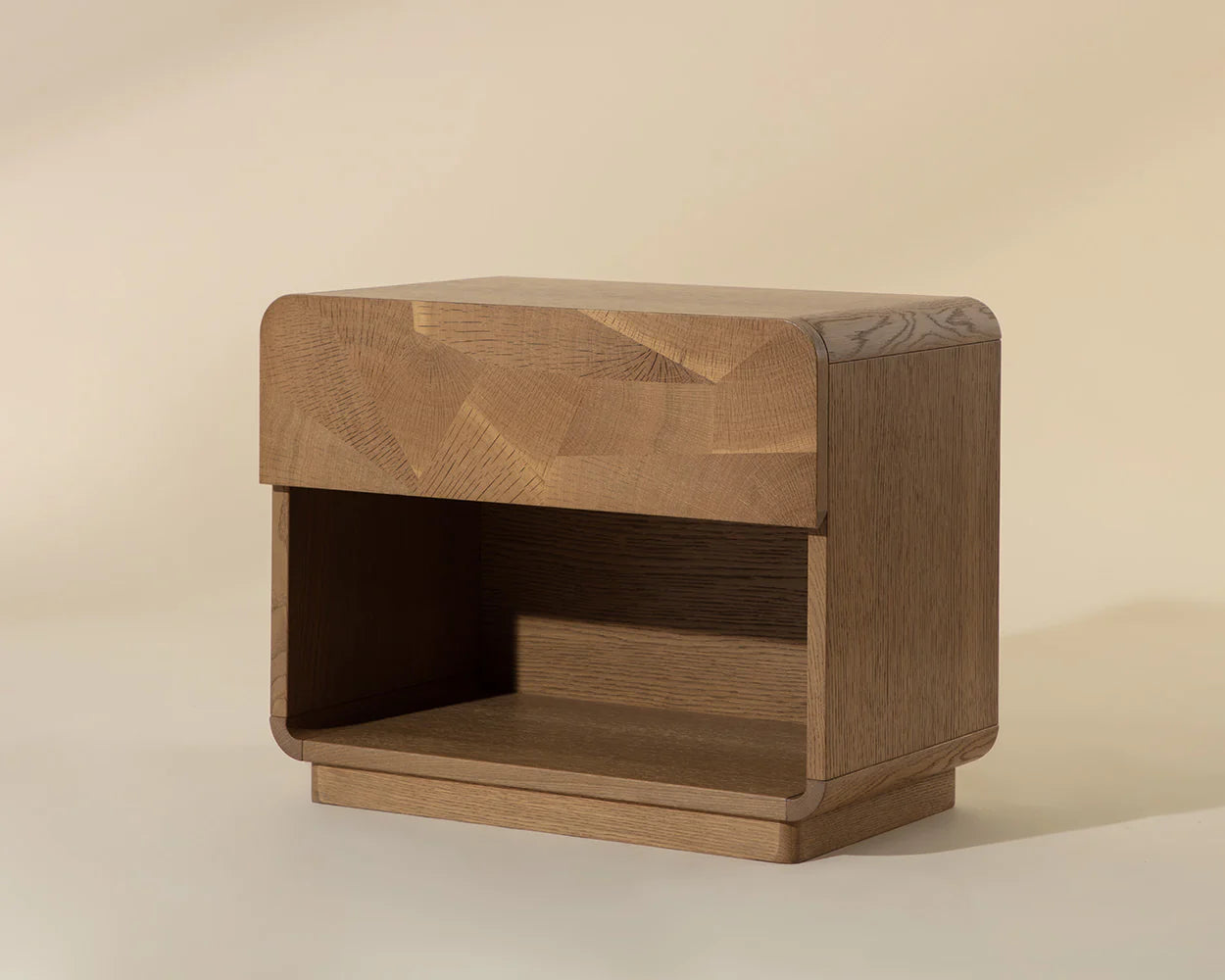 Magnificently crafted from solid oak wood, the Fauna Nightstand is an earthy delight. A stunning mosaic of oyster-cut oak veneer is beautifully pieced together on the drawer front to create a distinct, eye-catching pattern.