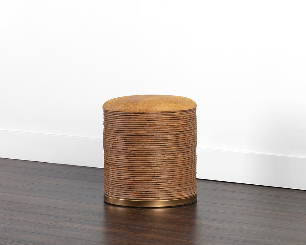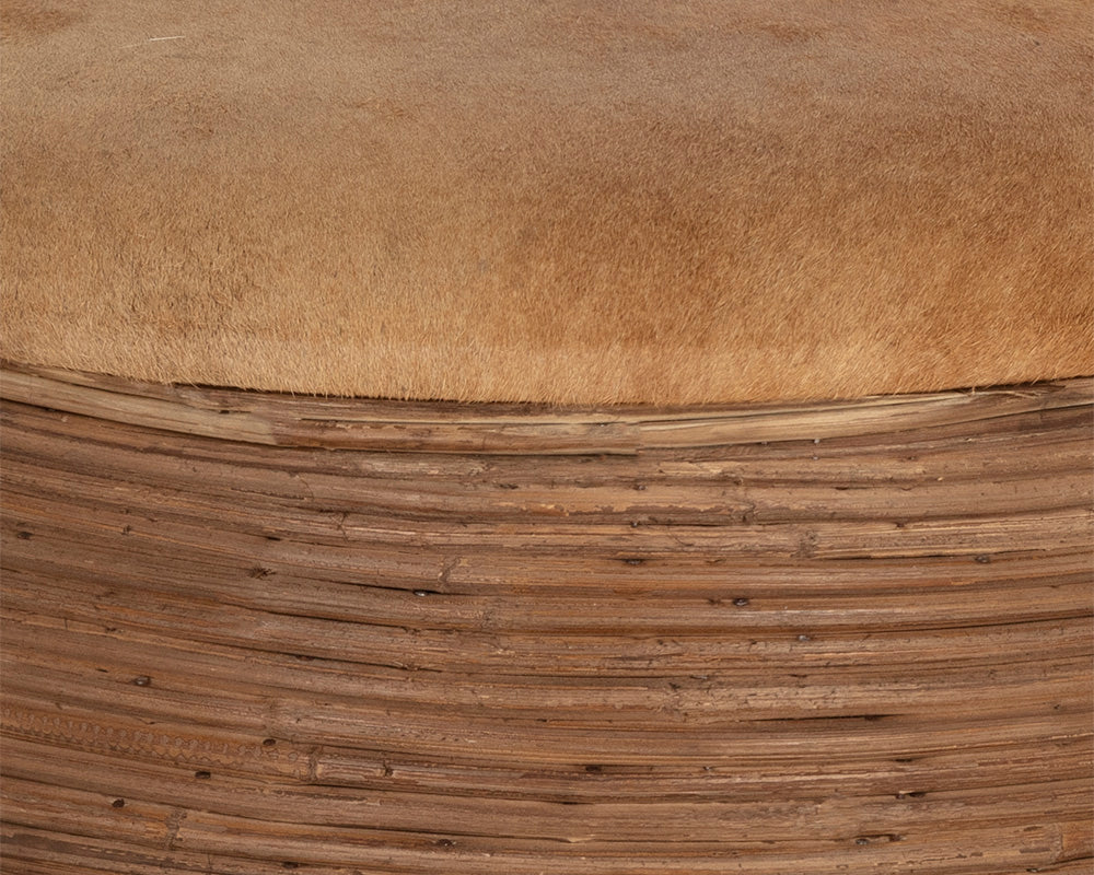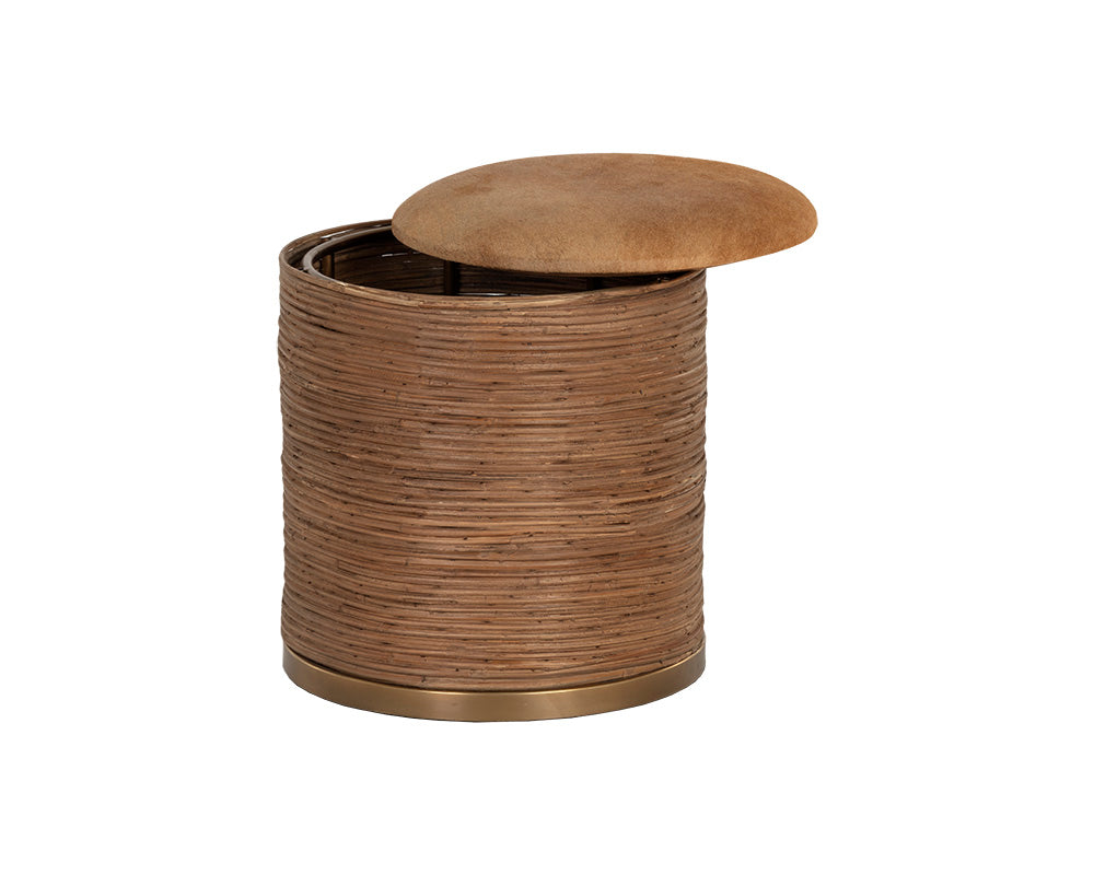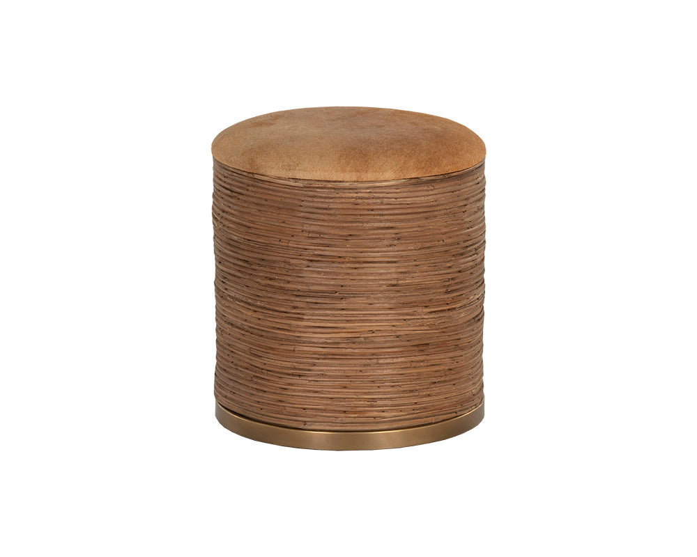 Inspired by global travels, this beautiful storage ottoman will add elegance and allure to any space. Features a stunning burnished brass stainless steel frame wrapped in natural cane. A tan cowhide top completes the look. As cowhide is a natural material, organic markings on the animal may still be visible and there may be apparent differences in hair length, colour, and pattern. No two pieces are alike and images on site may not capture these qualities precisely. Made in India. With refined craftsmanship, this design was brought to life by skilled local artisans. By nature, these materials develop unique imperfections such as fissures, markings and colour variations for a truly one-of-a-kind piece.