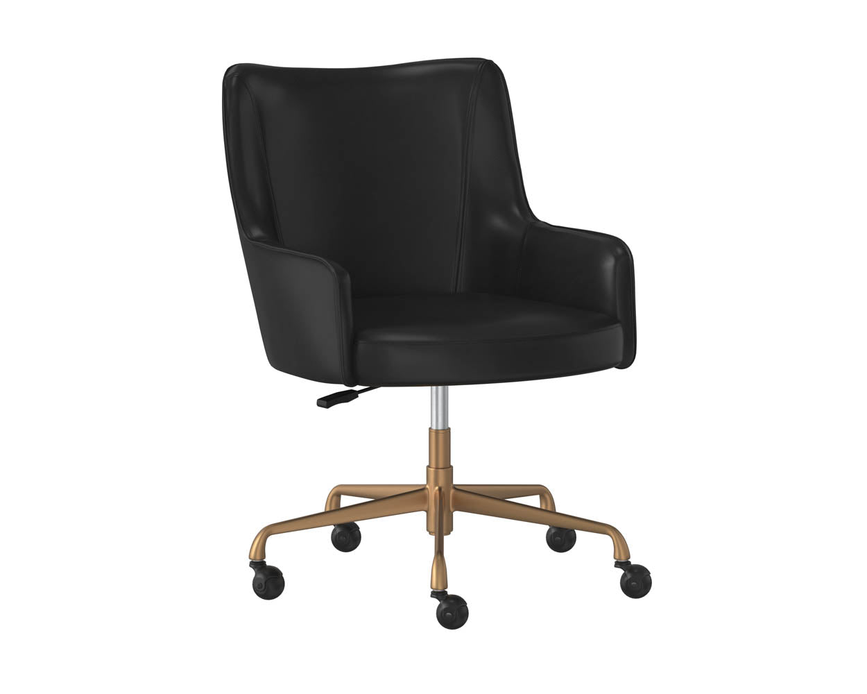 This compact barrel back office chair will add rustic and mid-century modern styling to any workspace. Stocked in our beige linen fabric with a rustic bronze aluminum base. Finished with added castors for mobility. Also stocked in our vintage black faux leather with a rustic bronze aluminum base. Handle With Care: This design has been crafted with faux leather. Faux leather is manufactured to reflect the natural characteristics of leather; as such, colour variations, markings, wrinkles, grooves, and light scratches are appreciated characteristics. No two pieces will be alike. Visit our Product Care page for more information on how to ensure the lasting beauty of this piece.
