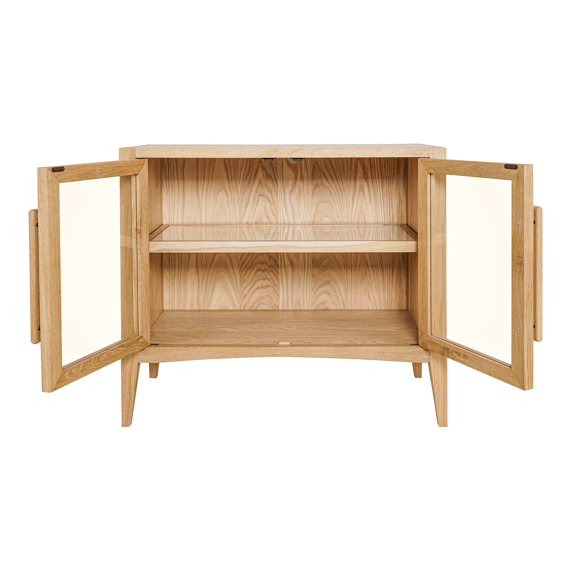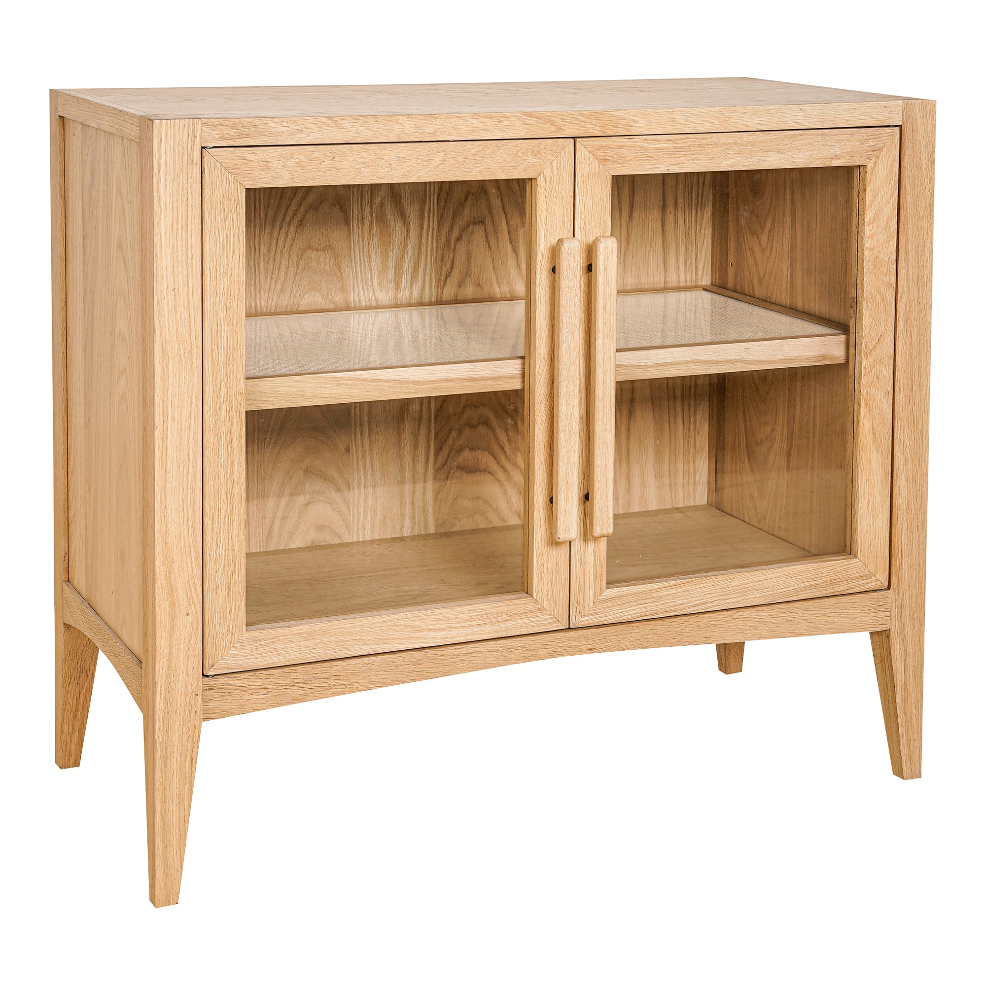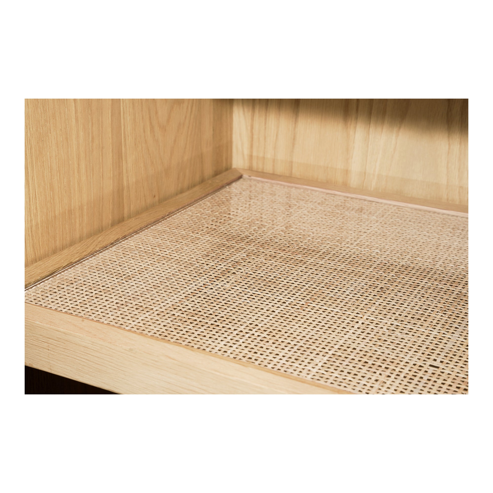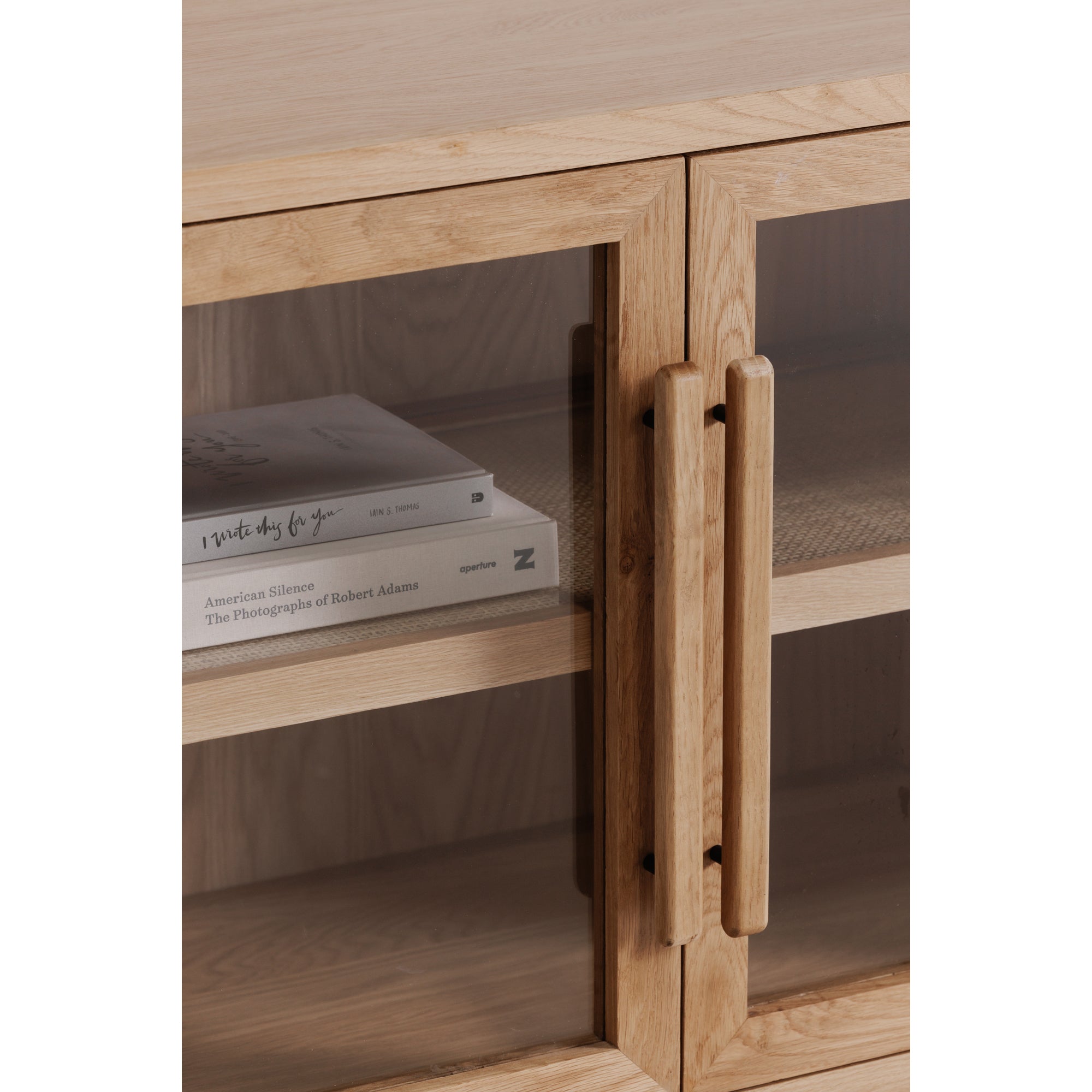 Adding texture and visual intrigue with mixed materiality and supported by a beautifully sculpted solid oak frame, the Harrington small cabinet’s shelves are made from woven natural cane—beautiful detailing that is revealed through its tempered glass doors punctuating its airy design. Fine craftsmanship brings a contemporary touch to a rustic feel adding eye-catching allure.