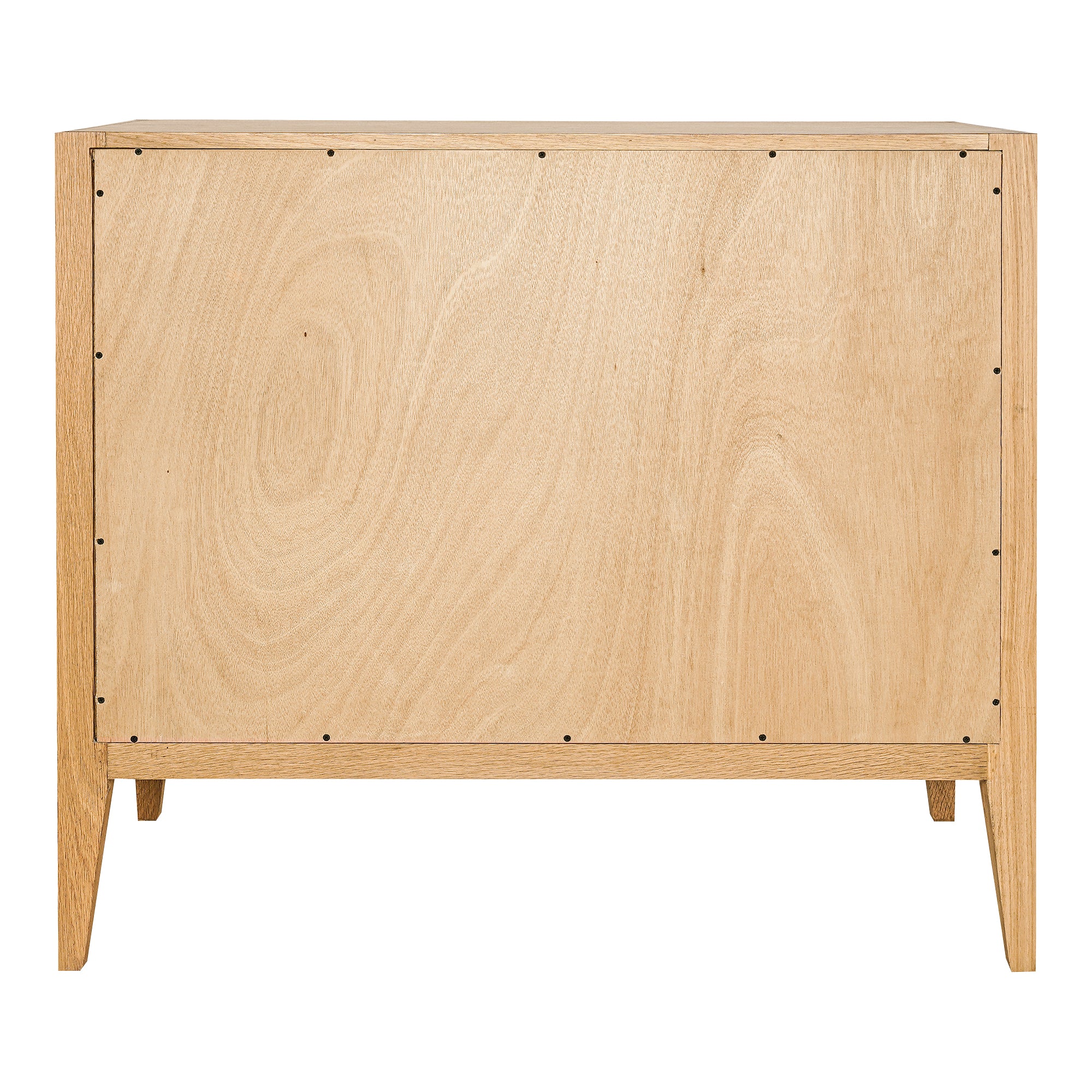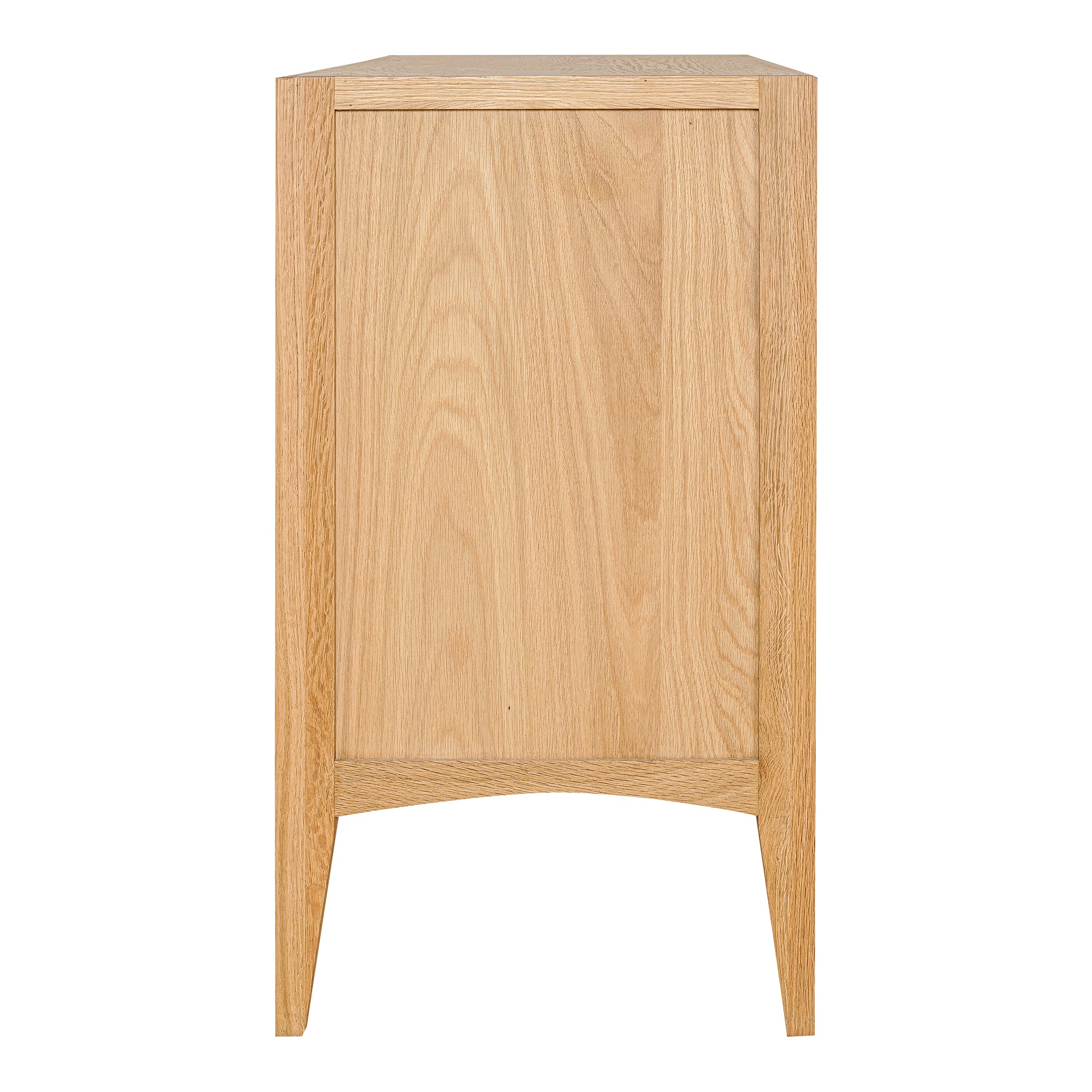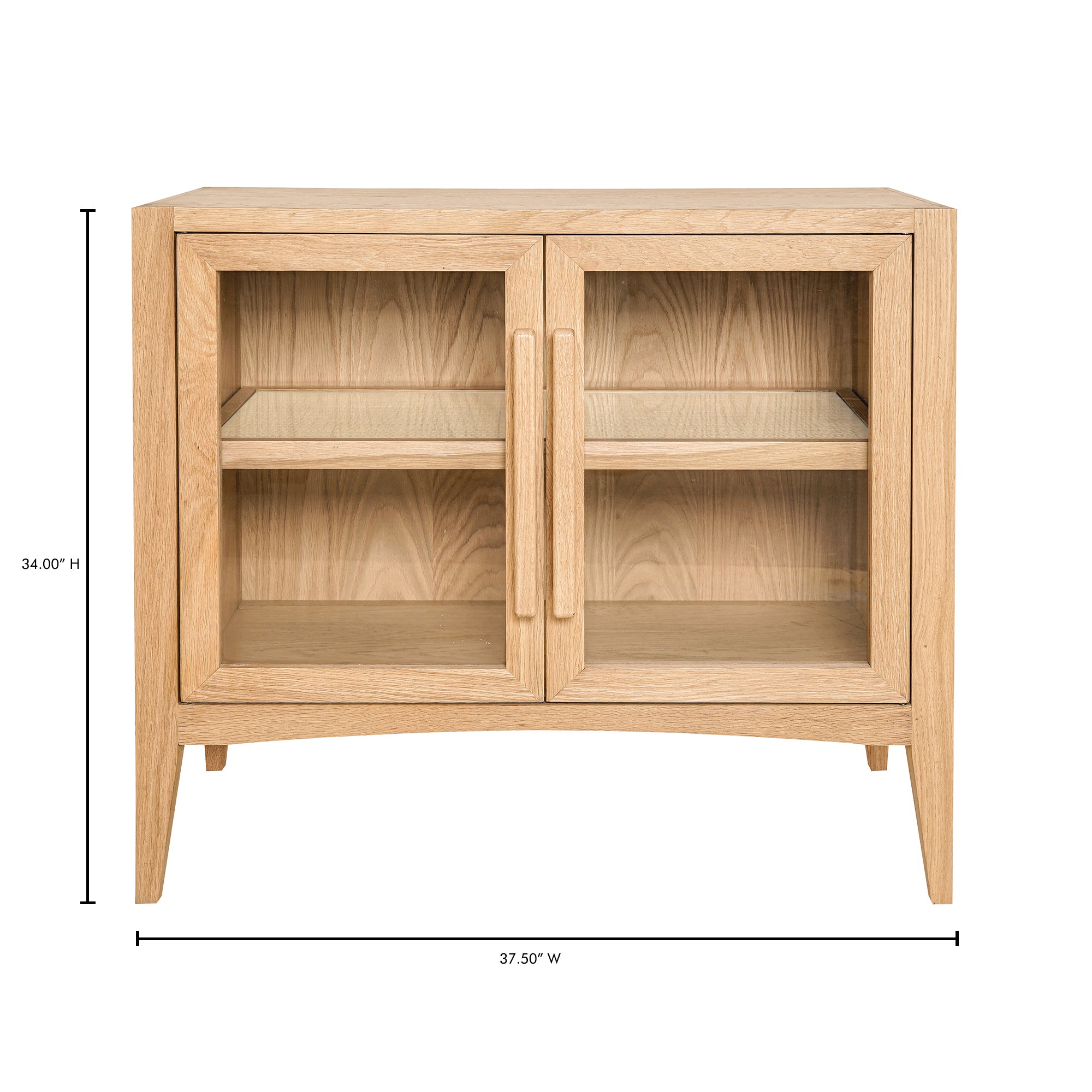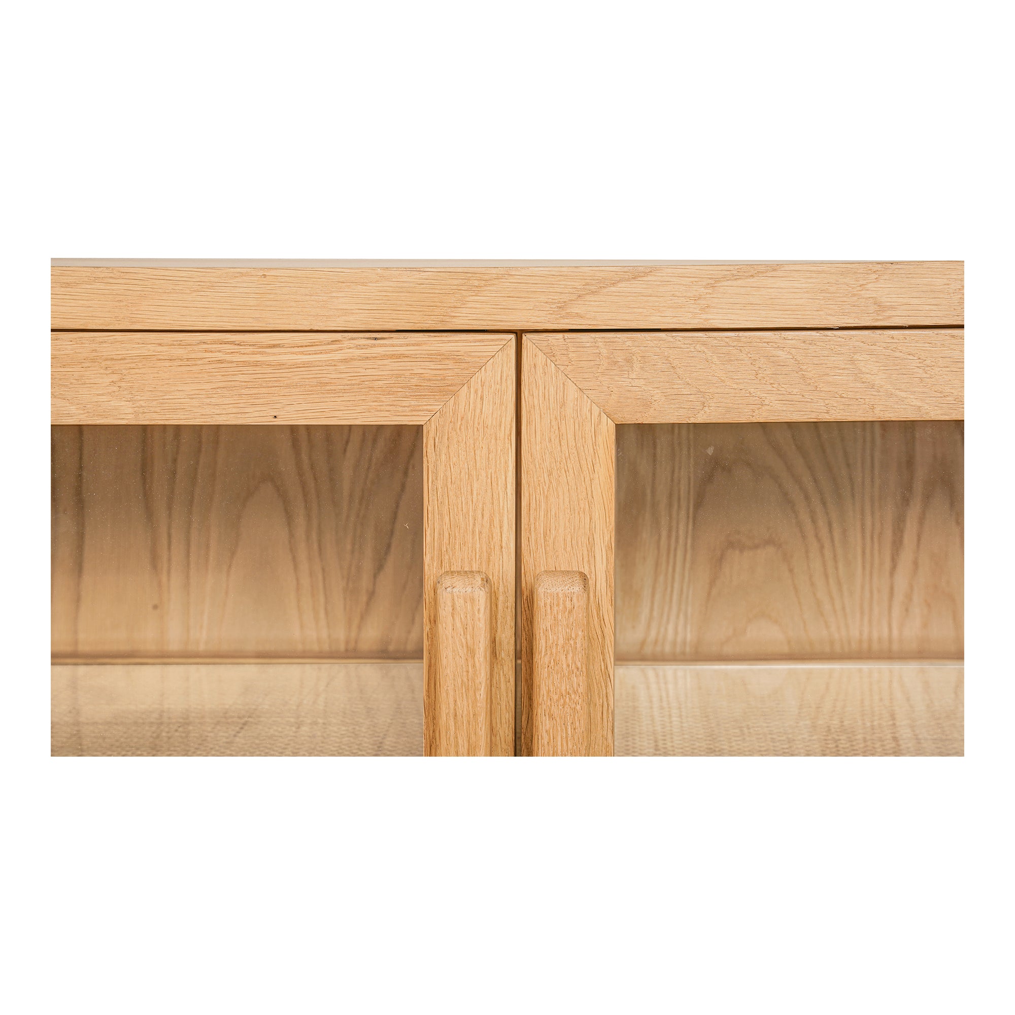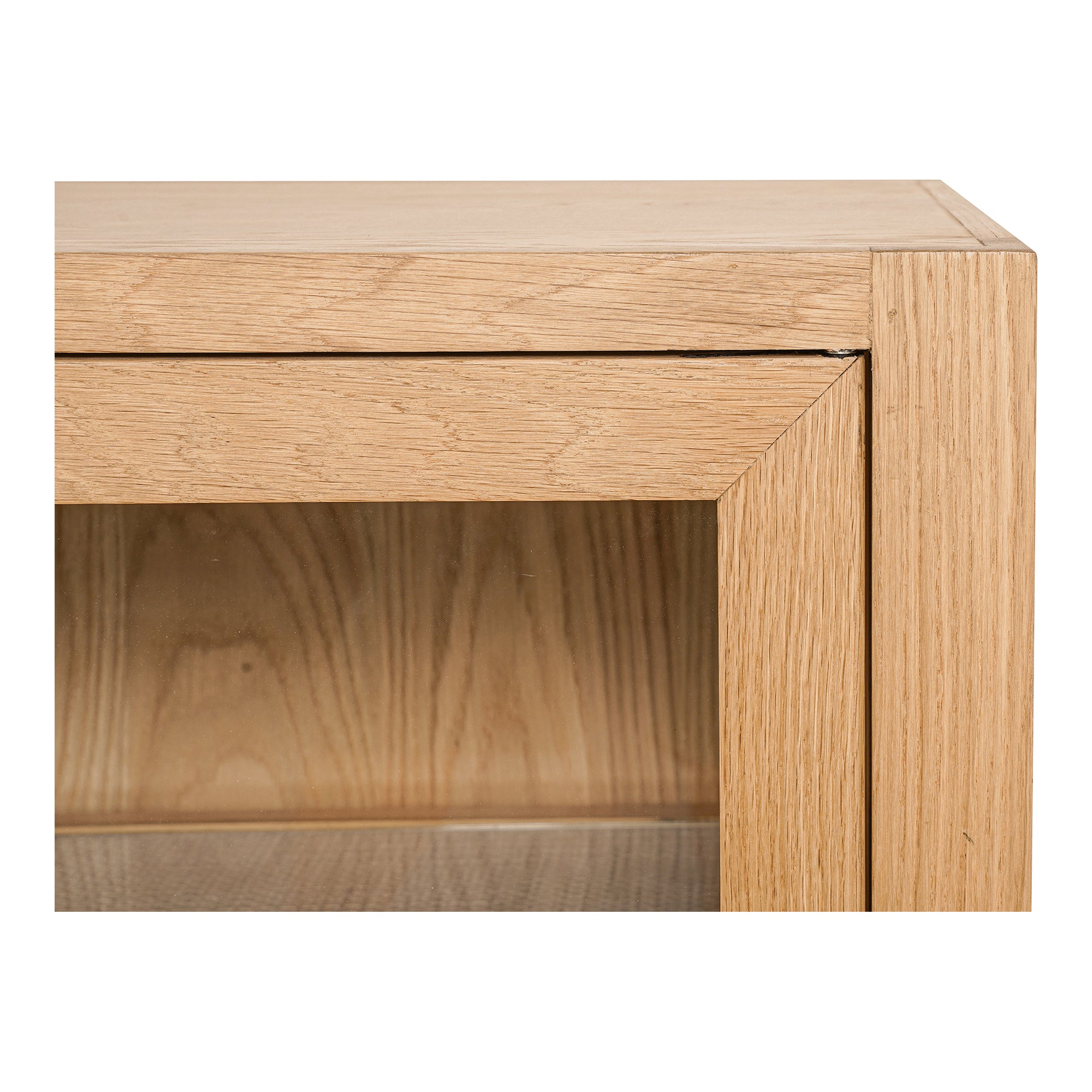 Adding texture and visual intrigue with mixed materiality and supported by a beautifully sculpted solid oak frame, the Harrington small cabinet’s shelves are made from woven natural cane—beautiful detailing that is revealed through its tempered glass doors punctuating its airy design. Fine craftsmanship brings a contemporary touch to a rustic feel adding eye-catching allure.