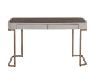 This contemporary desk is defined by its beautiful and gentle curves. Upholstered in cream faux leather with a brown oak veneer tabletop that is sure to impress. Includes two drawers and completed with a rustic bronze steel base. Coordinating console table, media console and cabinet and sideboard also available. Handle With Care: This design has been crafted with faux leather. Faux leather is manufactured to reflect the natural characteristics of leather; as such, colour variations, markings wrinkles, grooves, and light scratches are appreciated characteristics. No two pieces will be alike. Visit our Product Care page for more information on how to ensure the lasting beauty of this piece.