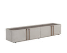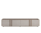 This contemporary media console and cabinet is defined by its beautiful and gentle curves. Upholstered in cream faux leather with a brown oak veneer tabletop that is sure to impress. Includes four cabinets and completed with a rustic bronze steel base. Coordinating console table, desk, and sideboard also available. Handle With Care: This design has been crafted with faux leather. Faux leather is manufactured to reflect the natural characteristics of leather; as such, colour variations, markings wrinkles, grooves, and light scratches are appreciated characteristics. No two pieces will be alike. Visit our Product Care page for more information on how to ensure the lasting beauty of this piece.