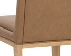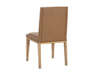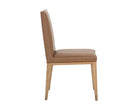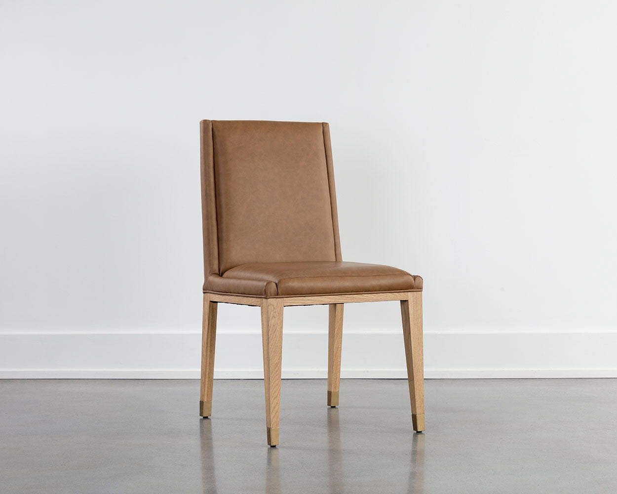 The Kalla Dining Chair brings form and function to life. Fully upholstered seating in our milliken cognac faux leather sits atop a rustic oak wood base. Gold foot caps finish the look. As wood is an organic, porous material, these pieces will contain natural variation of texture and may also exhibit fine indentations and cracks. Wood pieces will also display a disparity of colour and grain, and visible knots and burls that add to the character of each piece.