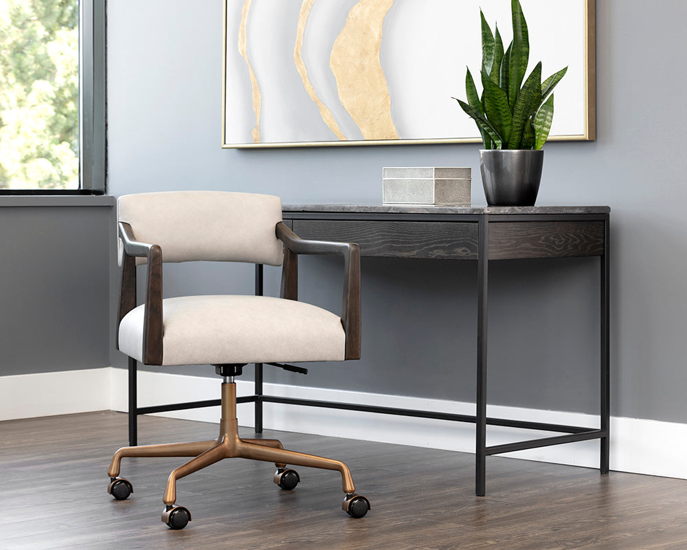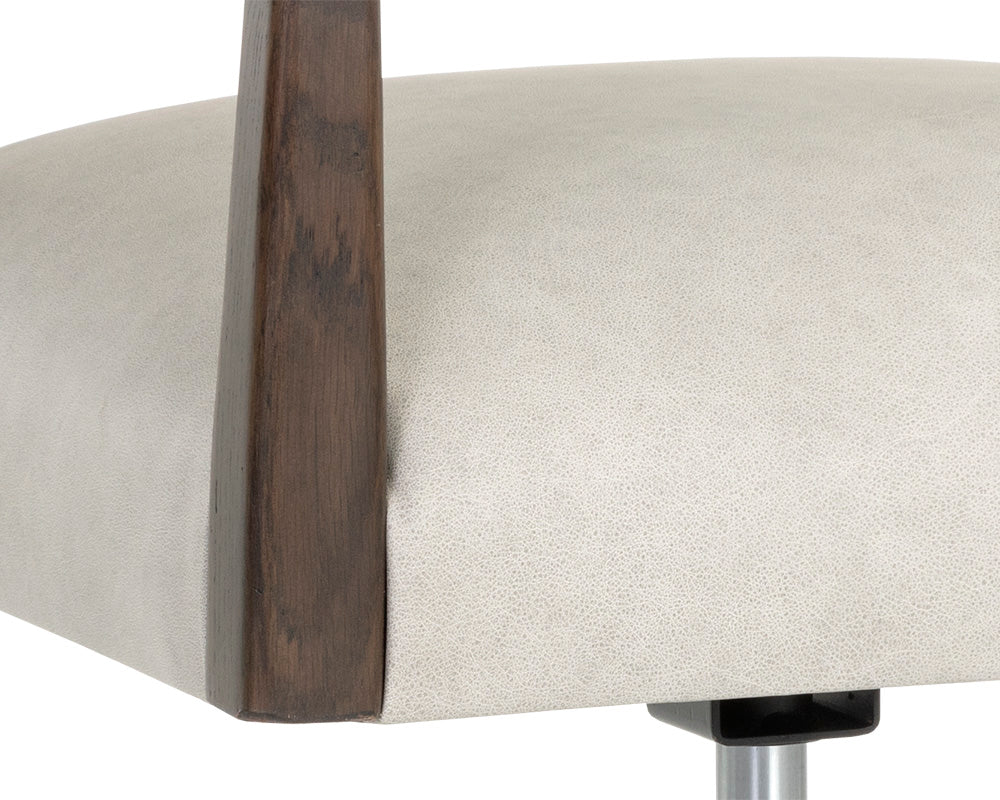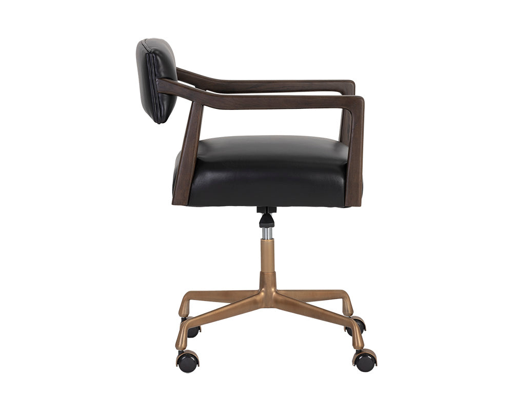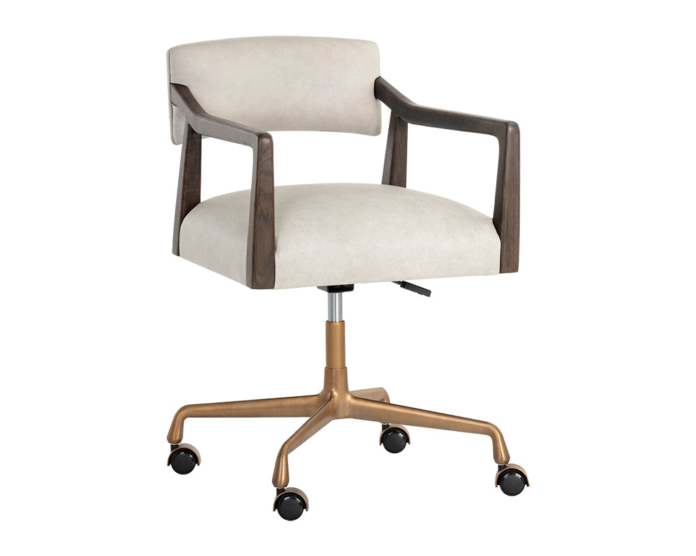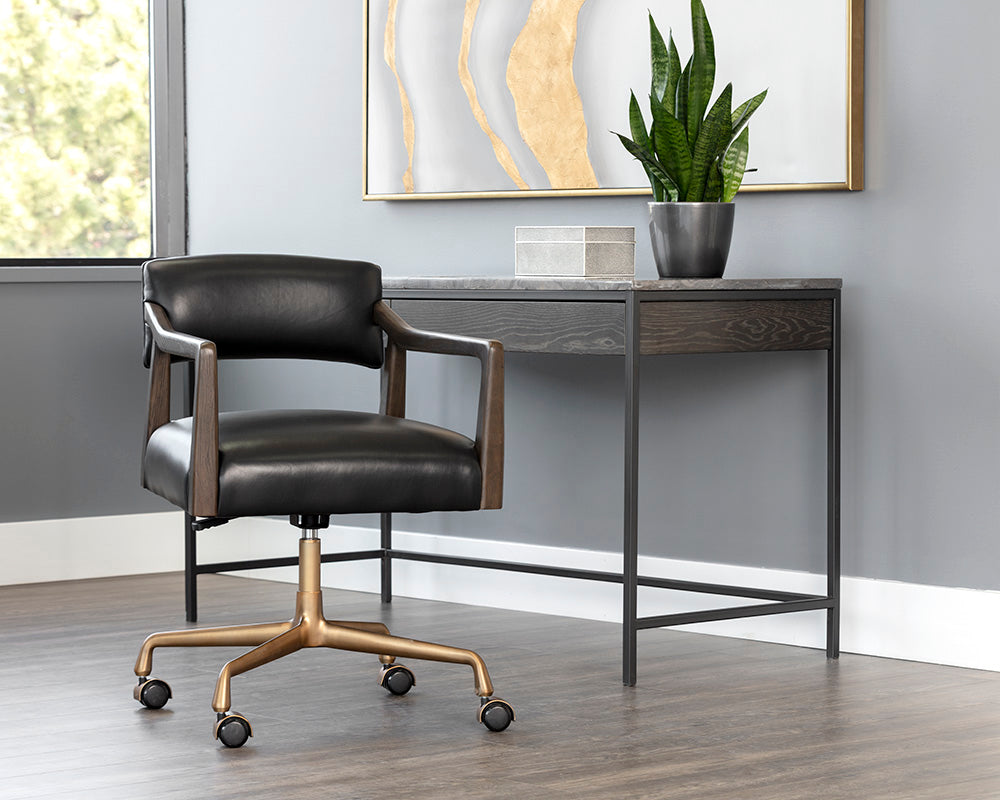Design an inviting office space with the mid-century inspired Keagan office chair. The exposed dark brown oak wood arms and bronze base offers an airy element while paired with saloon light grey, cortina black and shalimar tobacco genuine leather. Handle with Care: This design has been crafted with 100% genuine leather. Leather is a natural material; as such, colour variations, markings, wrinkles, grooves and light scratches are acceptable and appreciated characteristics. No two pieces are alike. Visit our Product Care page for more information on how to ensure the lasting beauty of this piece. Are page for more information on how to ensure the lasting beauty of this piece.
