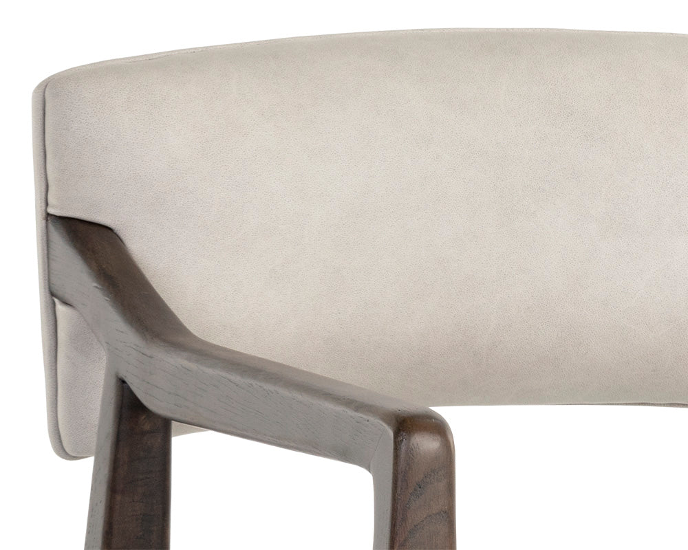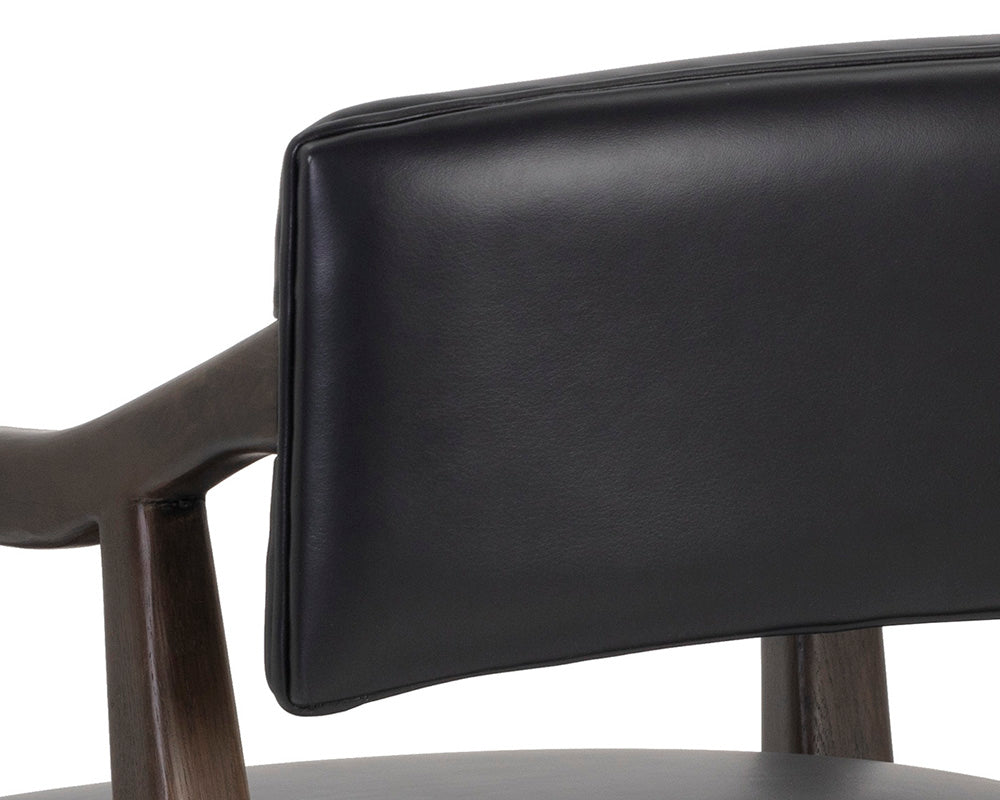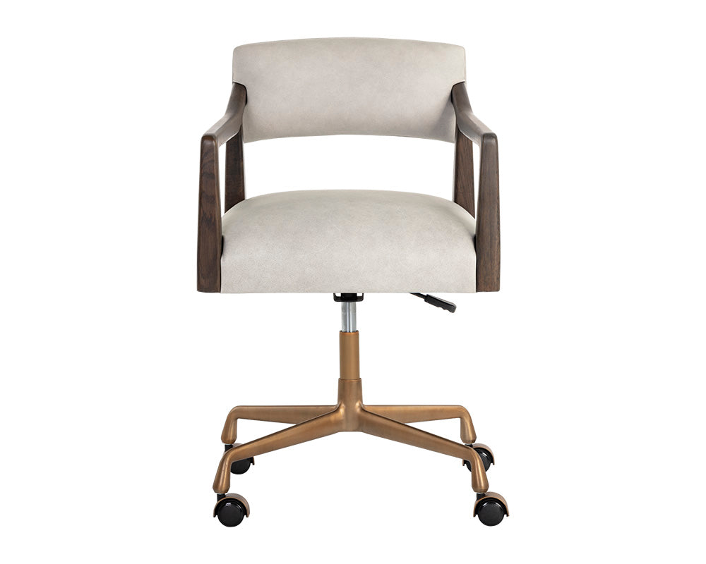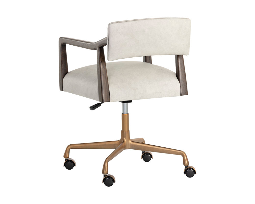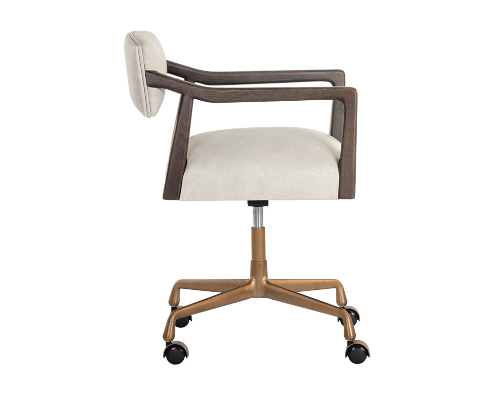 Design an inviting office space with the mid-century inspired Keagan office chair. The exposed dark brown oak wood arms and bronze base offers an airy element while paired with saloon light grey, cortina black and shalimar tobacco genuine leather. Handle with Care: This design has been crafted with 100% genuine leather. Leather is a natural material; as such, colour variations, markings, wrinkles, grooves and light scratches are acceptable and appreciated characteristics. No two pieces are alike. Visit our Product Care page for more information on how to ensure the lasting beauty of this piece. Are page for more information on how to ensure the lasting beauty of this piece.