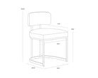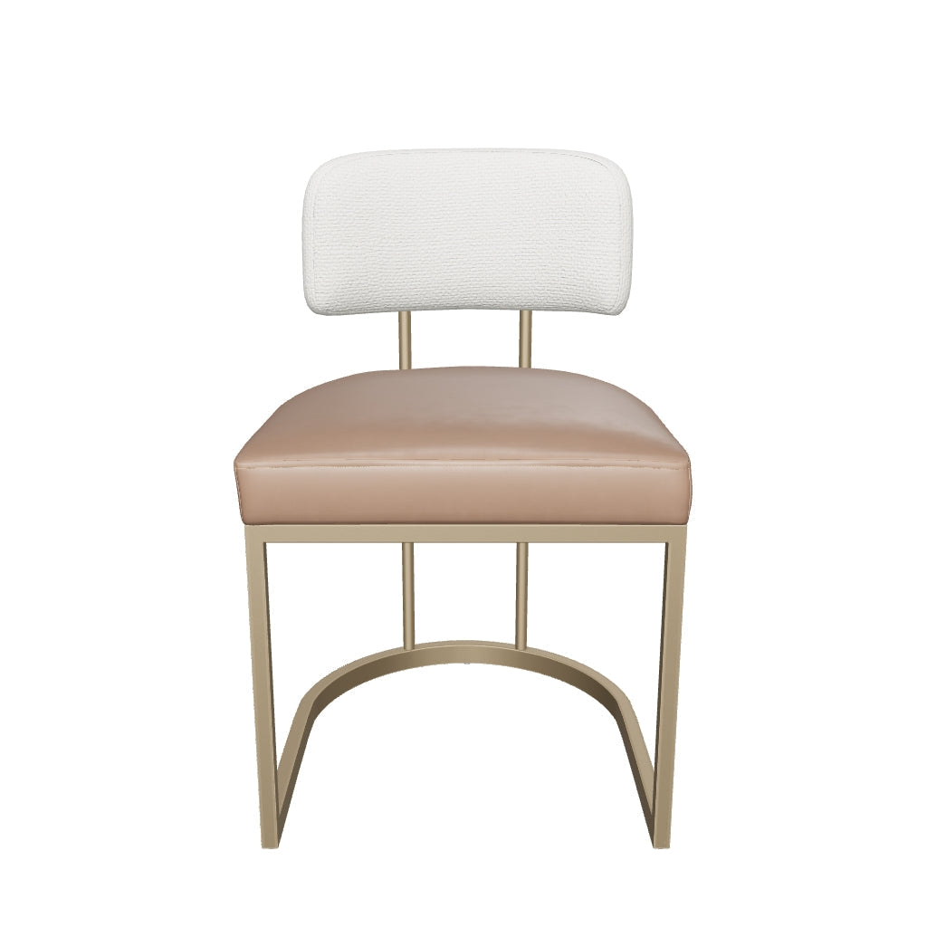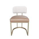 The Larissa Dining Chair brings together a beautiful display of mixed materials. A low seatback upholstered in rhea light barley fabric contrasts the warm tones of the seat upholstered in napa cognac faux leather for an elevated aesthetic. The antique brass stainless steel frame features a handle on the back for a functional and stylish addition.