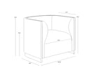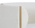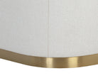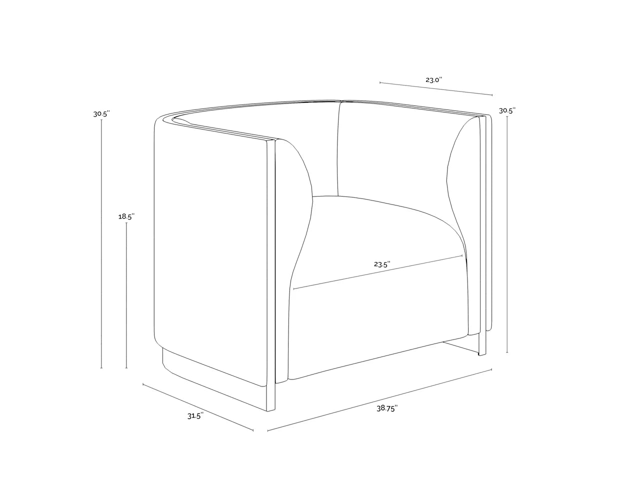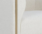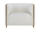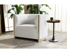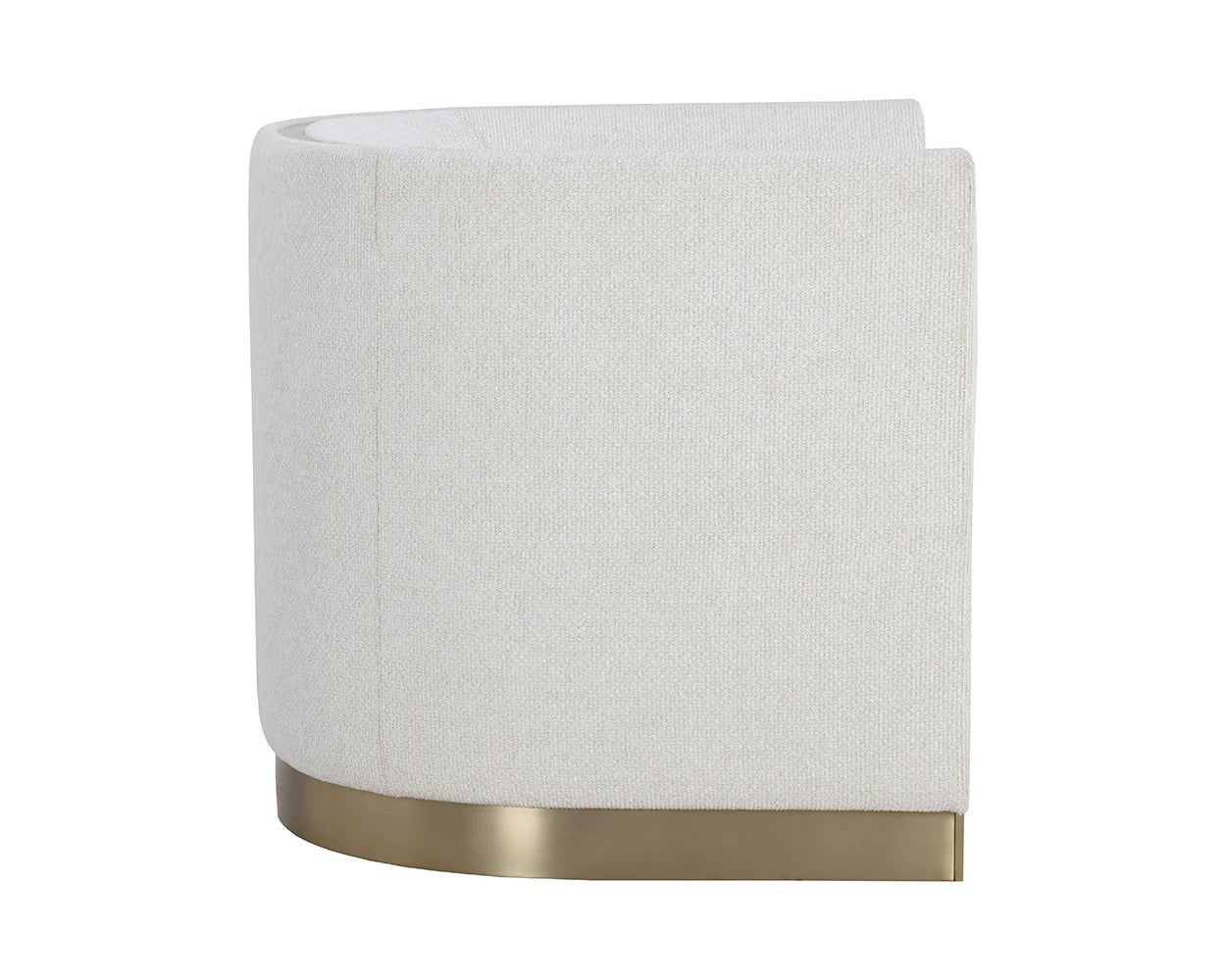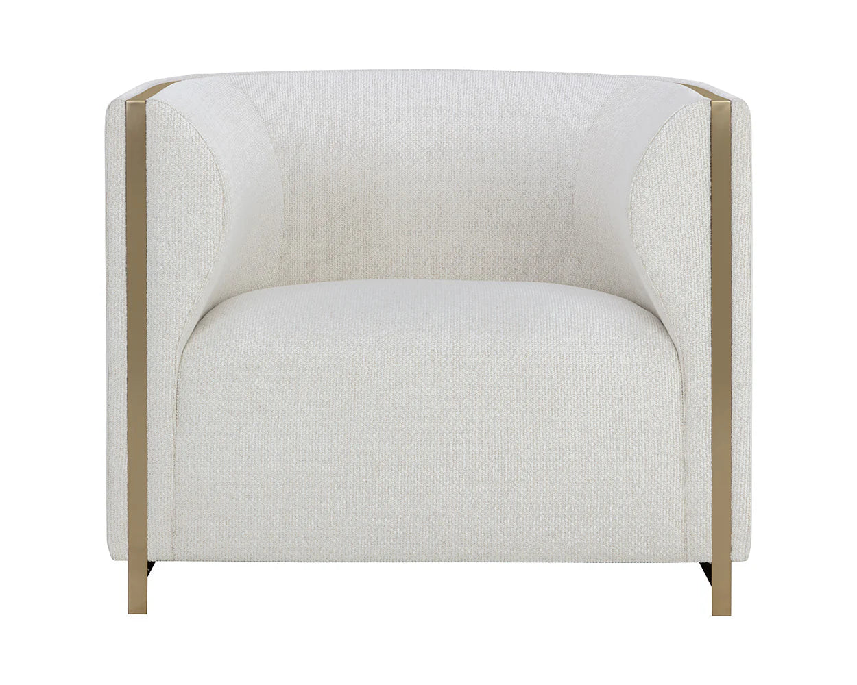 The Larron Armchair balances mixed materials to bring this contemporary design to life. Expertly upholstered in rhea light barley performance fabric for a soft touch. Gold stainless steel metal inlay and padded curves accentuate the chair's curved silhouette. Performance fabric is moisture repellent, durable and easy to clean.