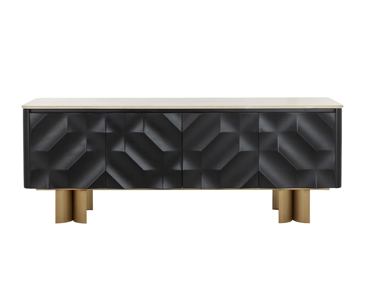Bold design and mixed materials establish the modern presence of the Lautrec Sideboard. Crafted with stainless steel and a stunning cream marble top, the Lautrec features captivating textural forms on the front sliding doors. Supported with uniquely curved legs in an antique brass finish.