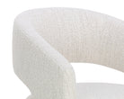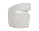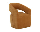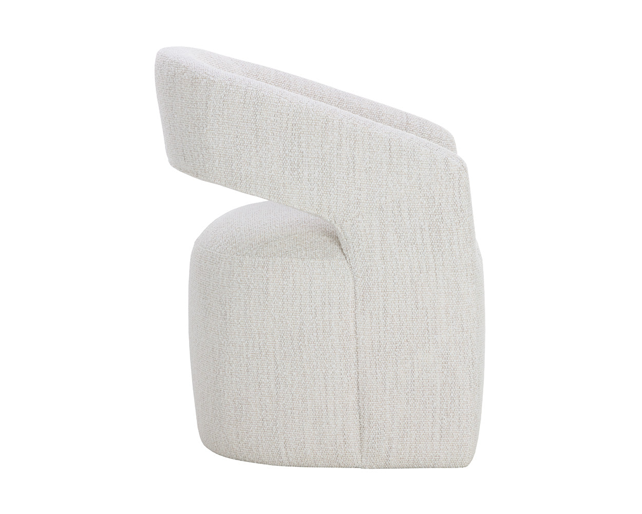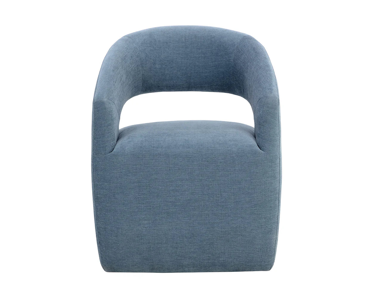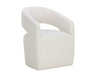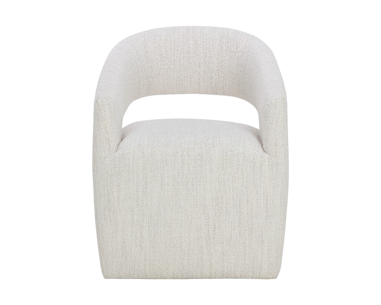 Gentle curves give the Lloret Wheeled Dining Armchair an elegantly defined silhouette. Fully upholstered in merino pearl performance fabric with a comfortable seat and casters for an easy glide. Performance fabric is moisture repellent, durable and easy to clean.
