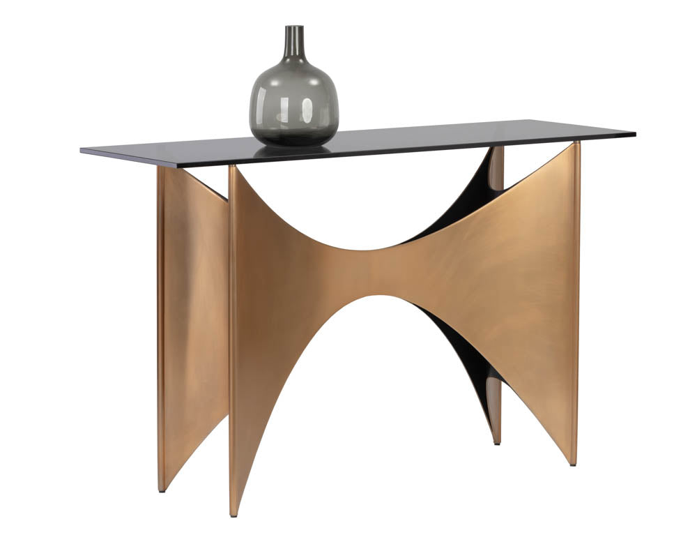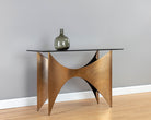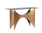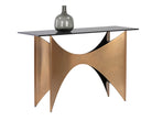 A glamorous console table featuring a stainless steel base with a brushed antique gold finish and a smoked grey glass top. Can be paired with coordinating coffee and end tables.