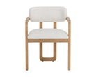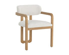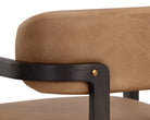 The eye-catching silhouette of the Madrone Dining Armchair will stun from all angles. The curved lines of the three-legged brown oak wood frame lend a statuesque presence to any room. The low back seat is upholstered in ludlow sesame leather for luxurious comfort. Also available in natural oak wood frame upholstered in heather ivory performance fabric. Performance fabric is moisture repellent, durable and easy to clean.