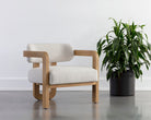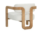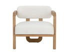 The eye-catching silhouette of the Madrone Lounge Chair will stun from all angles. The curved lines of the three-legged brown oak wood frame lend a statuesque presence to any room. The low back seat is upholstered in ludlow sesame leather for luxurious comfort. Also available in natural oak wood upolstered in heather ivory performance fabric. Performance fabric is moisture repellent, durable and easy to clean.