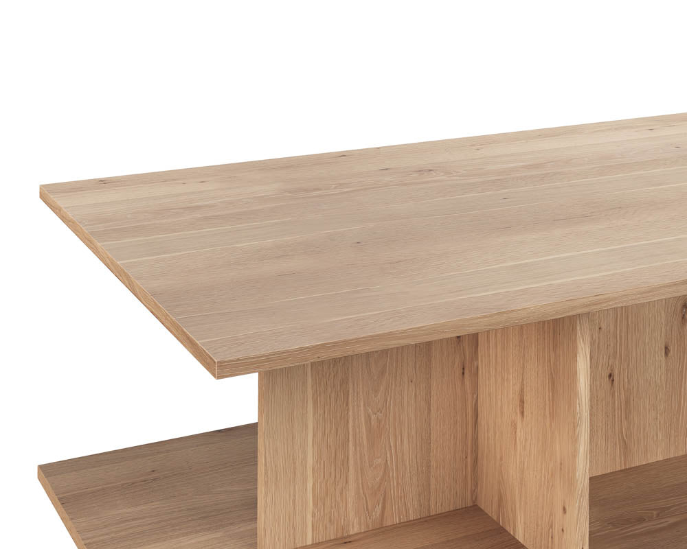 Introduce an earthy element to any living room space with this rectangular coffee table made from rustic oak wood. Features a solid oak wood veneer in a natural finish. Coordinating console and end tables also available. As wood is an organic, porous material, these pieces will contain natural variation of texture and may also exhibit fine indentations and cracks. Wood pieces will also display a disparity of colour and grain, and visible knots and burls that add to the character of each piece.