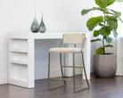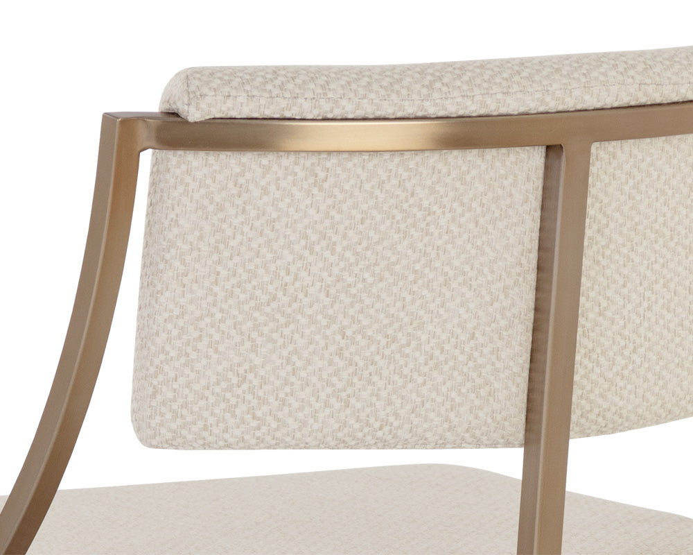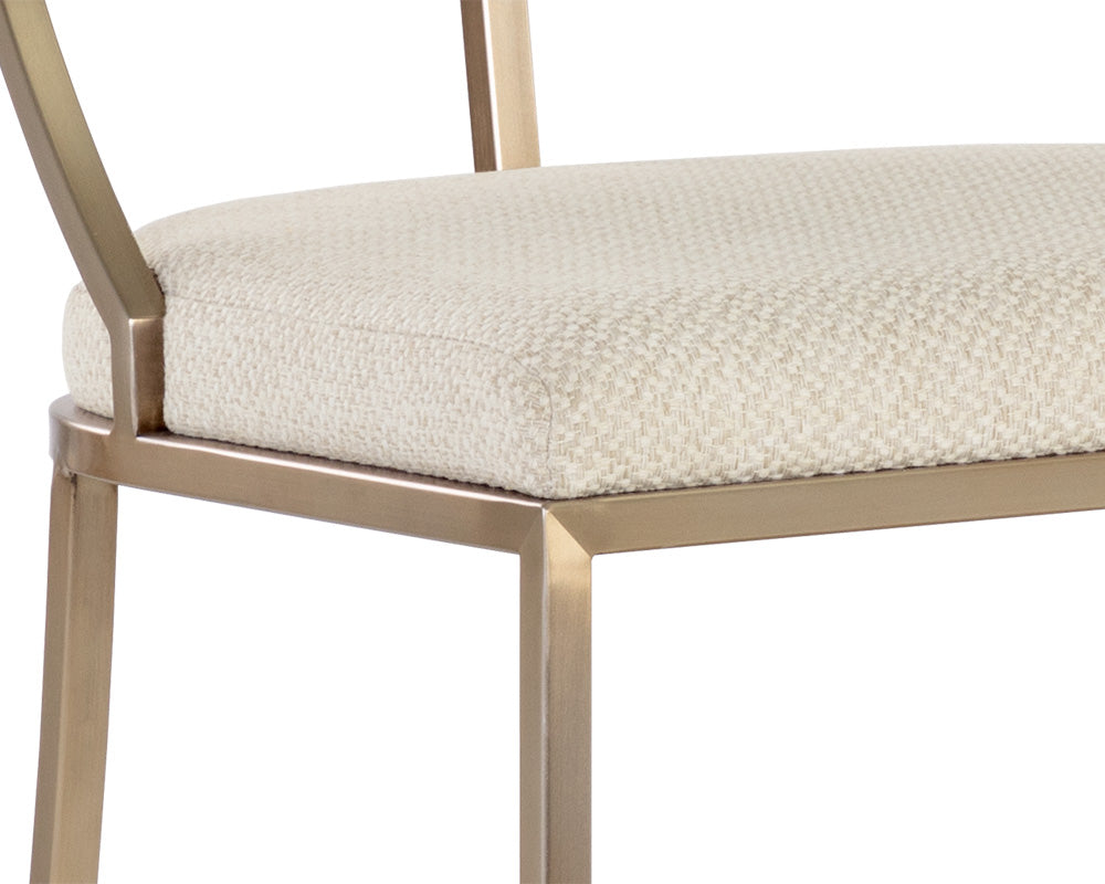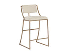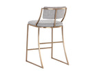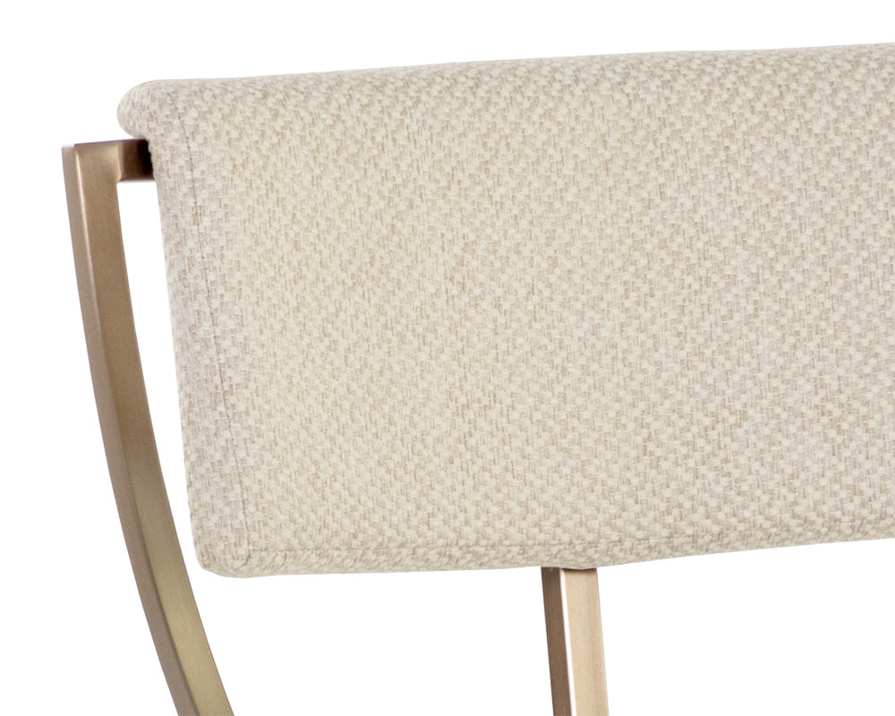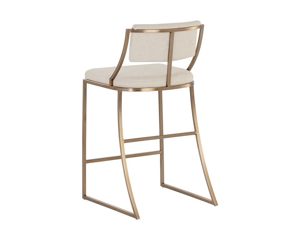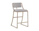 Sleek with an urban design, this counter stool emulates a beautiful mid-century design. Upholstered in monument oatmeal and pebble fabrics, and completed with an antique brass stainless steel frame. Also available in a dining chair version.