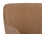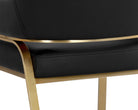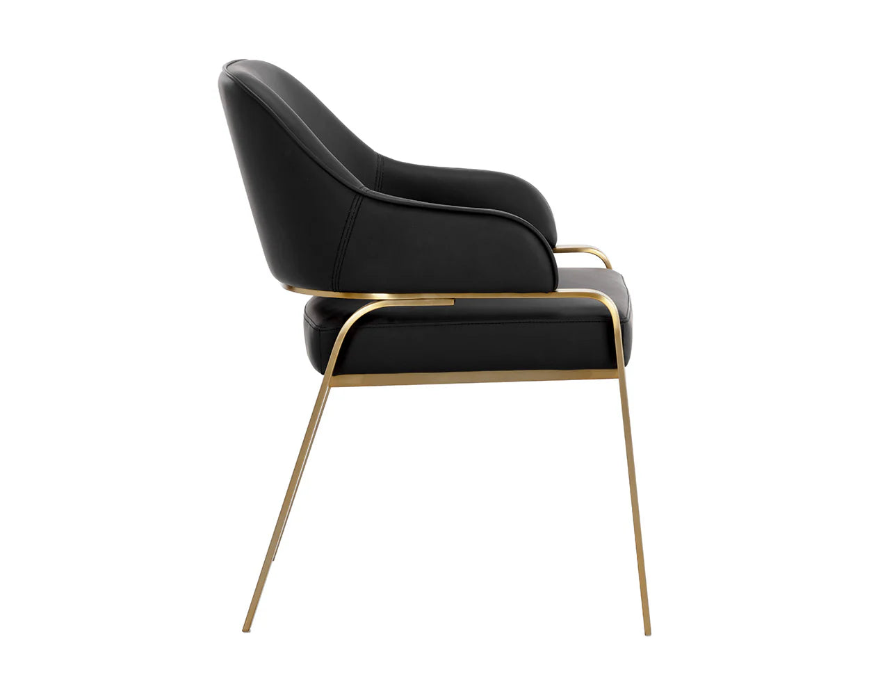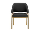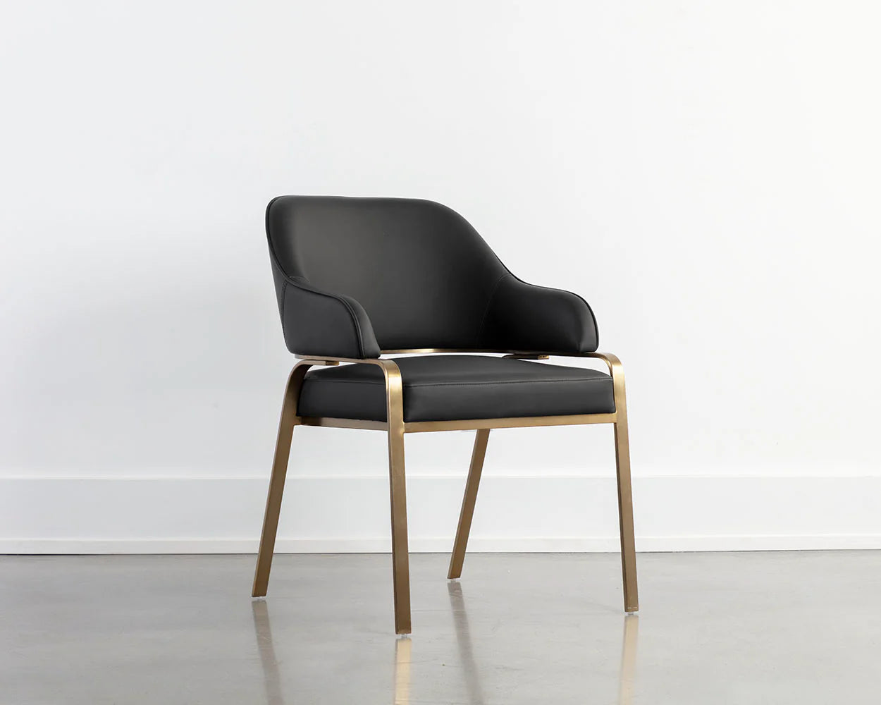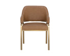 With a curved back and sleek gold powder-coated stainless steel base, the Malachi Dining Armchair brings an air of modern elegance to any dining room. Upholstered in milliken cognac faux leather for durability and comfort. Handle With Care: This design has been crafted with faux leather. Faux leather is manufactured to reflect the natural characteristics of leather; as such, colour variations, markings, wrinkles, grooves, and light scratches are appreciated characteristics. No two pieces will be alike. Visit our Product Care page for more information on how to ensure the lasting beauty of this piece.