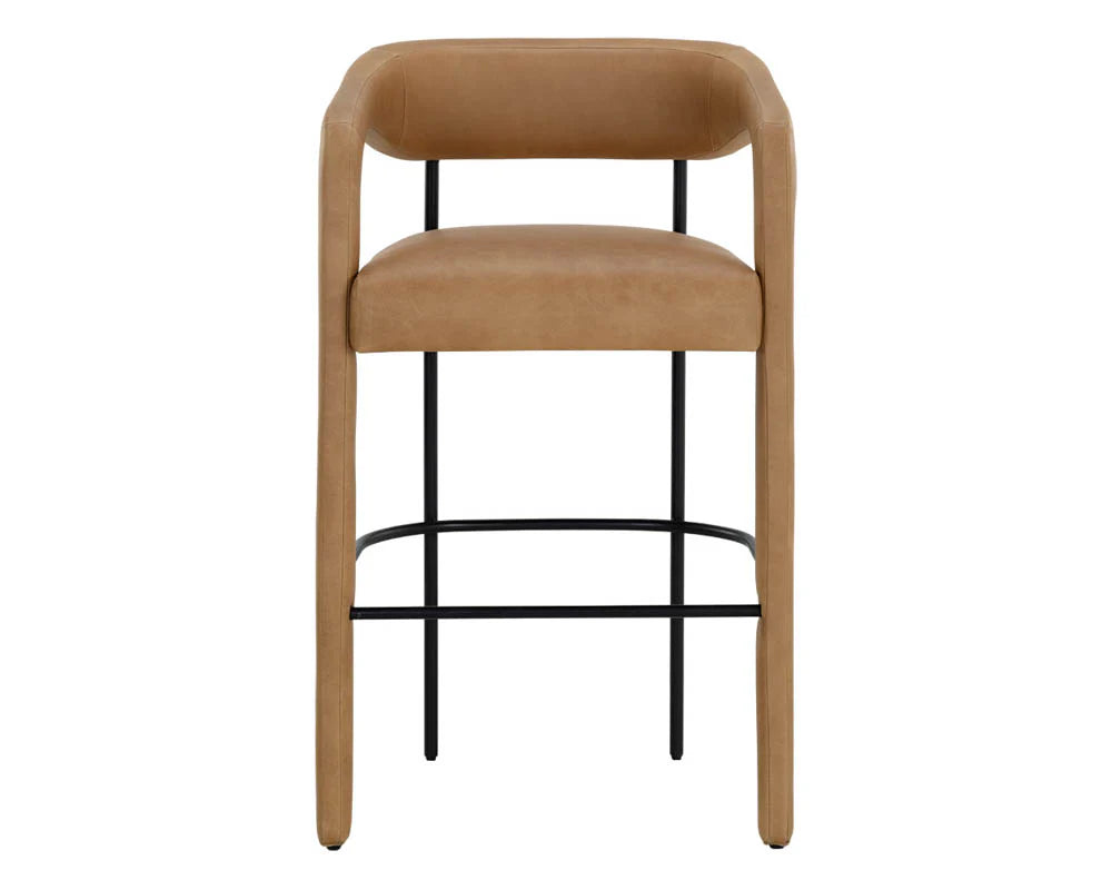 Perfectly poised, the Mavia Barstool brings a cool modern edge to any dining area. Our stunning ludlow sesame leather is wrapped around the seat, armrests and front legs while the rest of the matte black powder-coated frame remains exposed. Handle with Care: This design has been crafted with 100% top grain leather. Leather is a natural material; as such, colour variations, markings, wrinkles, grooves and light scratches are acceptable and appreciated characteristics. No two pieces are alike. Visit our Product Care page for more information on how to ensure the lasting beauty of this piece.