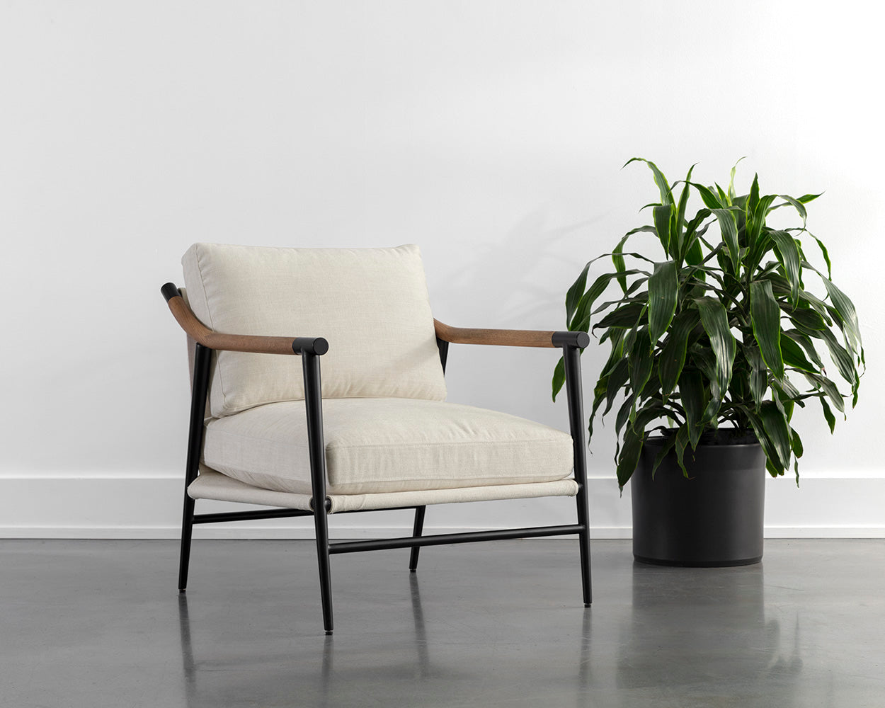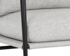 Functional with a timeless design, the Meadow Armchair offers a clean silhouette that will suit any space. Stocked in heather ivory tweed performance fabric with a matte black iron frame with solid oak wood detailing on the armrests. Completed with a black iron frame. Performance fabric is moisture repellant, stain resistant and easy to clean. Also stocked in vault fog fabric with solid oak wood armrests. As wood is an organic, porous material, these pieces will contain natural variations of texture and may also exhibit fine indentations and cracks. Wood pieces will also display a disparity of colour and grain, and visible knots and burls that add to the character of each piece.