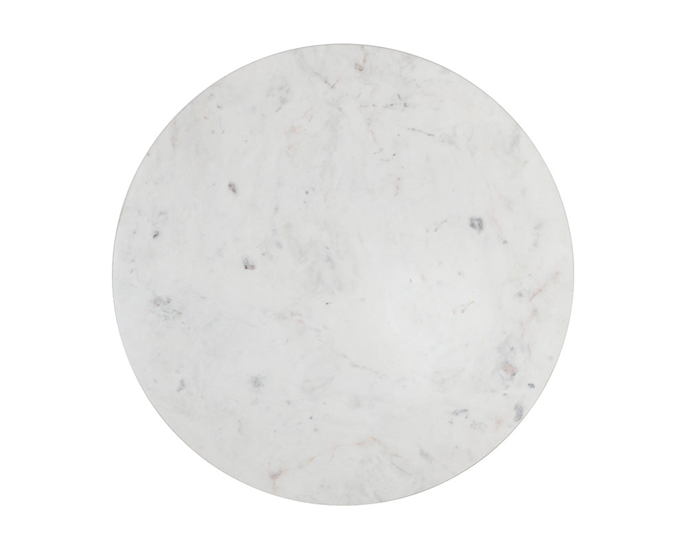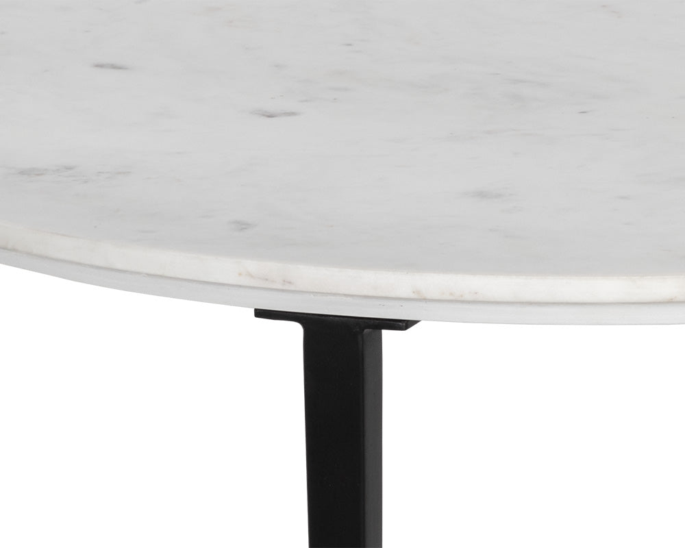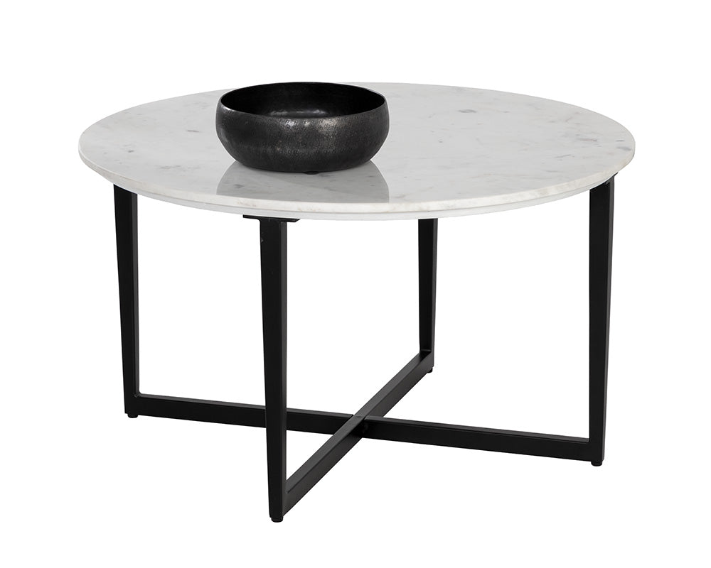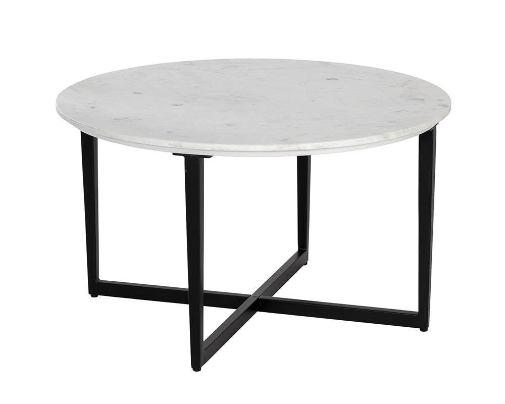 Clean and sleek, this round coffee table offers an effortlessly modern design. Features a white marble top and completed with a black powder coated steel base. As marble is a natural material, unique veining, pitting, fissures, micro-cracks and colour variations are all characteristics that add to the uniqueness and beauty of each piece.