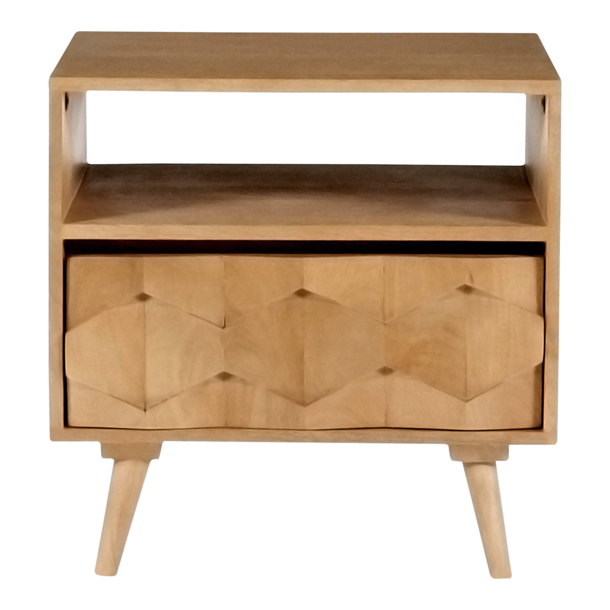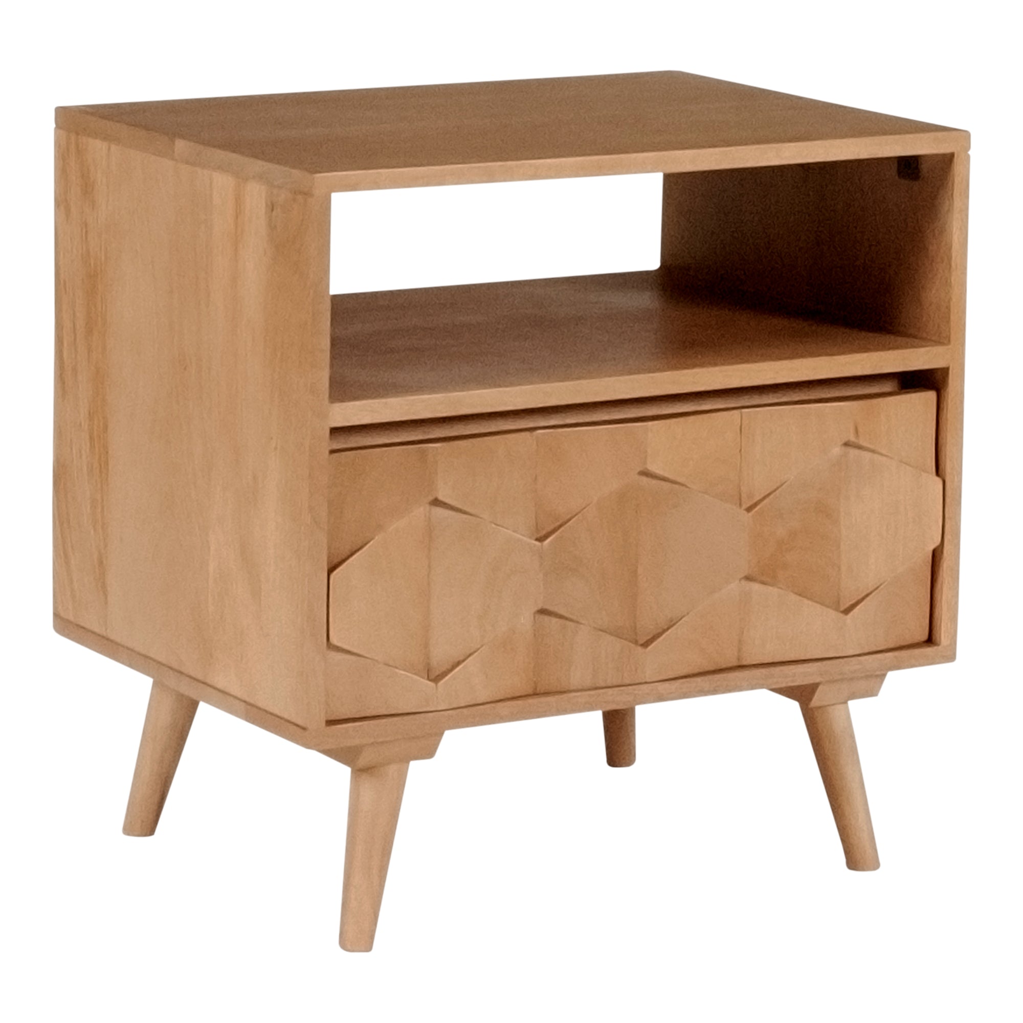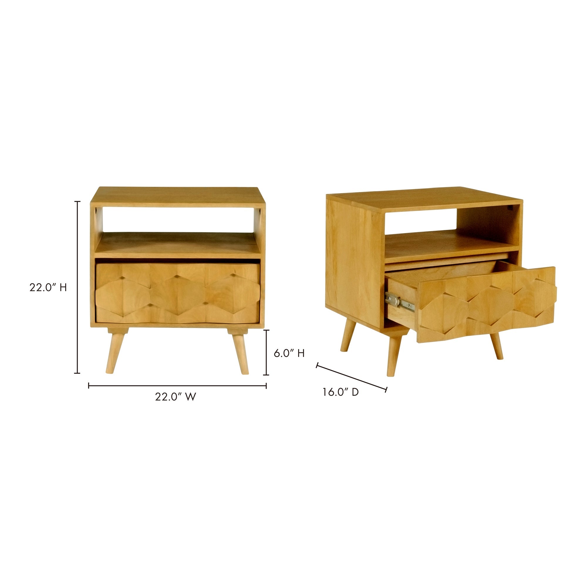 The O2 nightstand is a retro-inspired with a modern twist. Constructed with solid sheesham wood, this piece makes it resistant to major wear and tear. Its warm tone and intricate drawer front provides character and ample storage to your bedroom space.