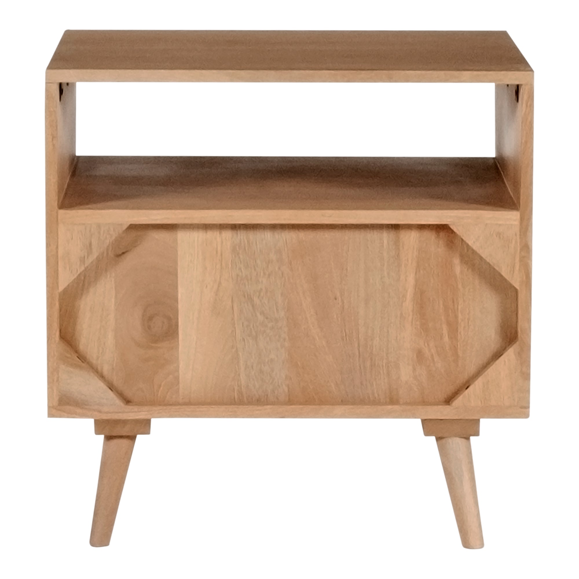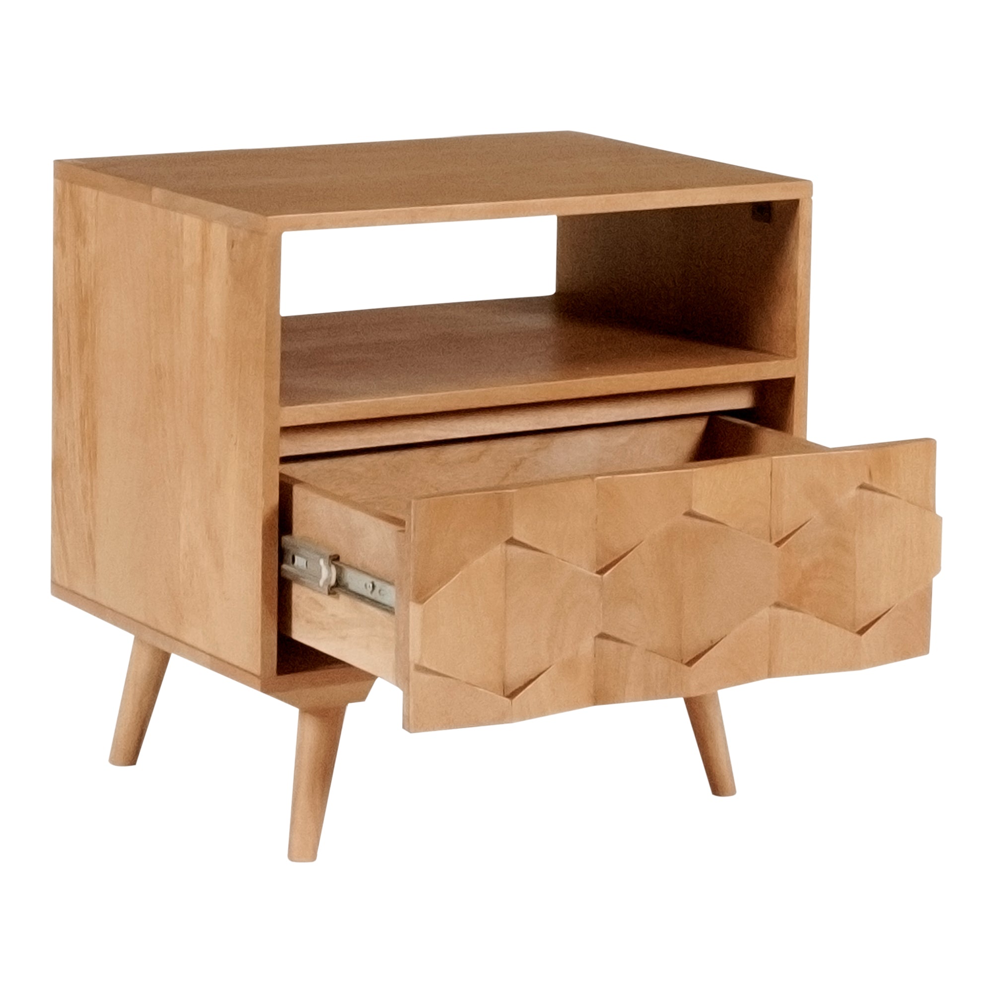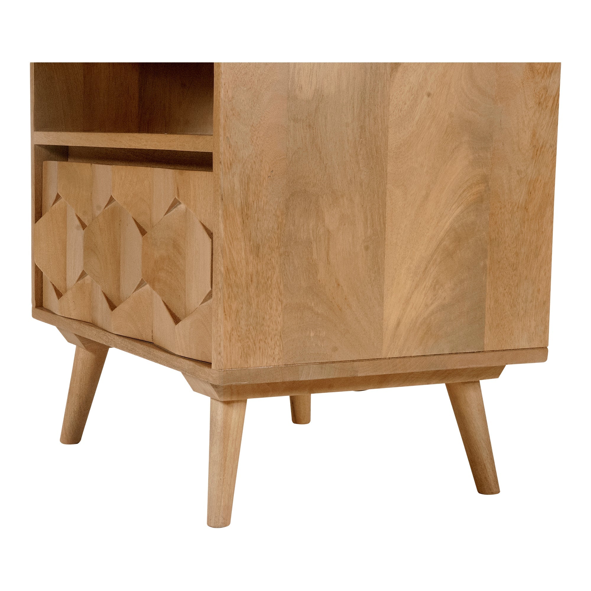The O2 nightstand is a retro-inspired with a modern twist. Constructed with solid sheesham wood, this piece makes it resistant to major wear and tear. Its warm tone and intricate drawer front provides character and ample storage to your bedroom space.