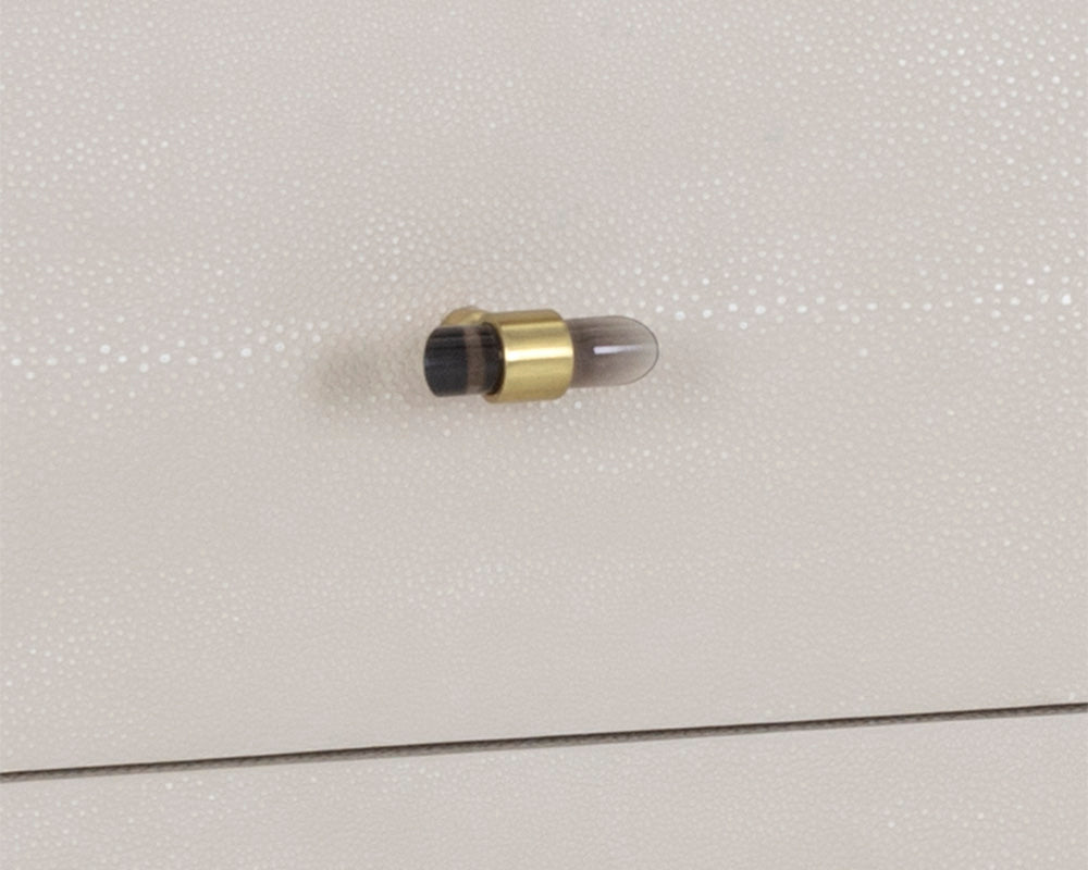 Boasting a professional and classic design, this magnificent desk is the ideal piece for productivity. Crafted from a wooden frame with a white ceruse oak veener top and features four drawers with oyster shagreen bonded leather coverings. Completed with antique brass iron handles and solid oak wood legs. As wood is an organic, porous material, these pieces will contain natural variation of texture and may also exhibit fine indentations and cracks. Wood pieces will also display a disparity of colour and grain, and visible knots and burls that add to the character of each piece. Handle with Care: This design has been crafted with bonded leather. Bonded leather is a blend of reconstituted leather and synthetic materials crafted to reflect the natural characteristics of leather; as such, colour variations, markings, wrinkles, grooves and light scratches are acceptable and appreciated characteristics. No two pieces are alike. Visit our Product Care page for more information on how to ensure the lasting beauty of this piece.
