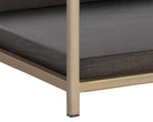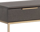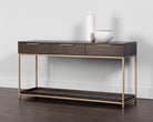 A modern console table designed to add a beautiful touch to living and lounge spaces. Crafted from charcoal grey oak wood veneer with three drawers and shelf for added storage. Brushed gold iron hardware completes the look. Can be paired with matching coffee and dining tables.