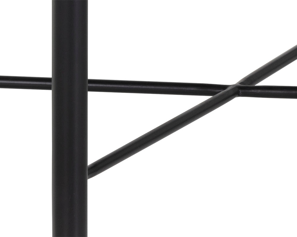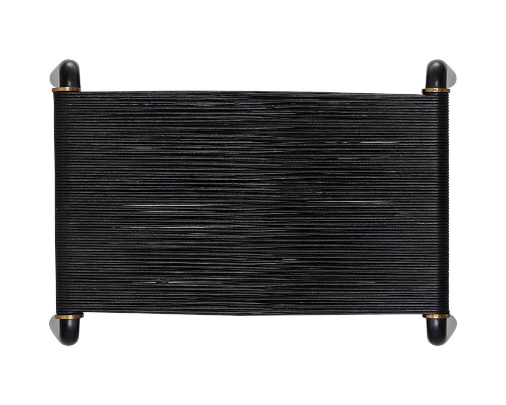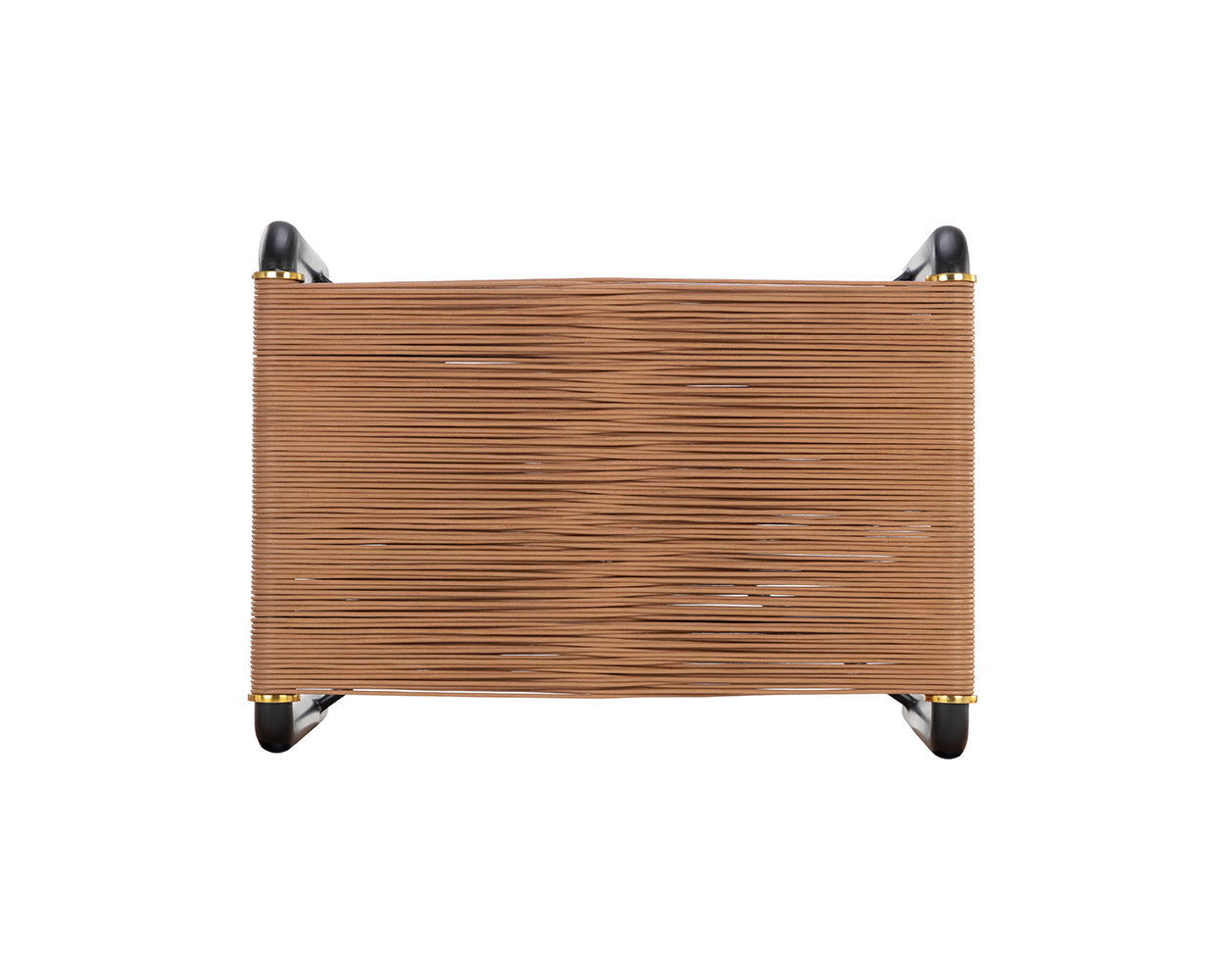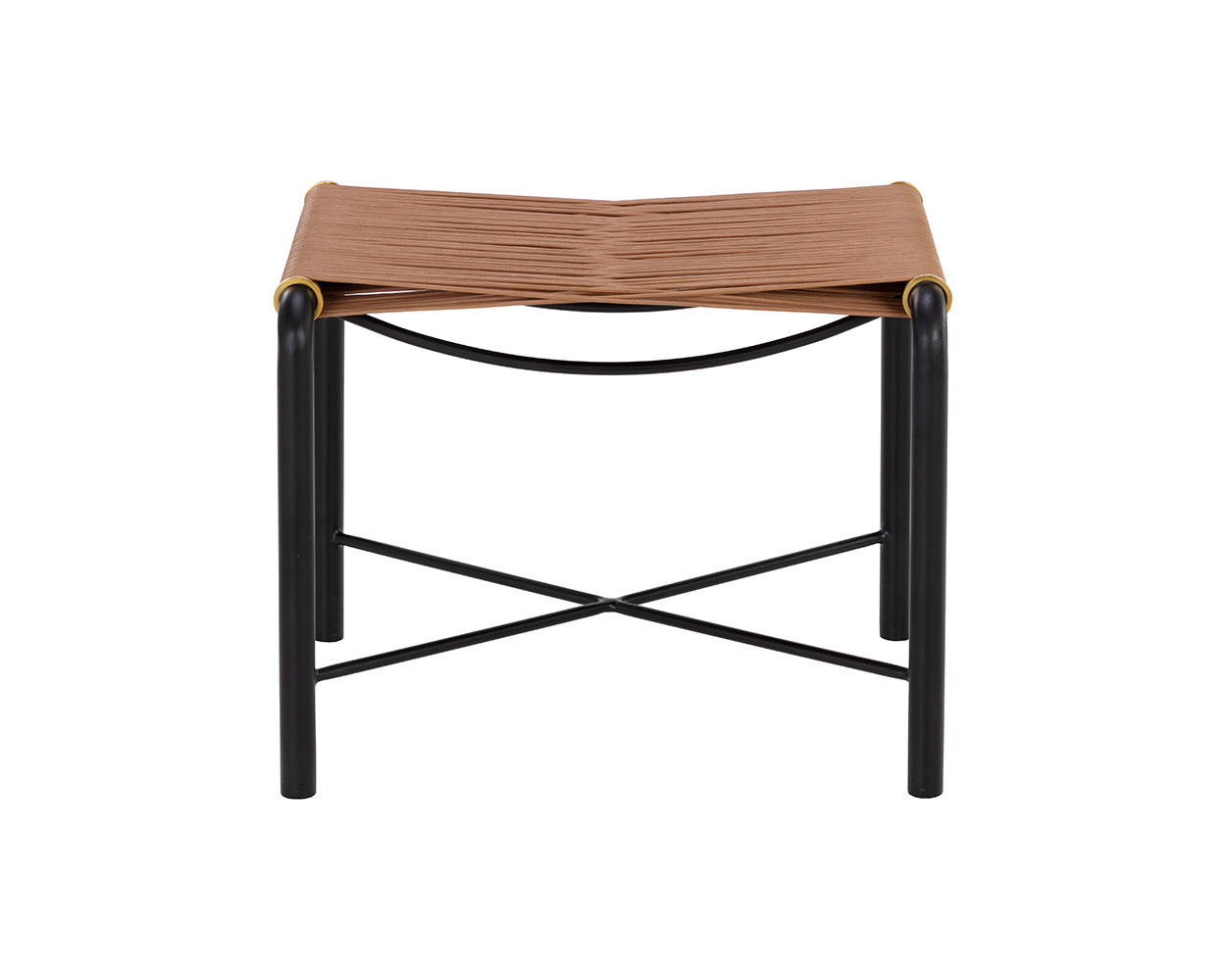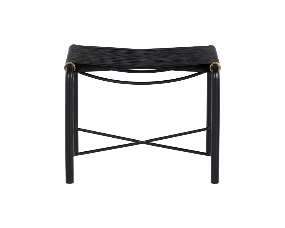 An intriguing stool that is designed with attention to detail. Features a black leather cord seat with a black steel frame. Powder coated gold accents complete the look. A stunning addition to foyer, living and bedroom spaces. Made in India. Also available in tan. With refined craftsmanship, this design was brought to life by skilled local artisans. By nature, these materials develop unique imperfections such as fissures, markings and colour variations for a truly one-of-a-kind piece.