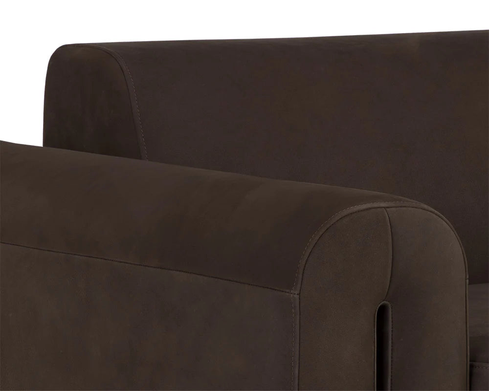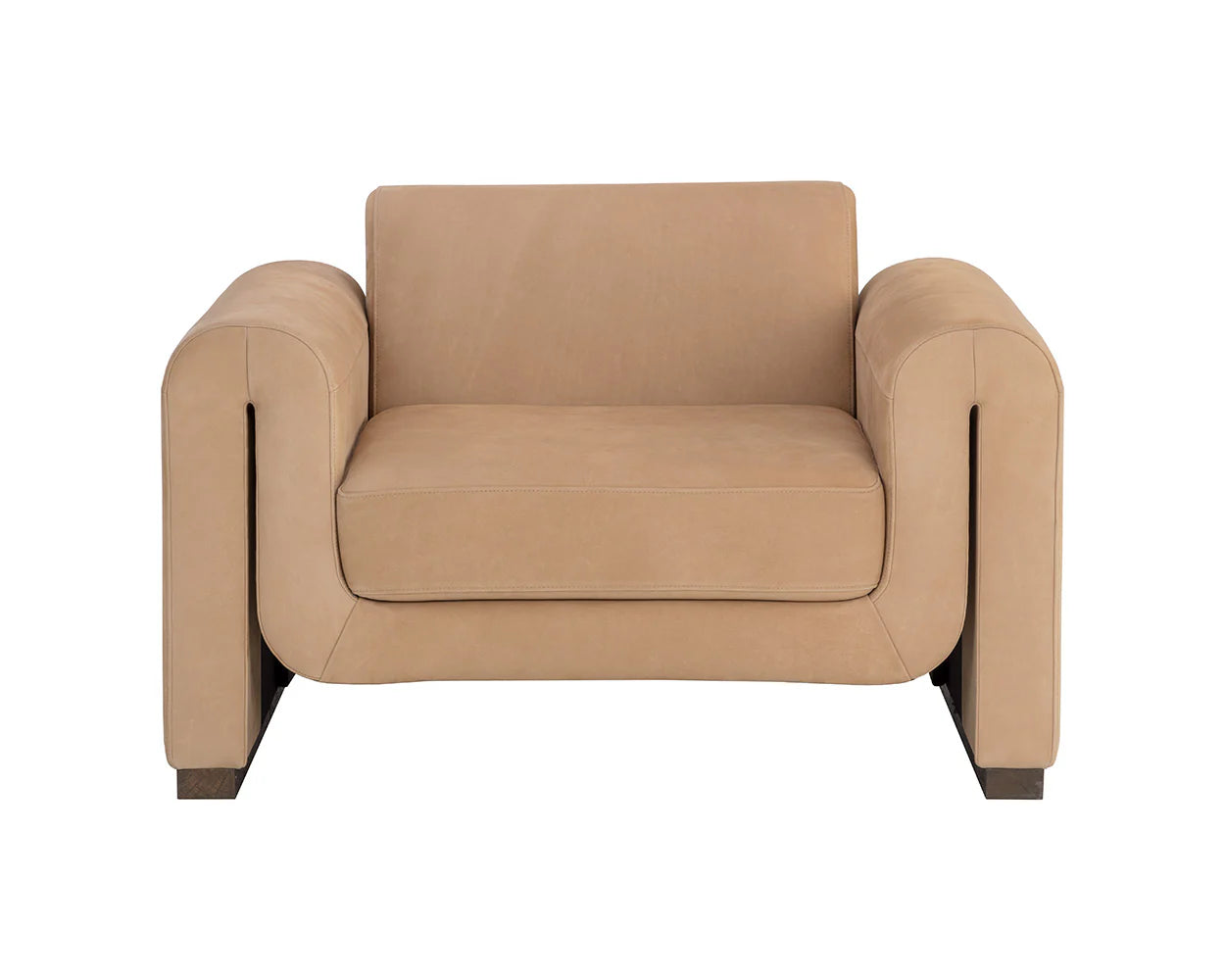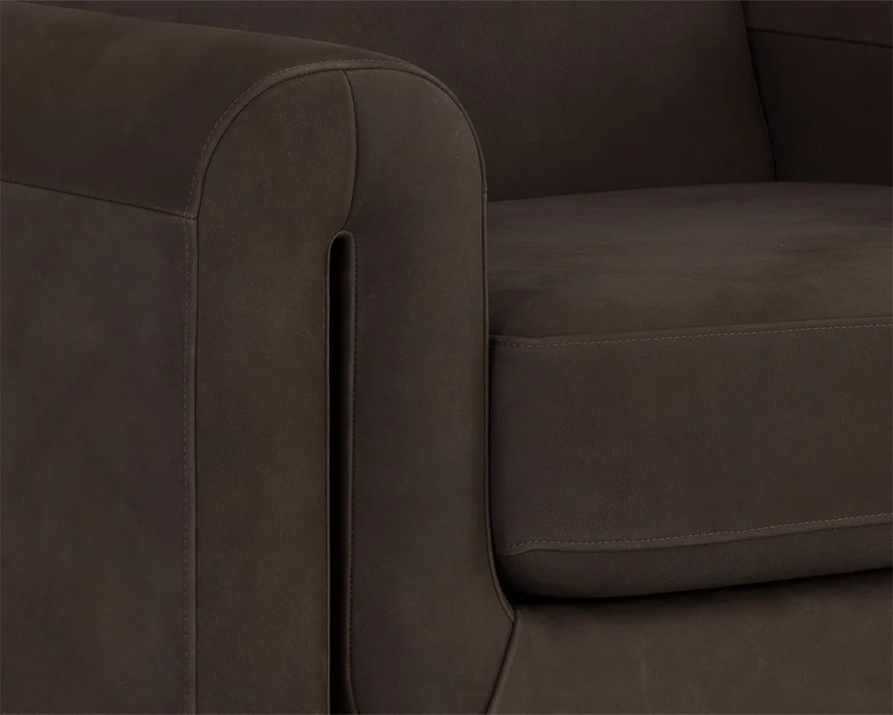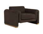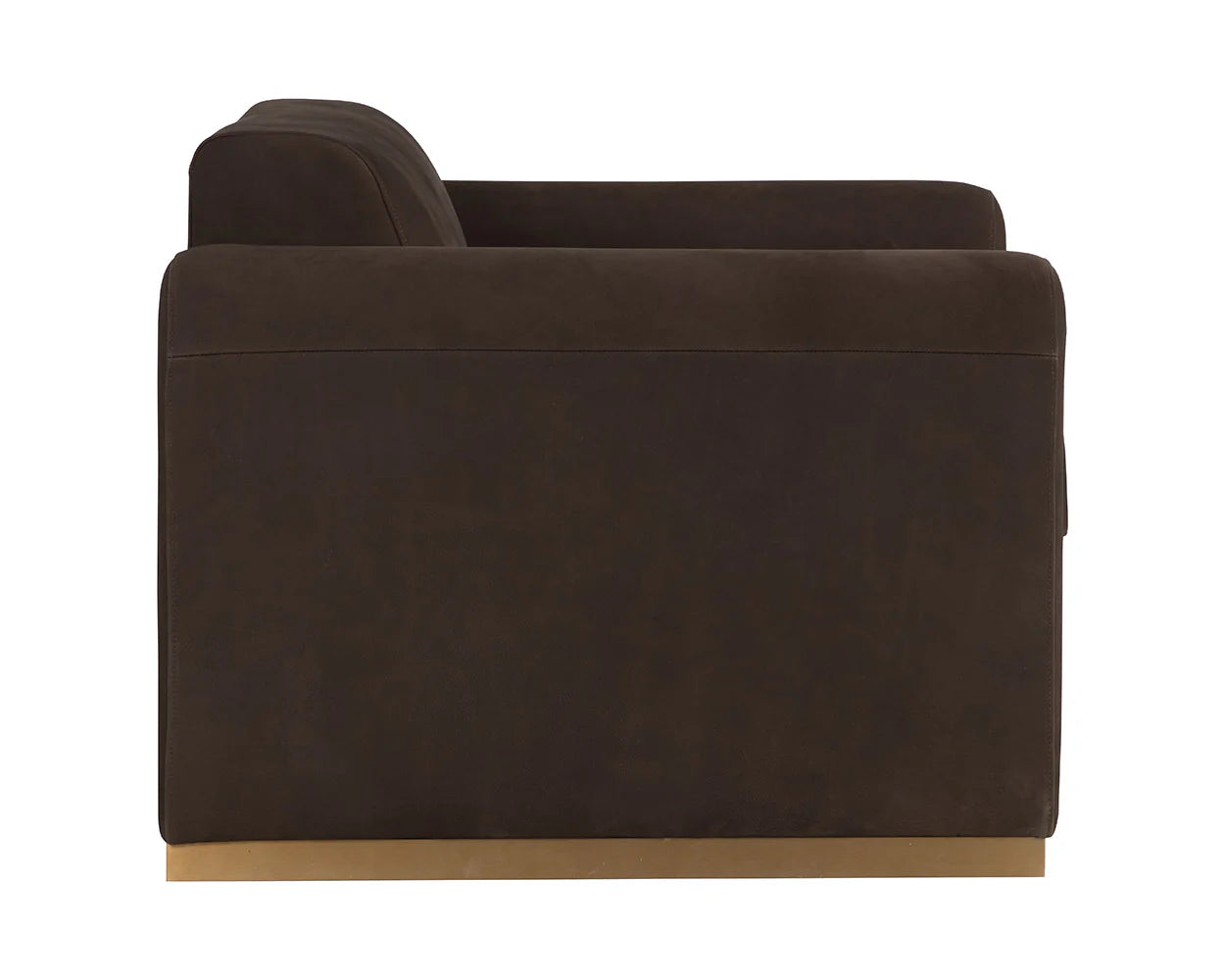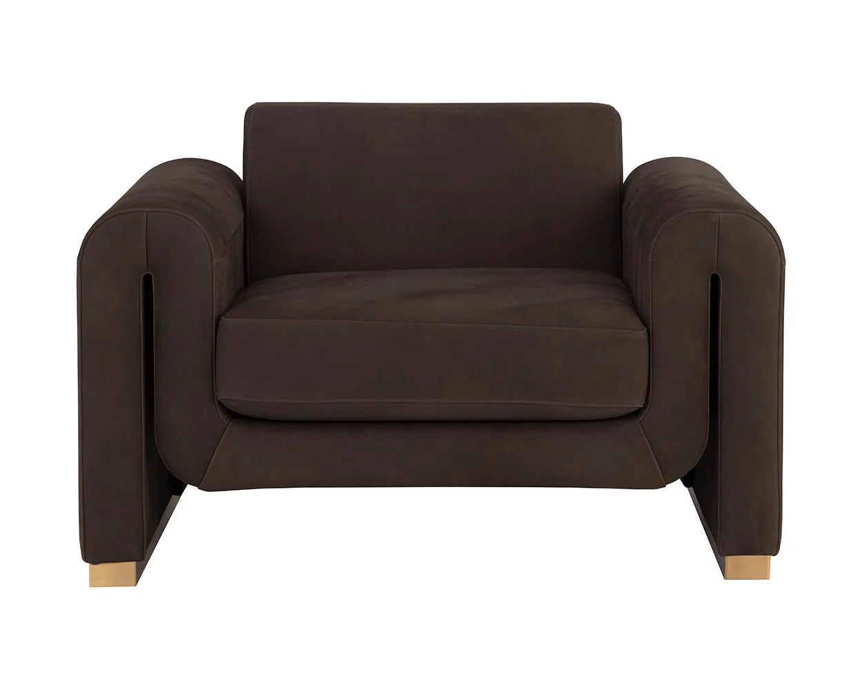 Cozy and luxuriously smooth, the Romer Armchair brings a sense of warmth and comfort to any living area. Expertly designed with sculpted curves that lend a modern aesthetic. Upholstered in nubuck cocoa leather with metal accents on the legs. Handle with Care: This design has been crafted with 100% leather. Leather is a natural material; as such, colour variations, markings, wrinkles, grooves and light scratches are acceptable and appreciated characteristics. No two pieces are alike. Visit our Product Care page for more information on how to ensure the lasting beauty of this piece.