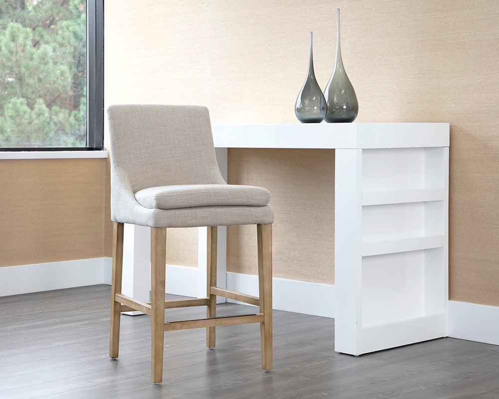 With a beautiful uniform design, this classic counter stool guarantees a comfortable seating experience. Stocked in effie flax fabric and complemented with light brown solid birch wood legs.