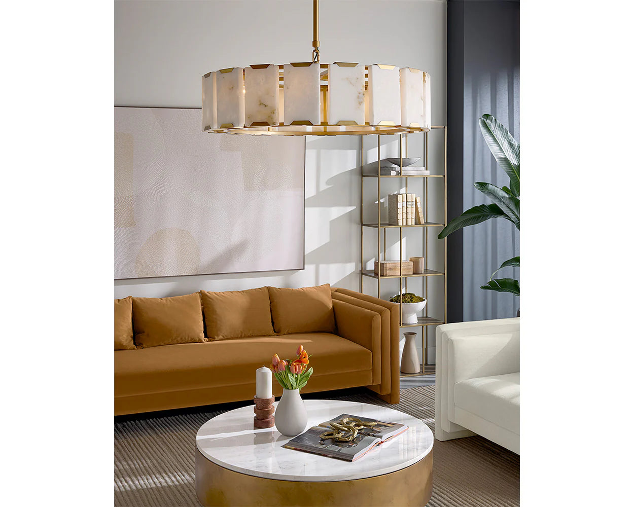 The Rovira Chandelier is an artful examination of the beauty of natural stone. Thick, hand carved panels of alabaster imported from Spain are held between a brushed gold iron circular frame for a dazzling design. The translucent nature of alabaster allows light to flow through, emitting a soft ambient glow. When lit, this design truly comes to life. As alabaster is a natural material, unique veining and colour variations are all characteristics that add to the uniqueness and beauty of each piece.