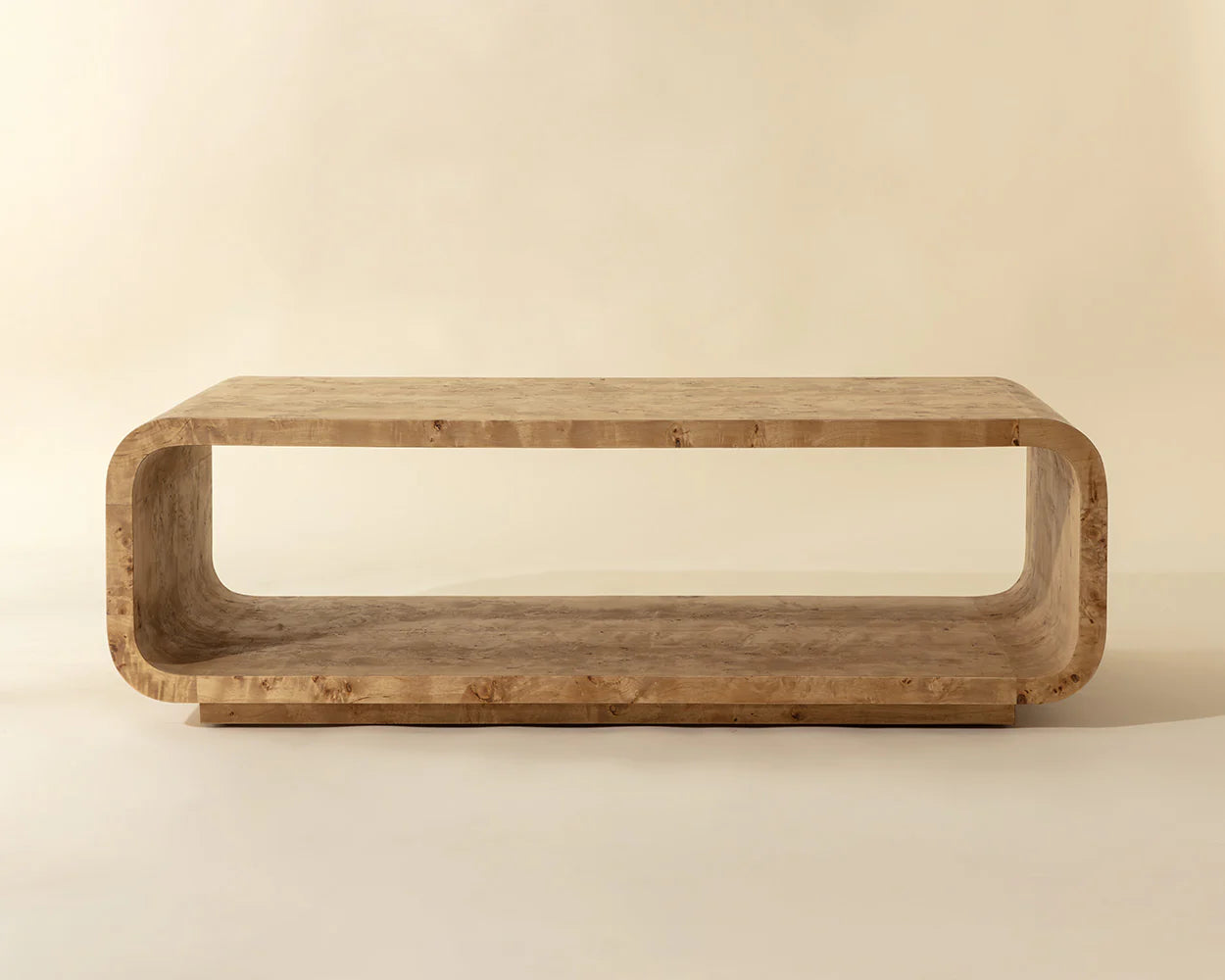 The Rowena Coffee Table is characterized by its smooth yet sculpted lines that are characteristic of modern design. Sleek and stylish, this burl veneer coffee table offers unique patterns that are inherent in burl veneer, providing an elevated shape and style.