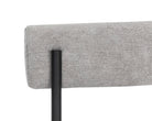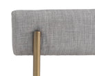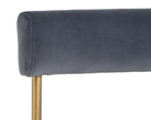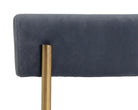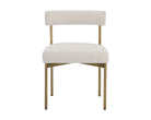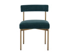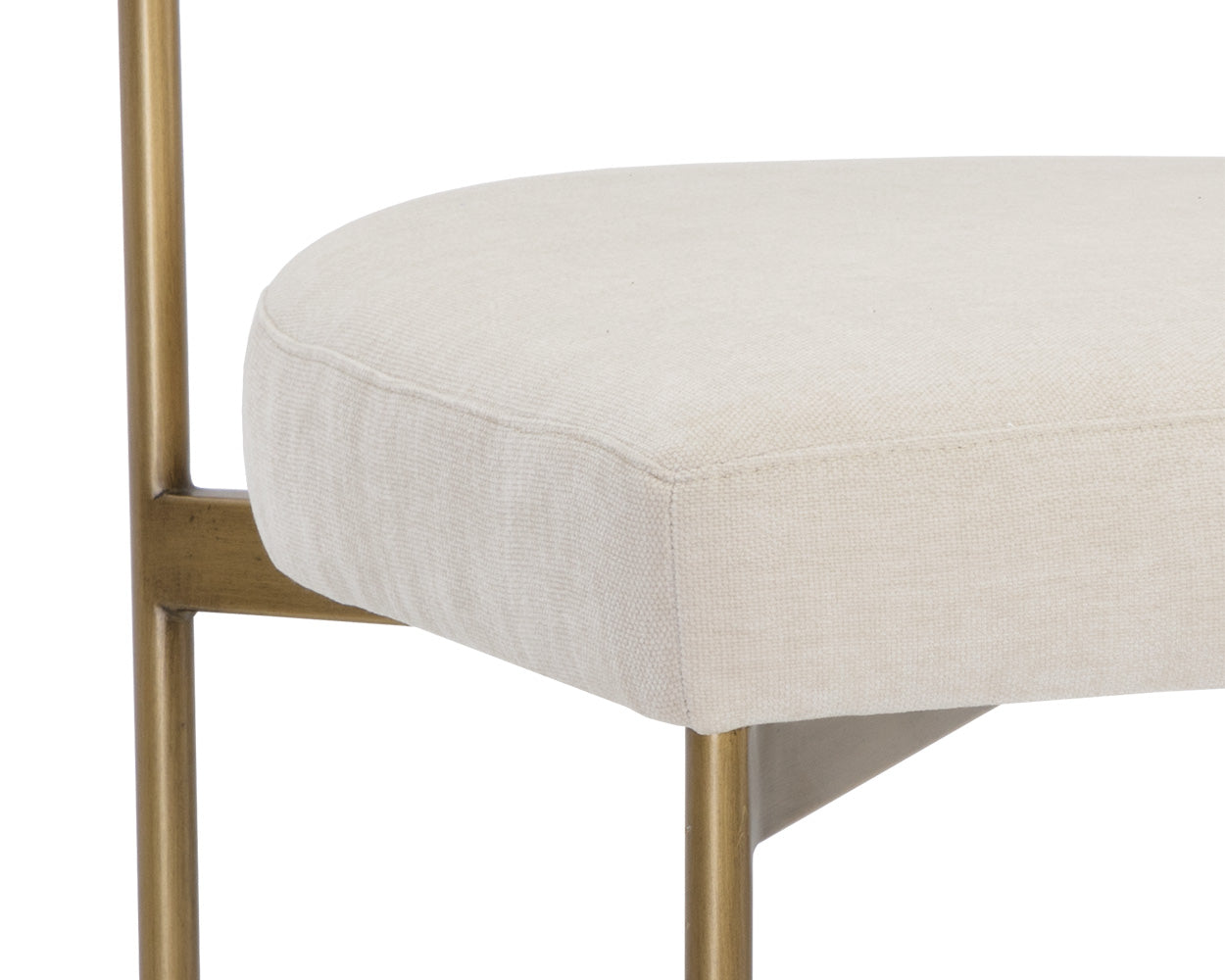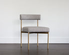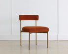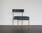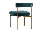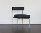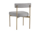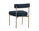 Exude modern style with this open back dining chair. Stocked in arena cement, arena navy, velvet slate, danny rust, danny ivory and danny teal fabric with an antique brass steel frame. Also available in club polo stone fabric with a black steel base.
