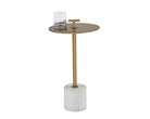 This sculptural side table is a beauty from all angles. Features a burnished brass top and handle with a white marble base. A perfect addition for small spaces. As marble is a natural material, unique veining, pitting, fissures, micro-cracks and colour variations are all characteristics that add to the uniqueness and beauty of each piece.