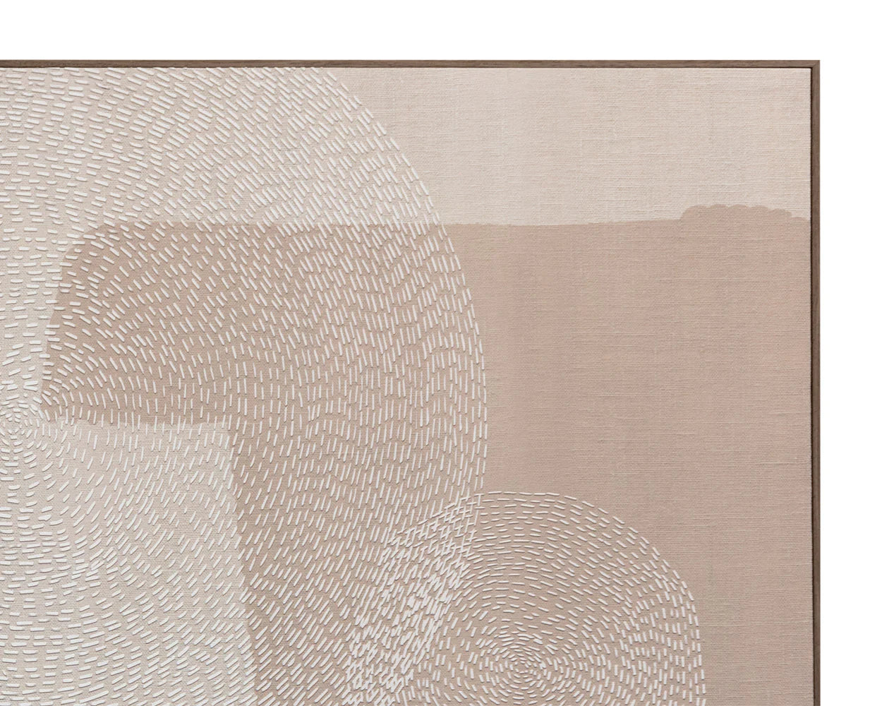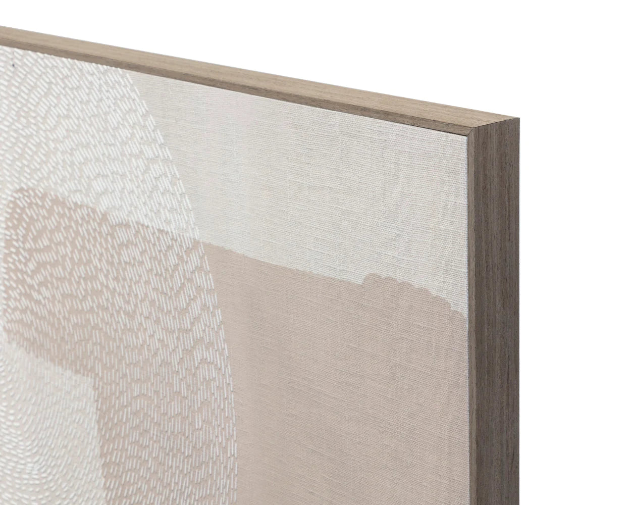 A neutral palette of earthy pinks and beiges in organic shapes evoke a sense of intrigue in this contemporary art piece. Printed on canvas with white textured detailing to add definition to the artwork. Features a light brown wood floater frame.