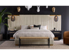 The Tarrant Bed is designed to make a statement. Featuring a large extended headboard in monument oatmeal fabric on brushed gold steel hardware. Vertical channel tufting on the front of the base and headboard adds visual intrigue to complete the piece. No box spring is required and slats are included.